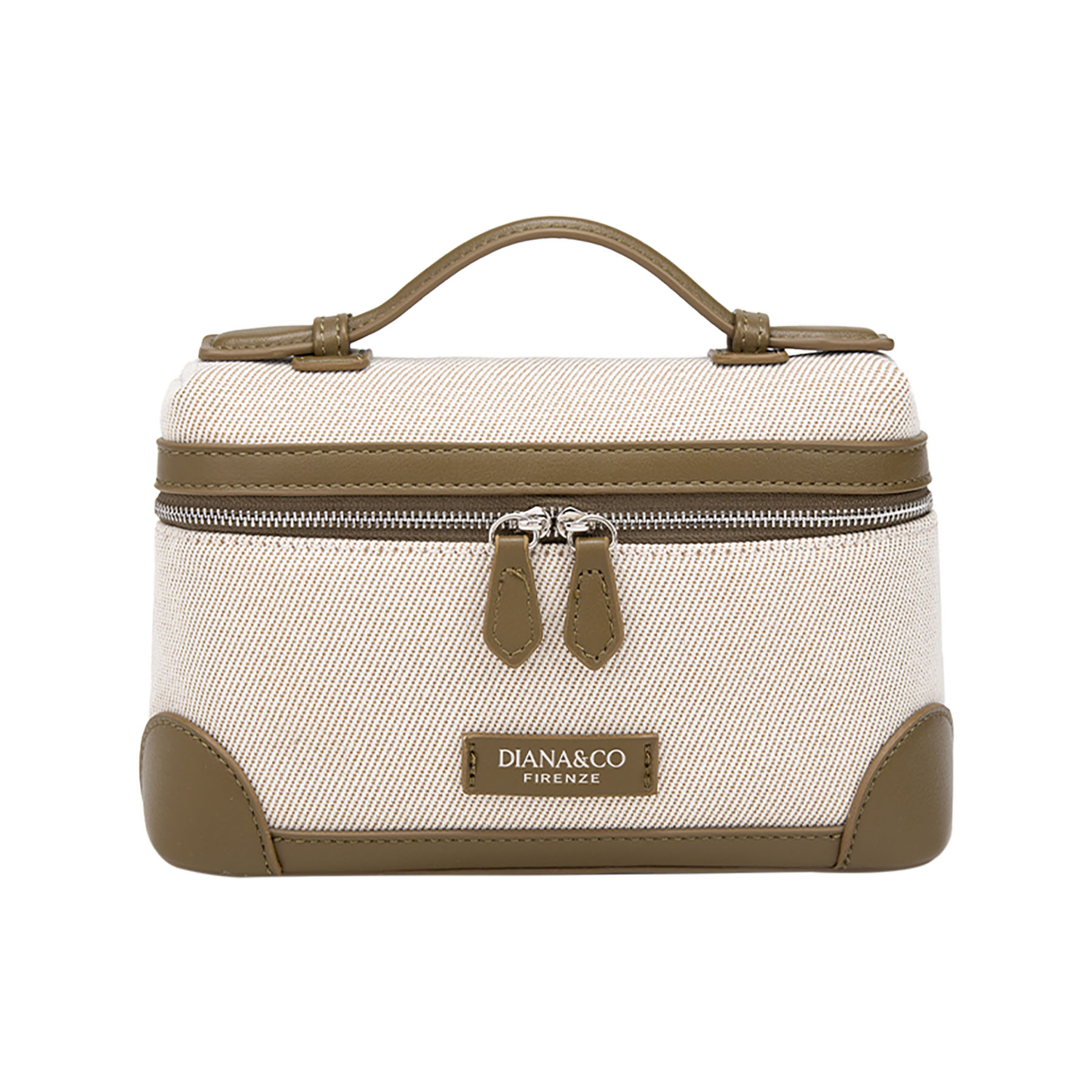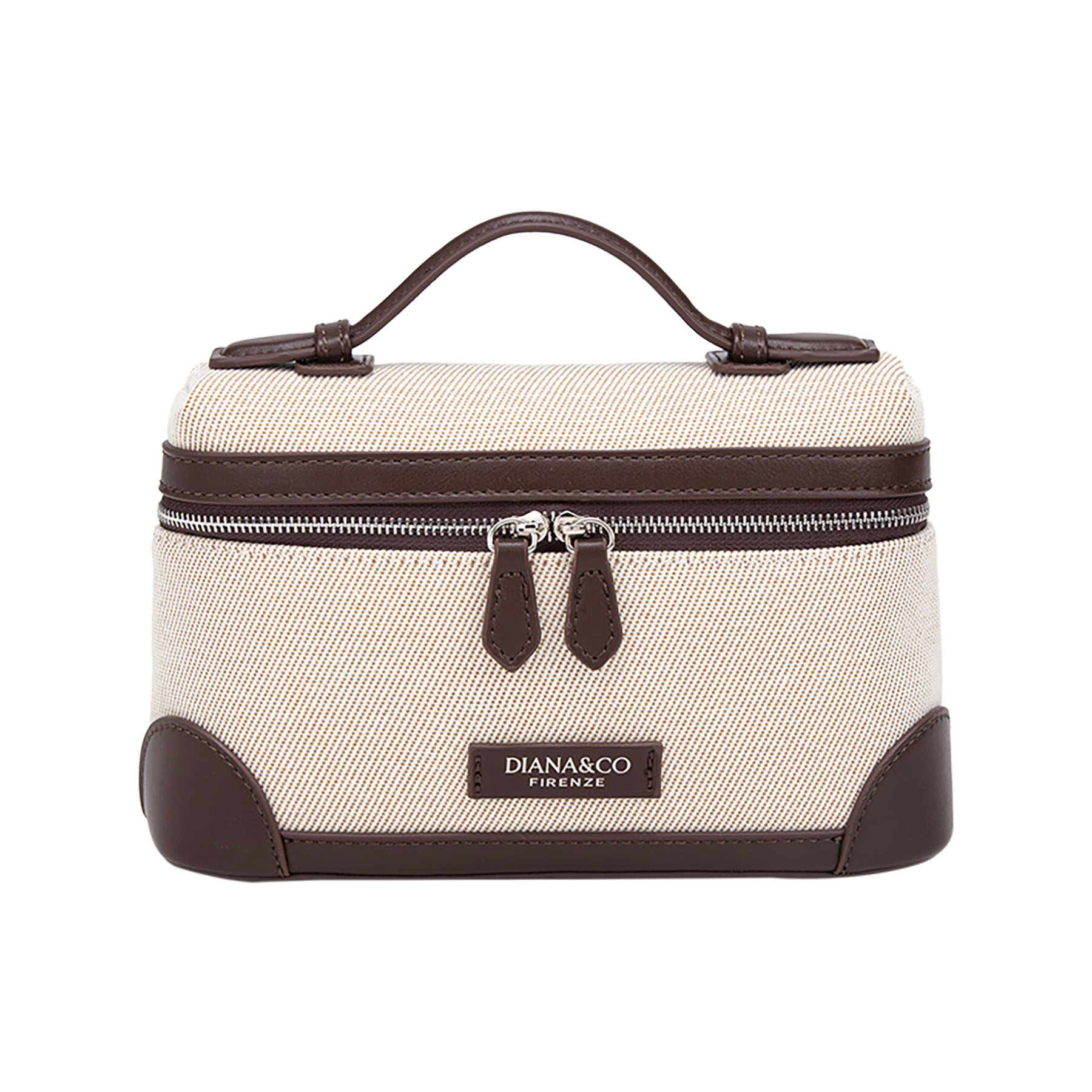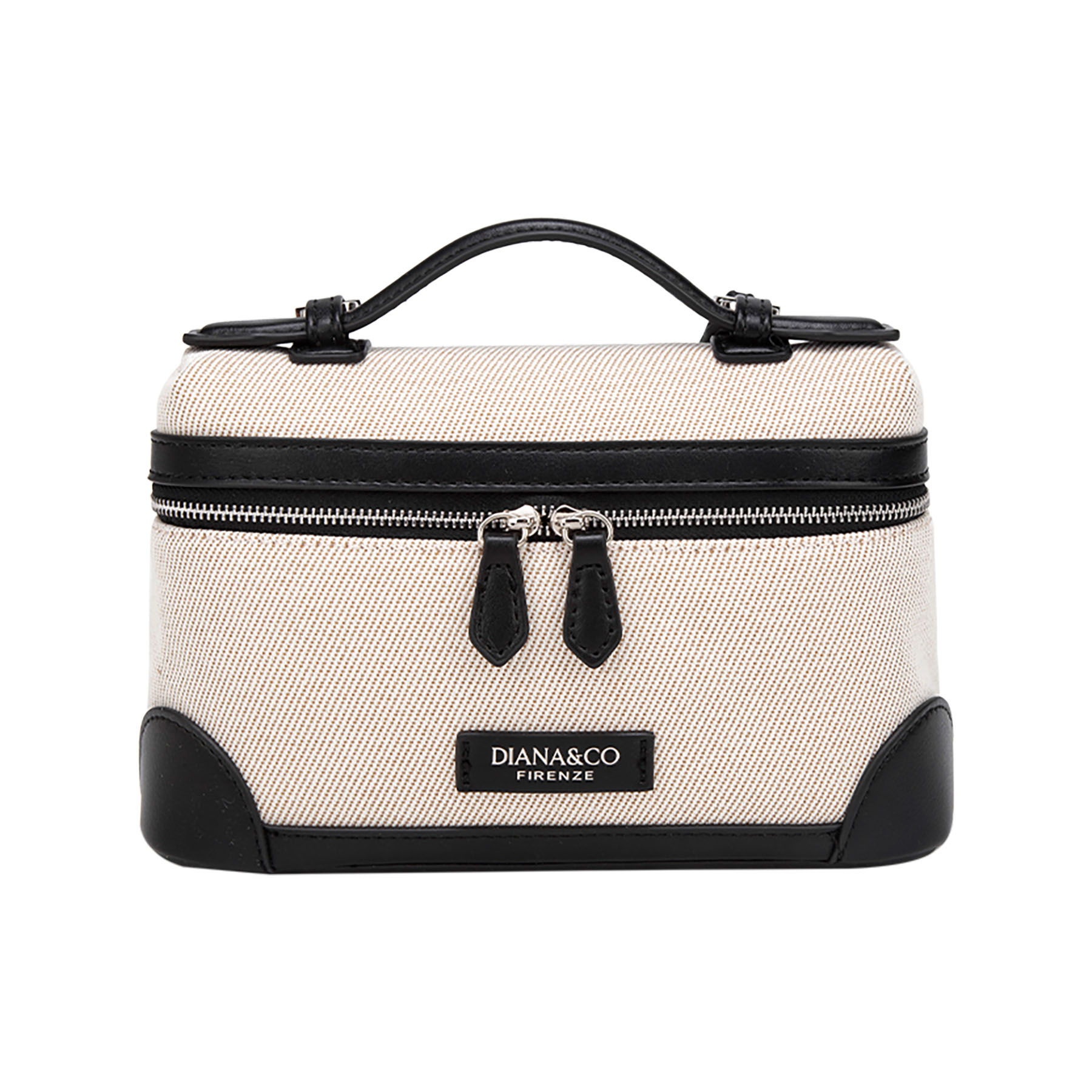Elegante beauty case in canvas similpelle. Dotato di manico superiore e doppia zip, unisce design classico e praticità per custodire i tuoi accessori con stile.