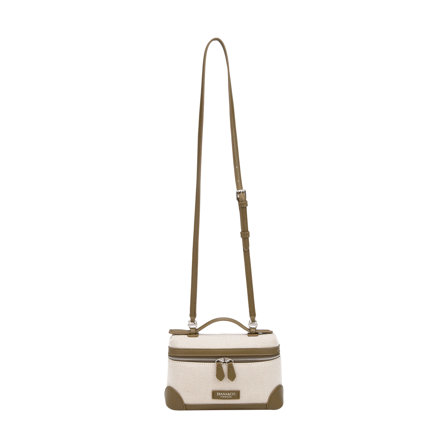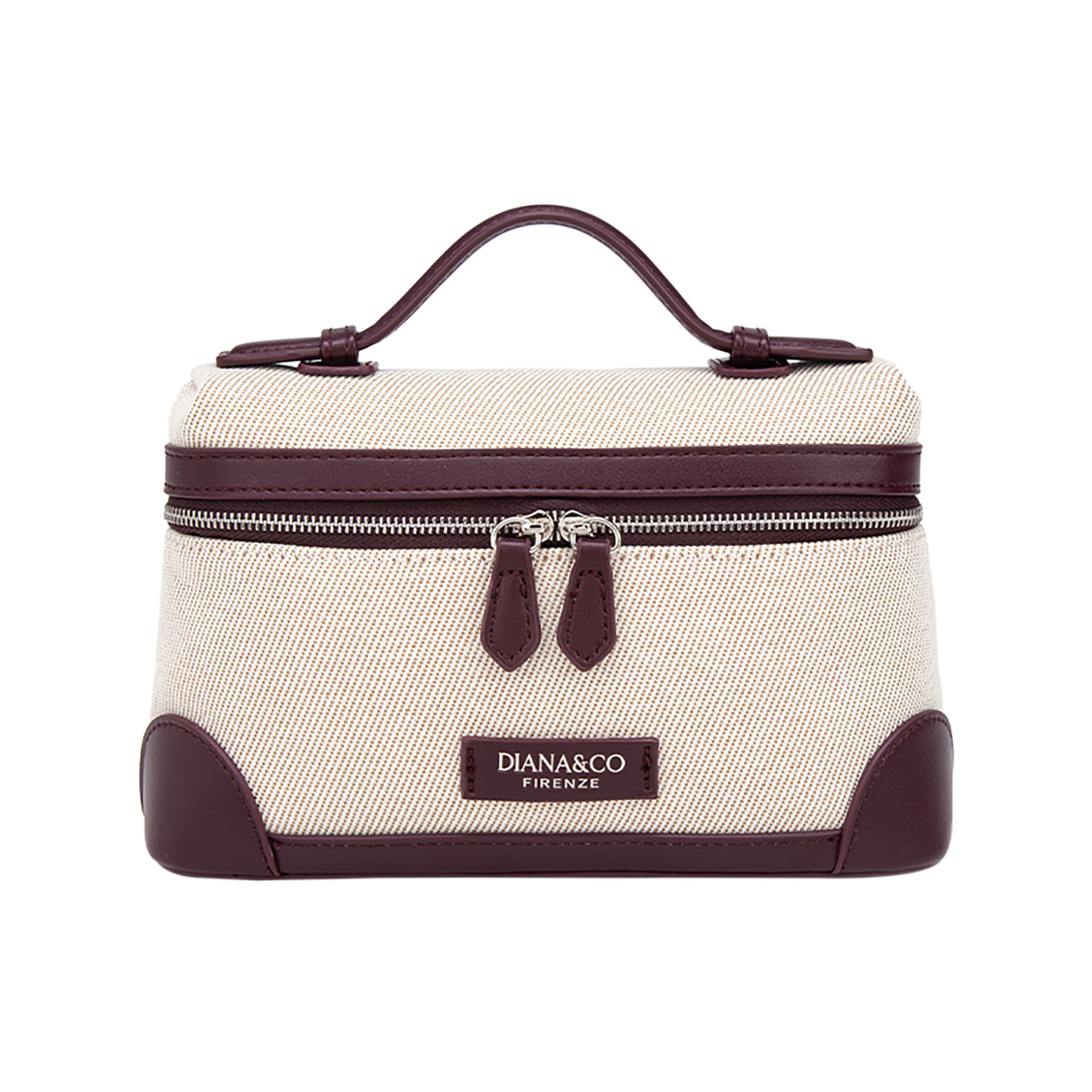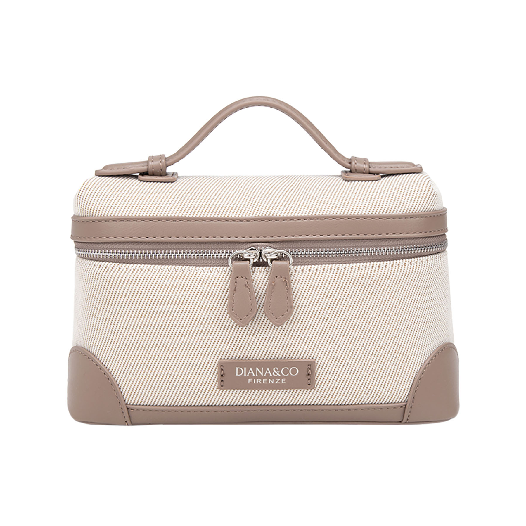 Elegante beauty case in canvas similpelle. Dotato di manico superiore e doppia zip, unisce design classico e praticità per custodire i tuoi accessori con stile.