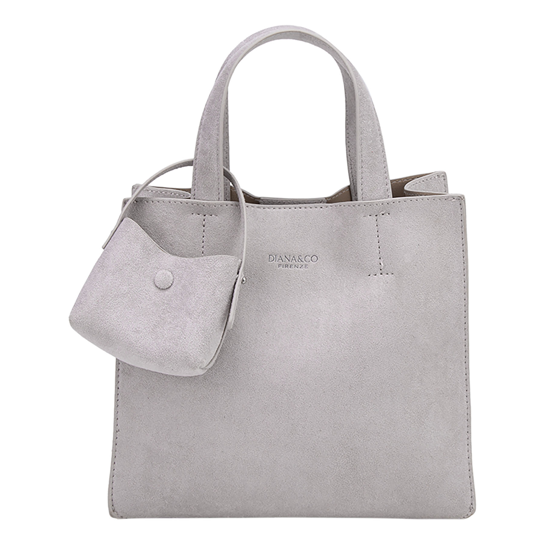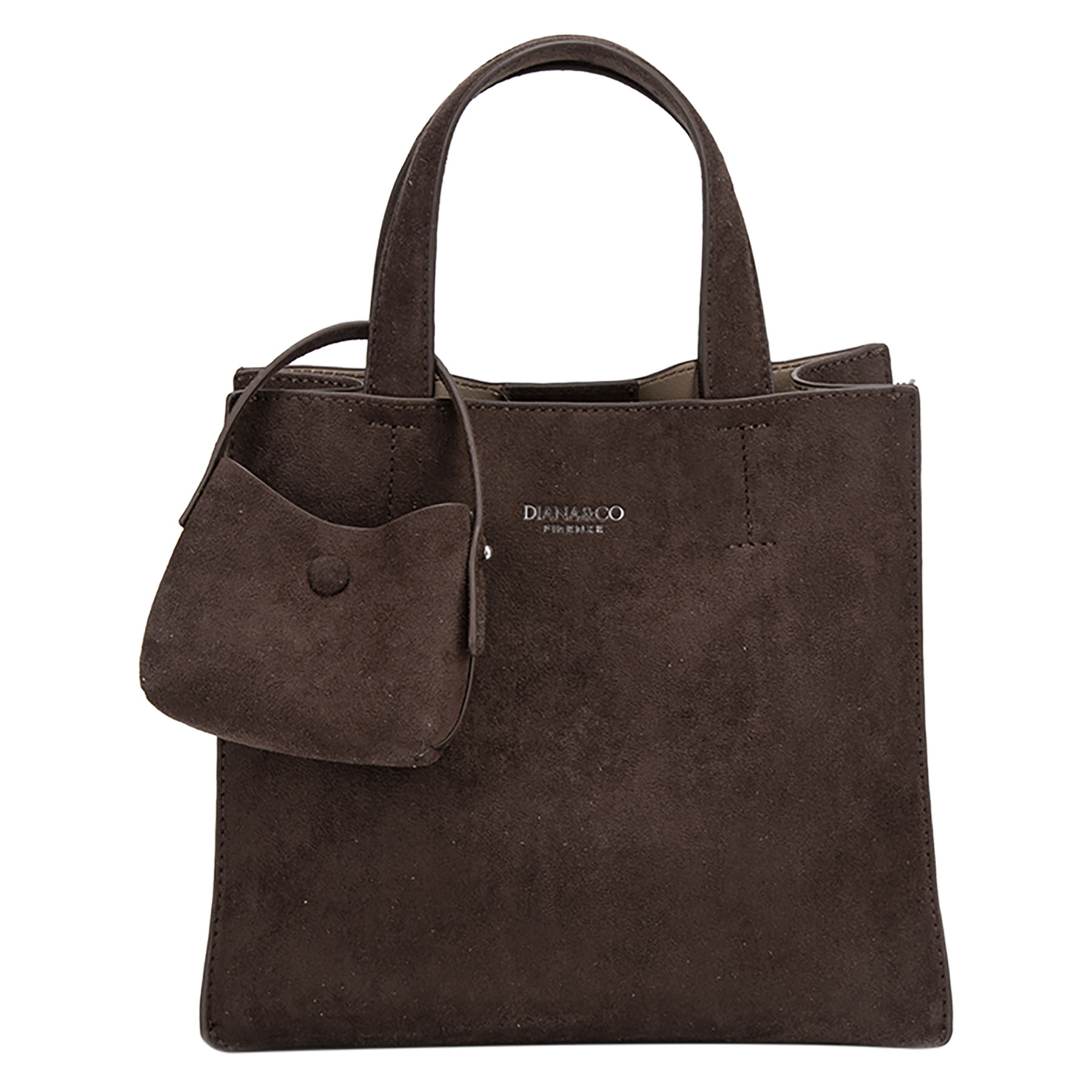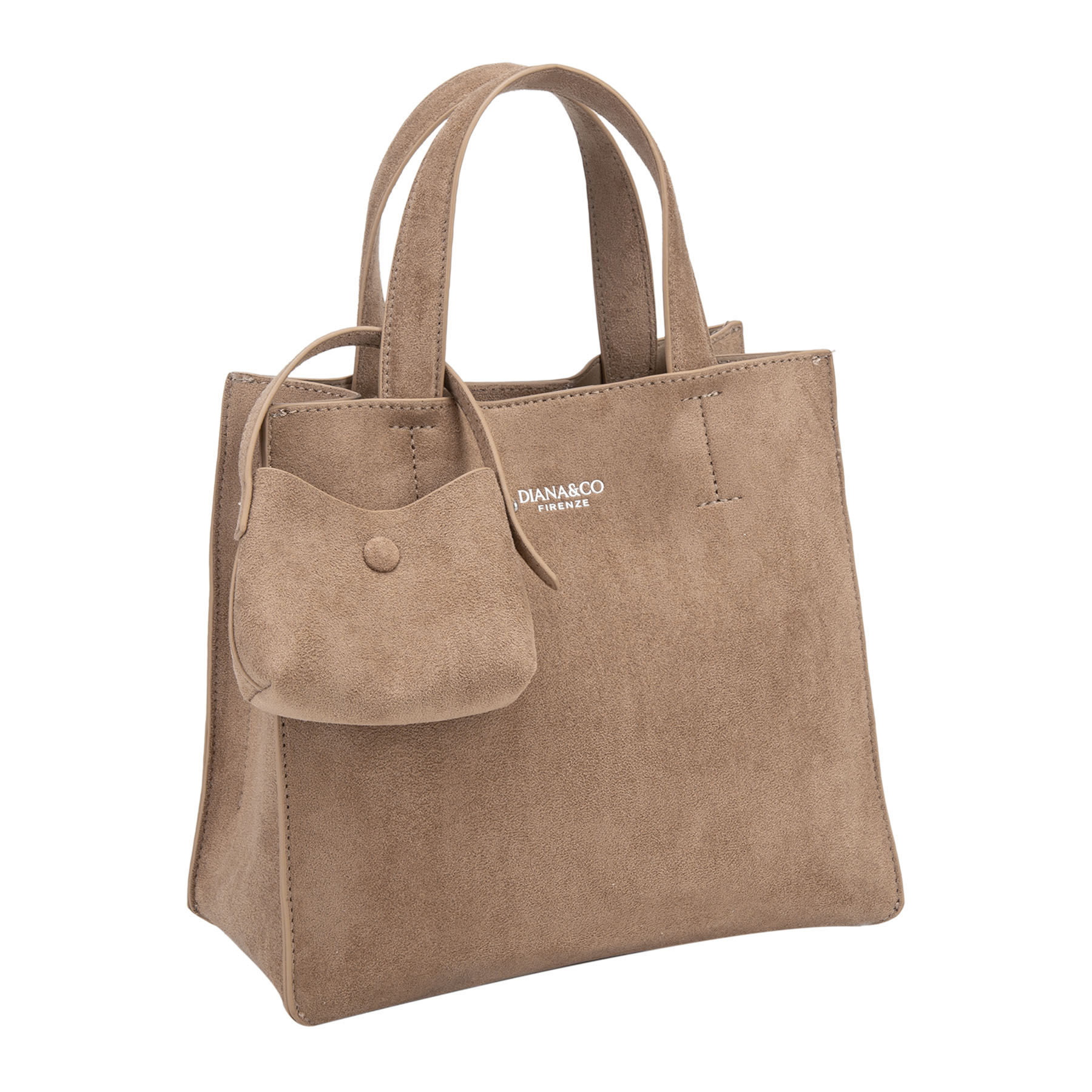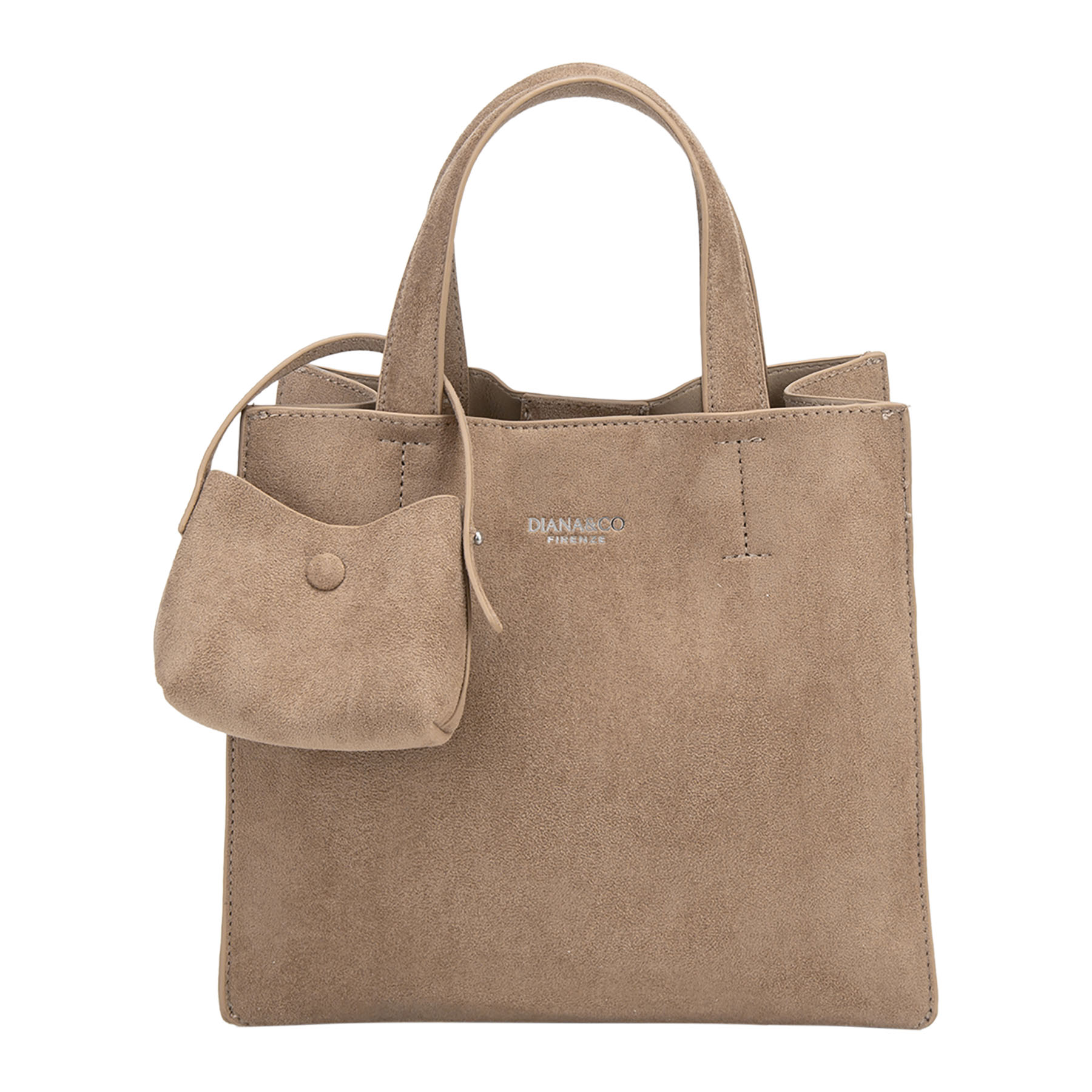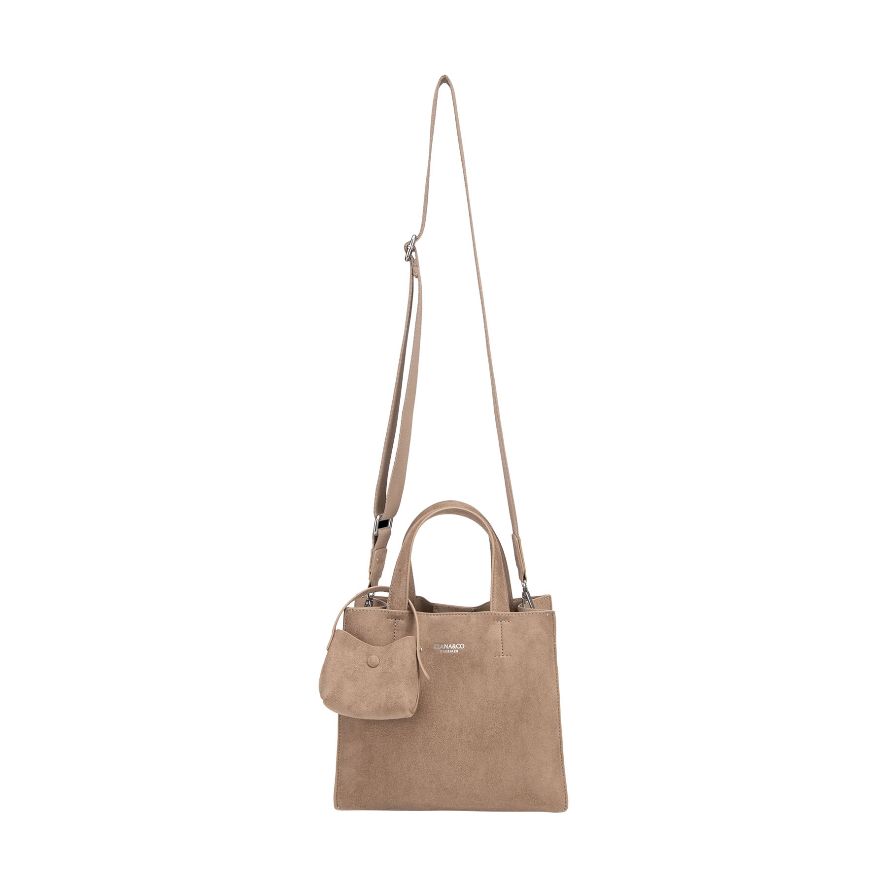 Elegante borsa a secchiello strutturata in effetto camoscio. Presenta un logo stampato sul davanti, cinturino a spalla coordinato e include una piccola pochette rimovibile coordinata in camoscio.