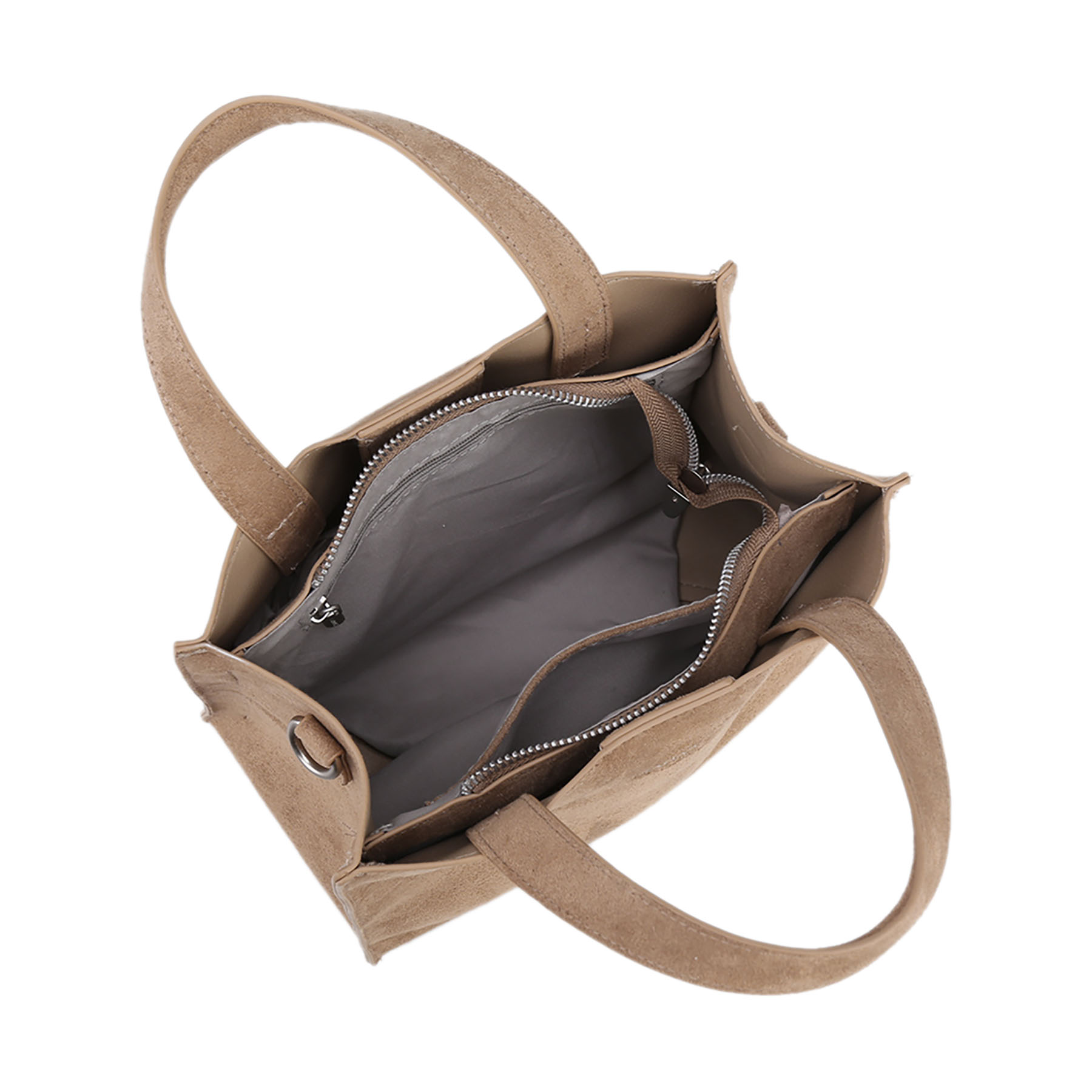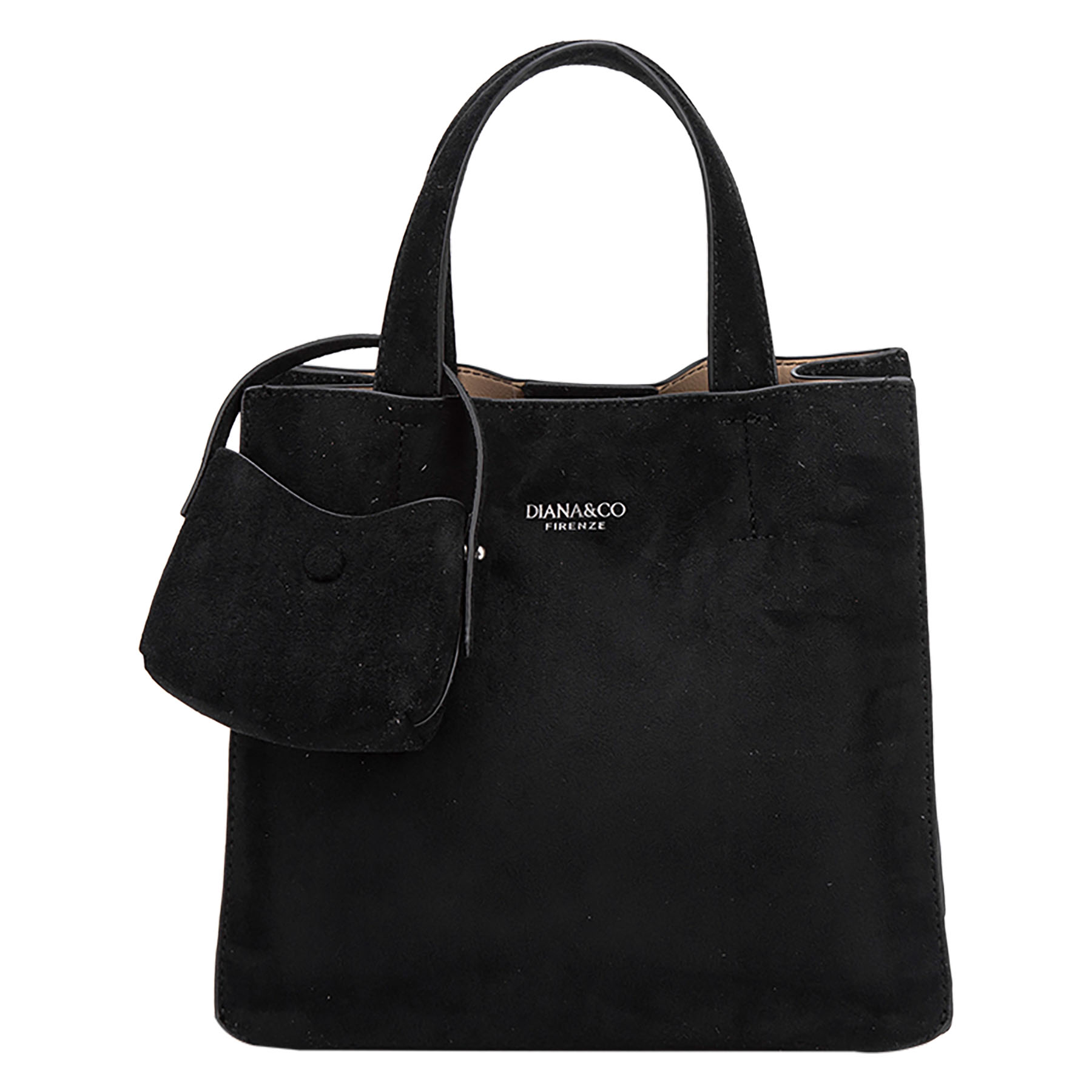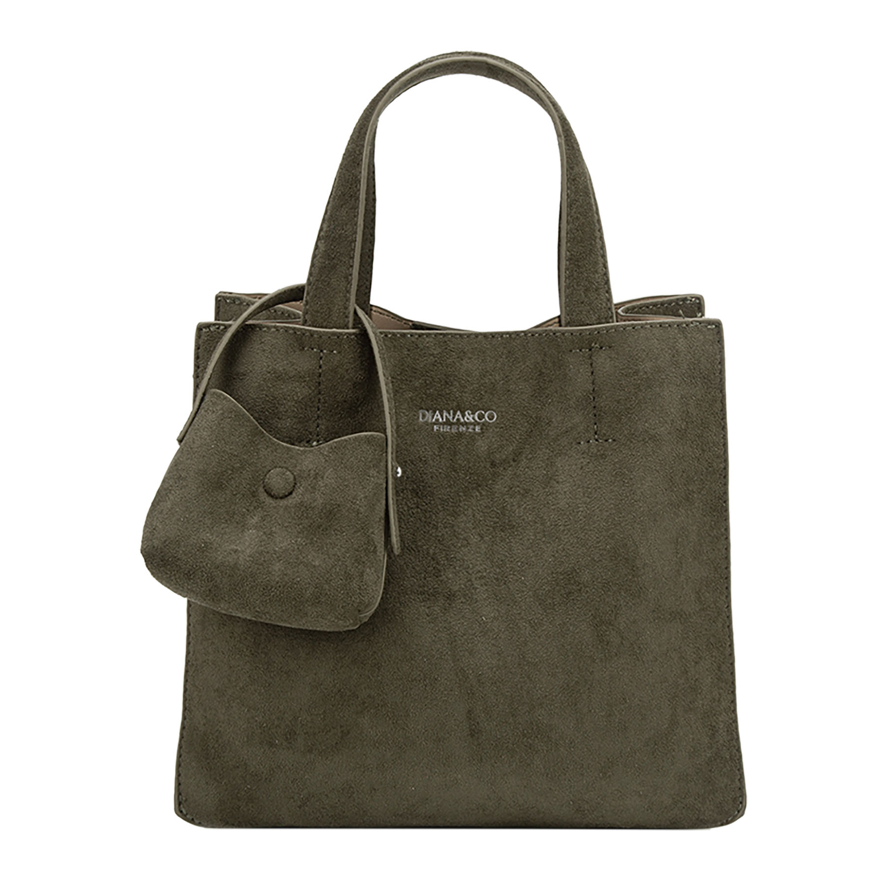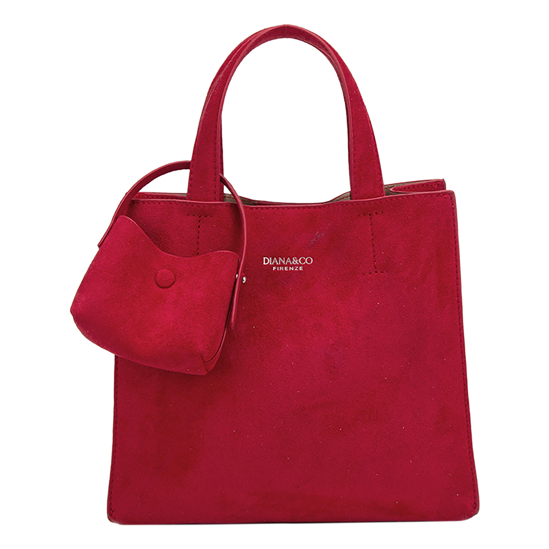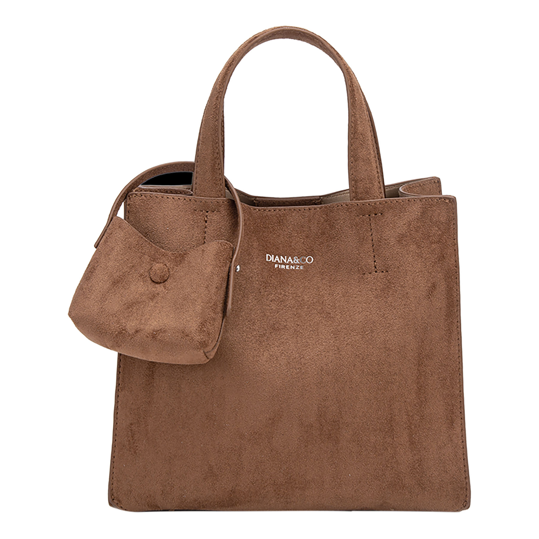 Elegante borsa a secchiello strutturata in effetto camoscio. Presenta un logo stampato sul davanti, cinturino a spalla coordinato e include una piccola pochette rimovibile coordinata in camoscio.