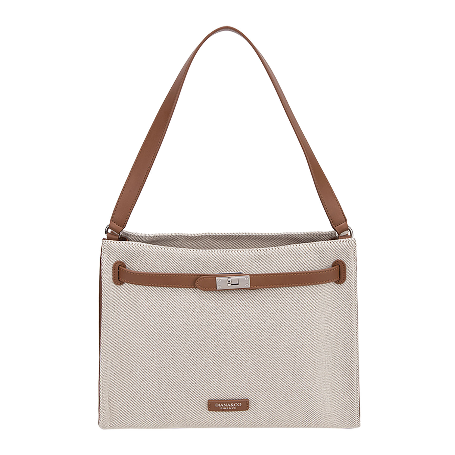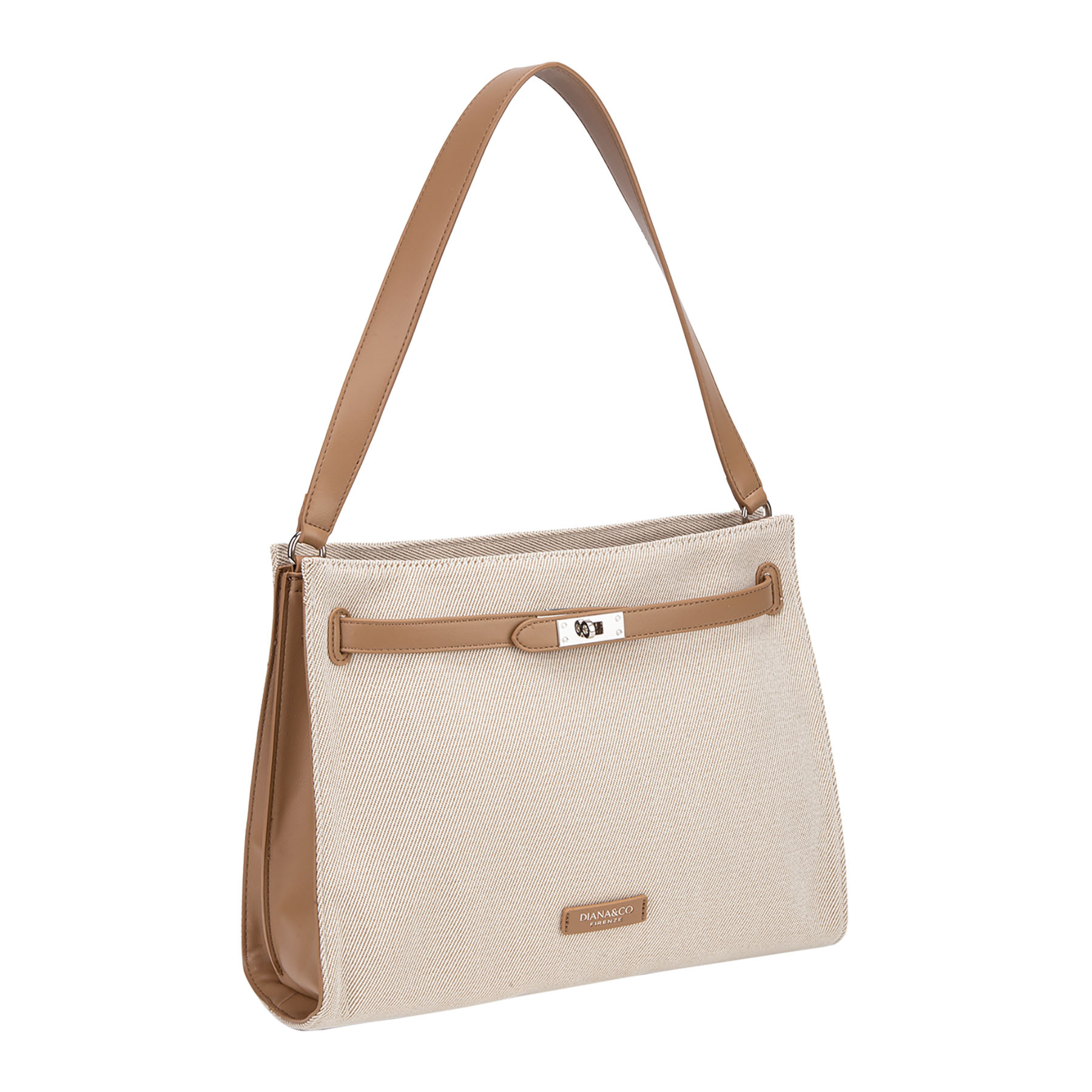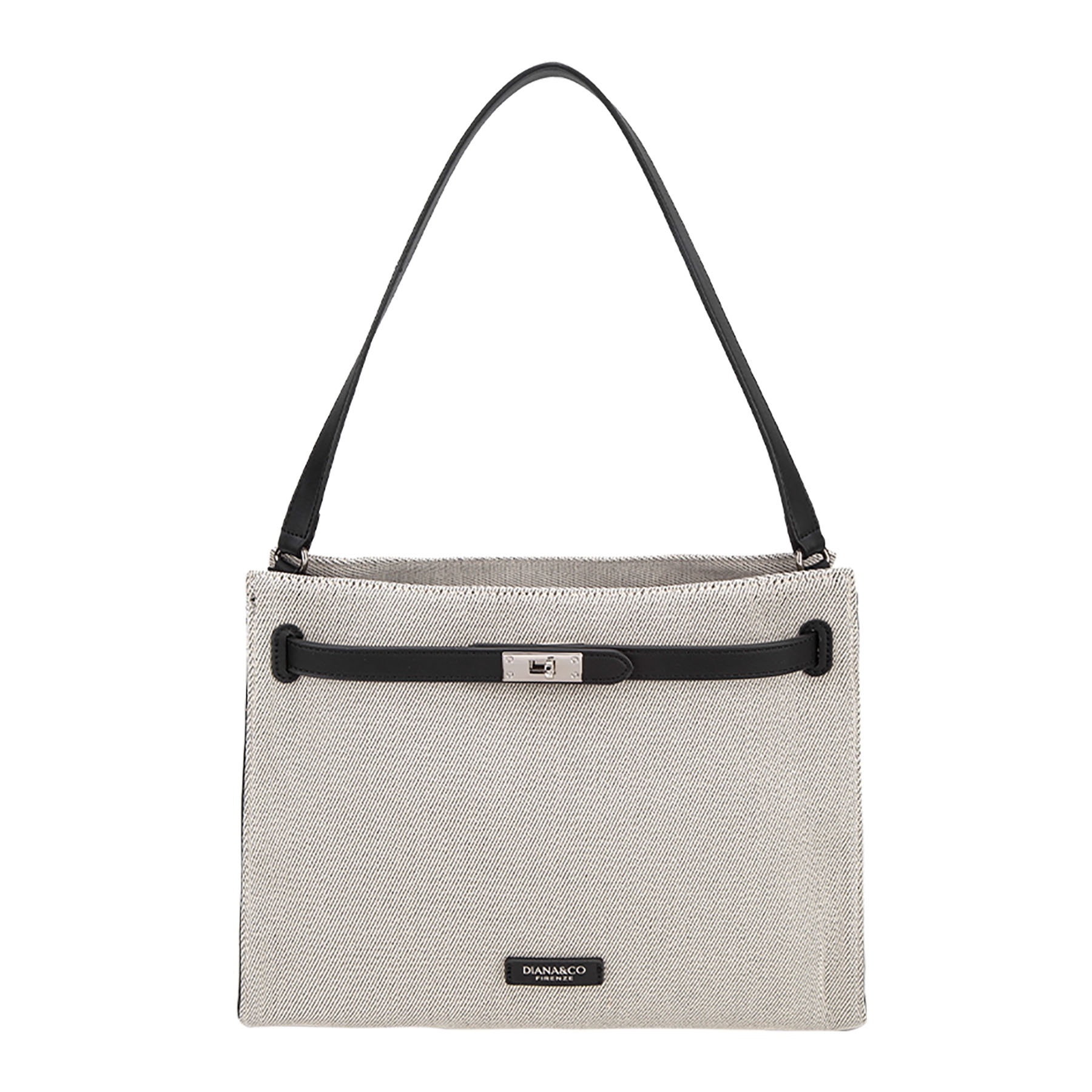 Borsa a spalla dal design raffinato fonde la la tela chiara con eleganti finiture in ecopelle. Il modello è caratterizzato da un sottile cinturino frontale con girello e da un manico piatto coordinato, ideale per una portabilità confortevole. Una silhouette strutturata e intramontabile che interpreta con stile la funzionalità quotidiana.