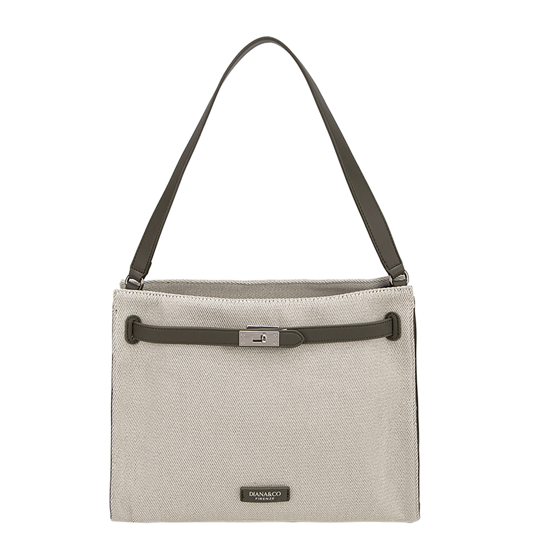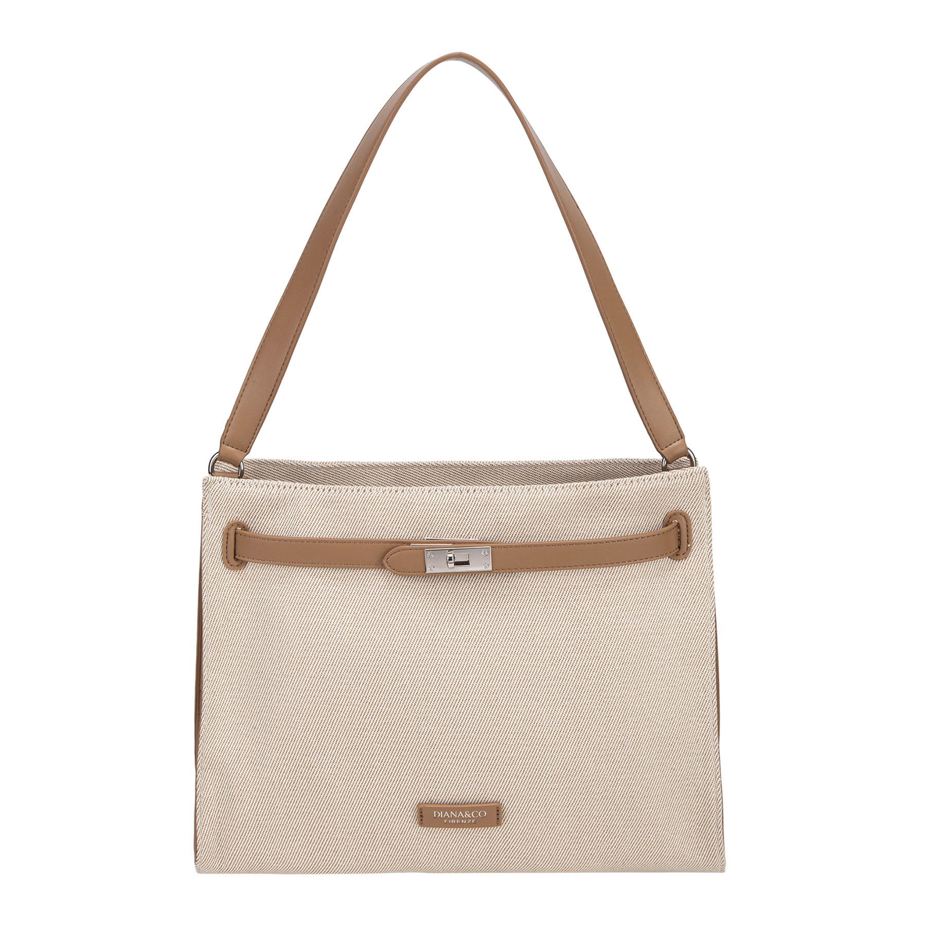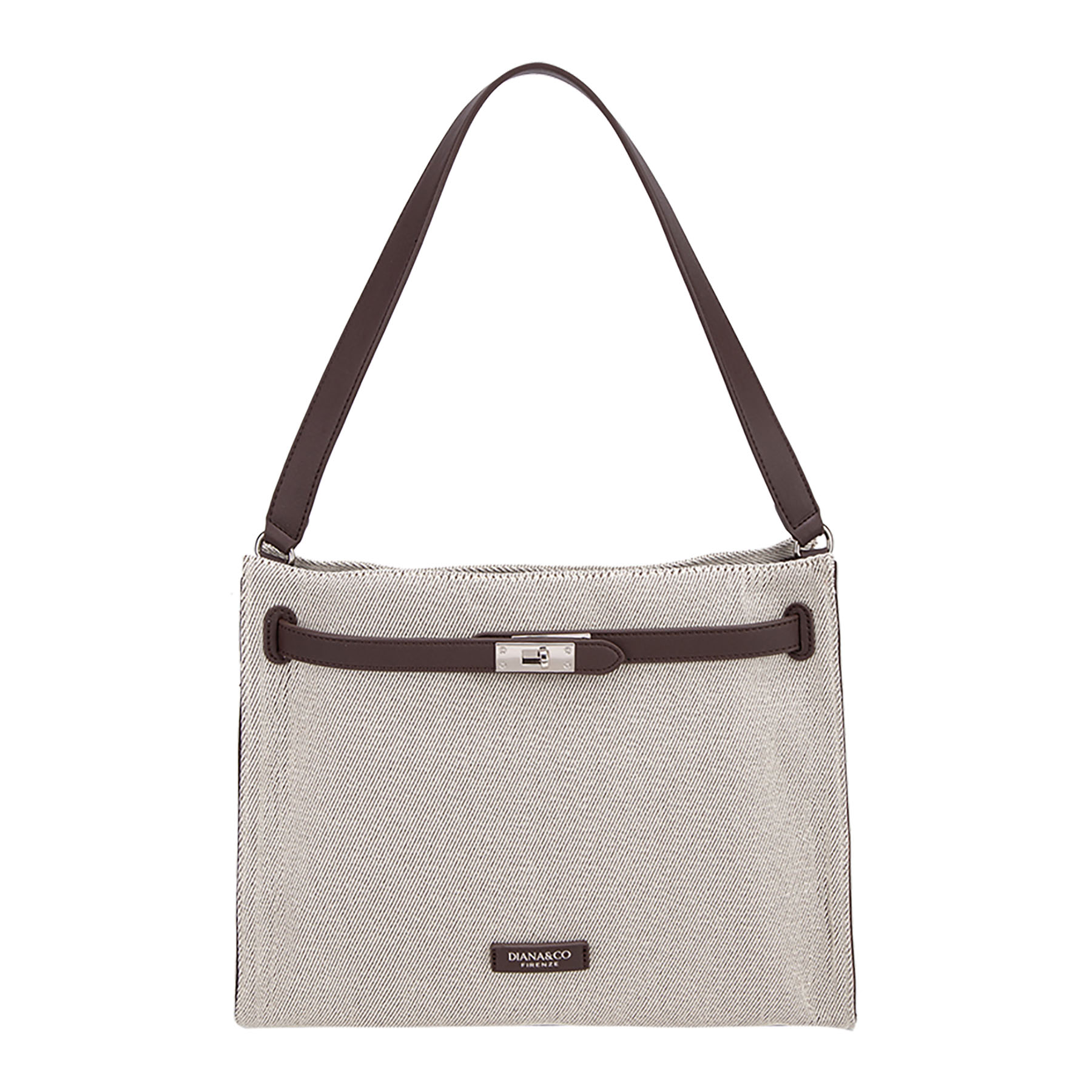 Borsa a spalla dal design raffinato fonde la la tela chiara con eleganti finiture in ecopelle. Il modello è caratterizzato da un sottile cinturino frontale con girello e da un manico piatto coordinato, ideale per una portabilità confortevole. Una silhouette strutturata e intramontabile che interpreta con stile la funzionalità quotidiana.