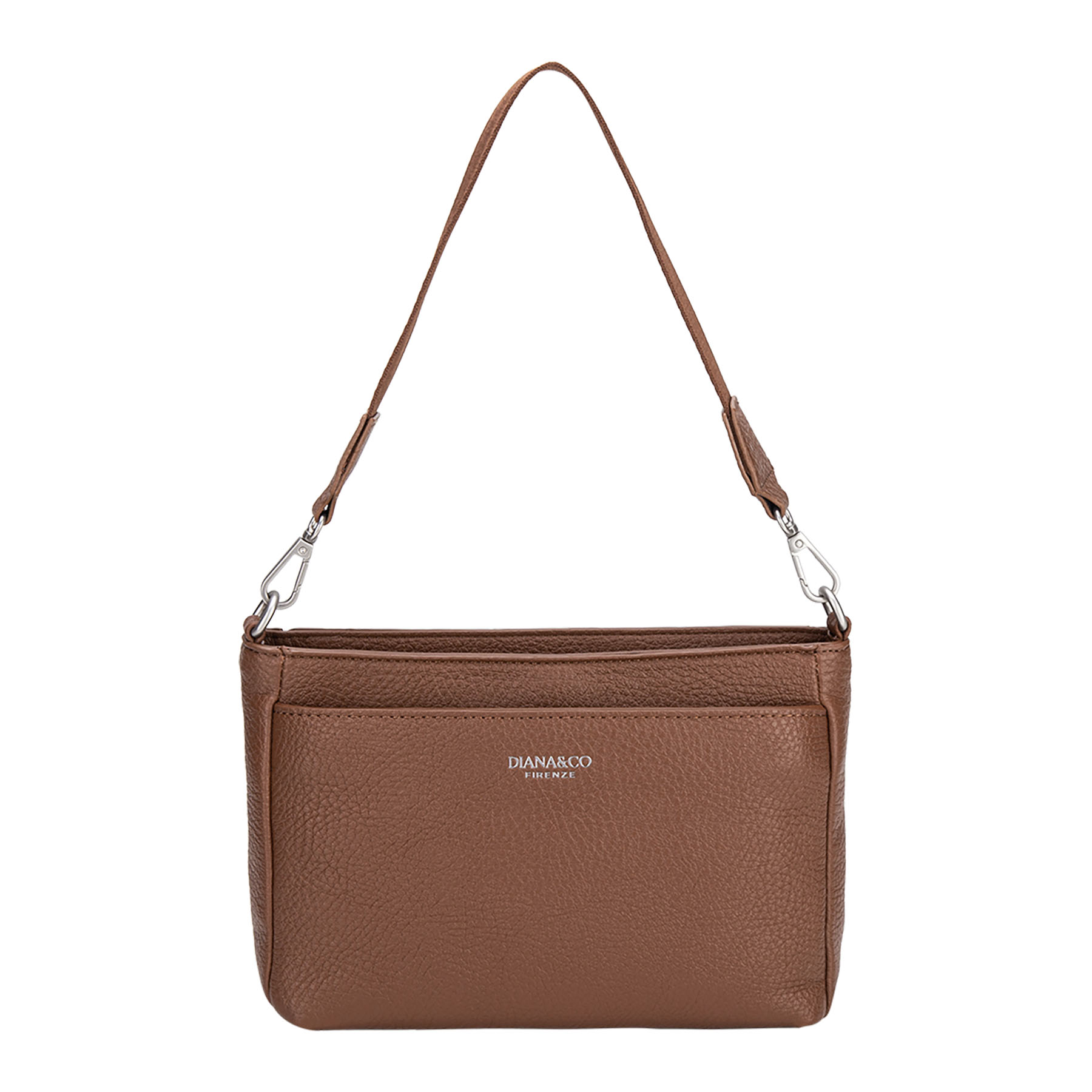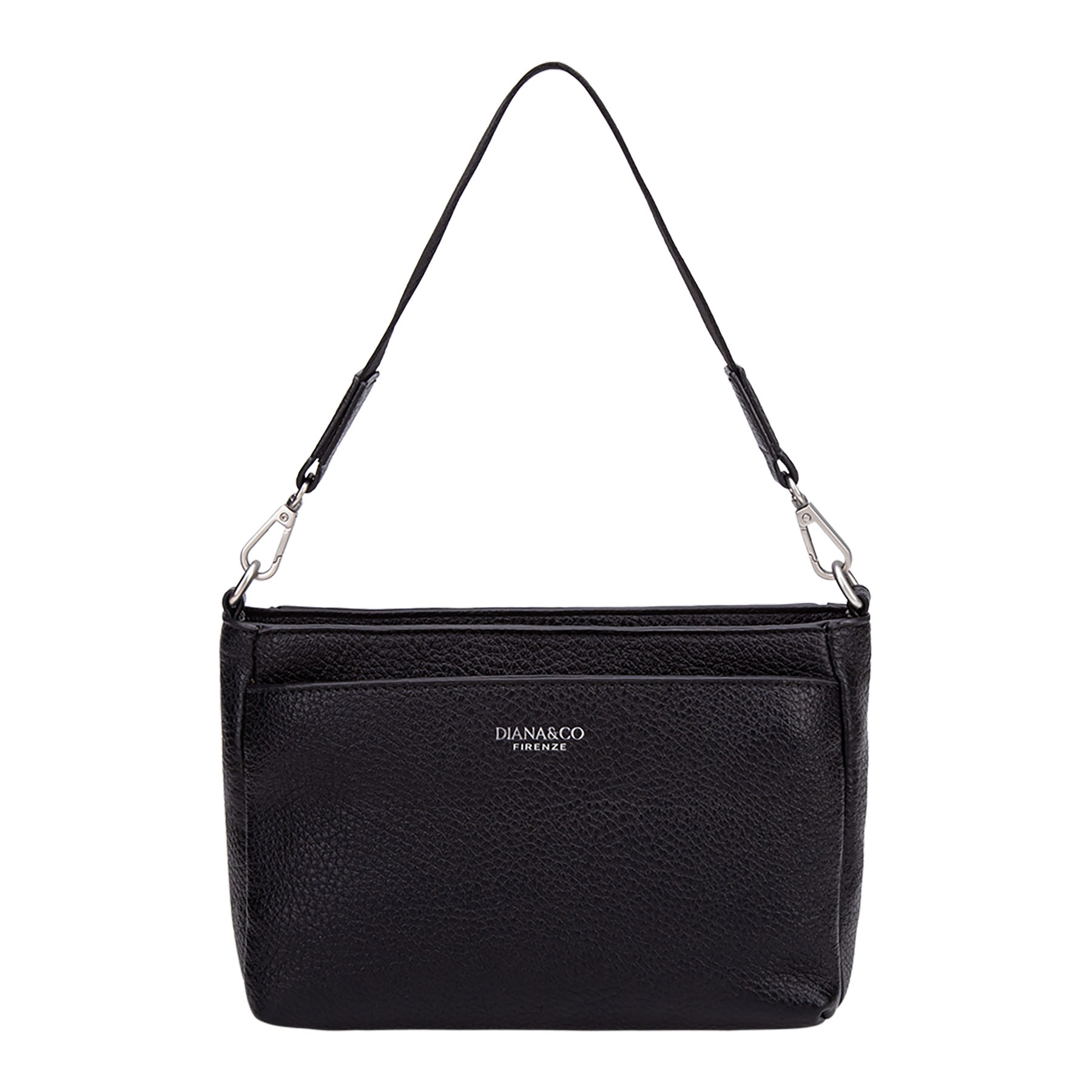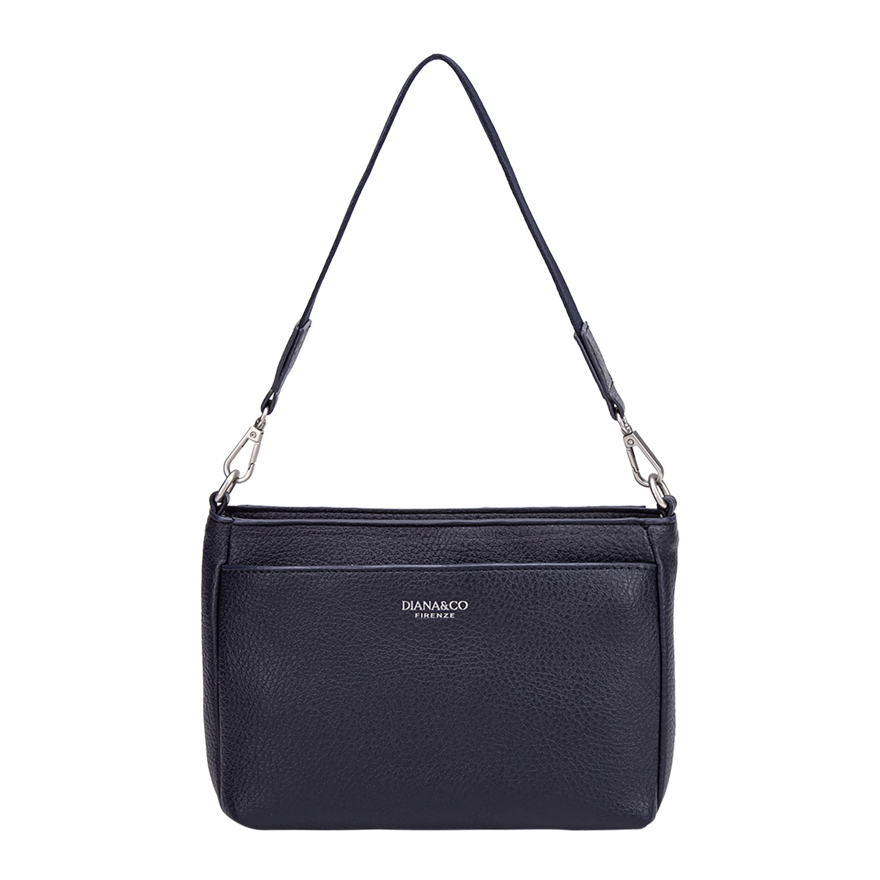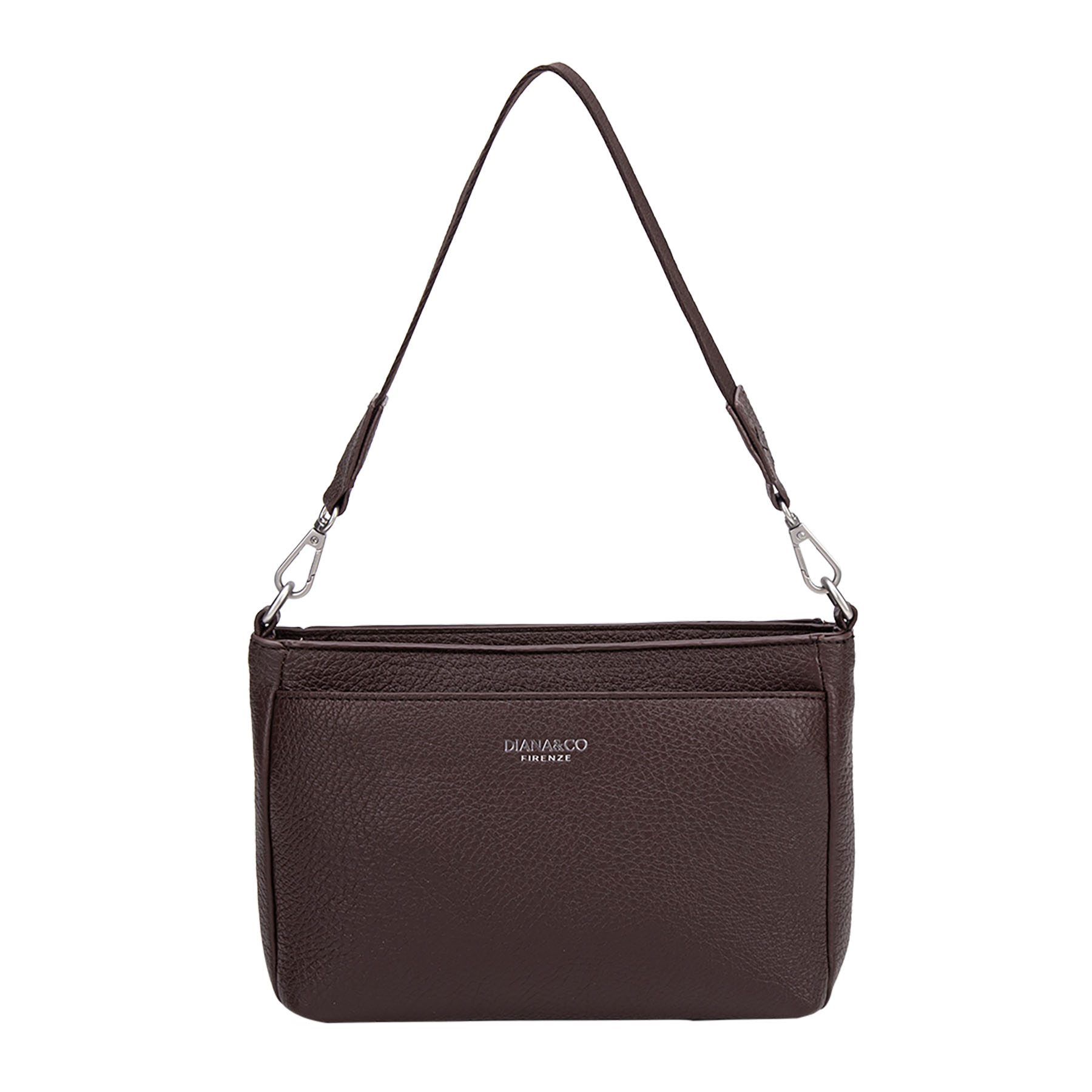 Borsa a spalla in pelle martellata dal design essenziale. Dotata di scomparto frontale, logo metallico e manico rimovibile con moschettoni, unisce praticità e stile moderno per ogni occasione.