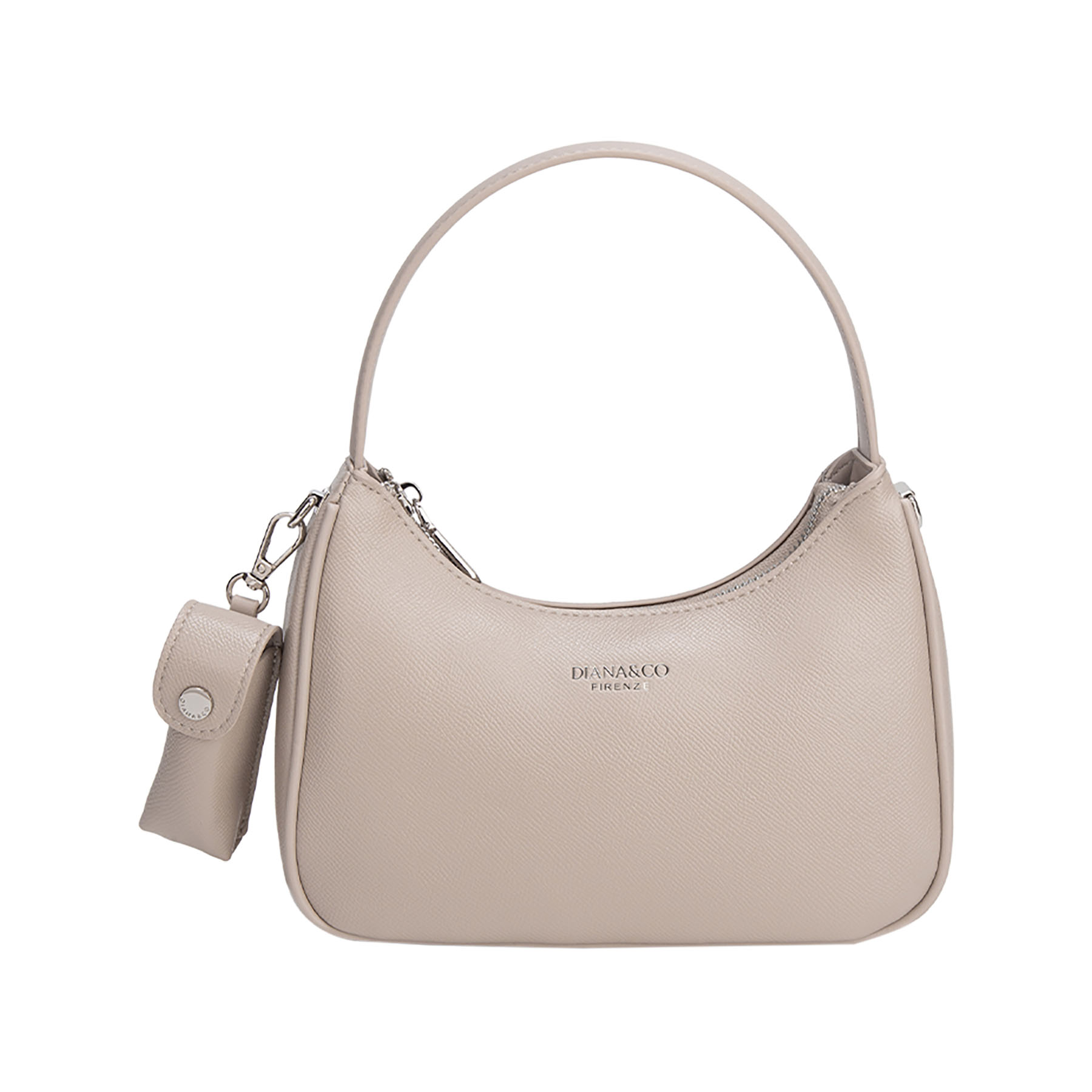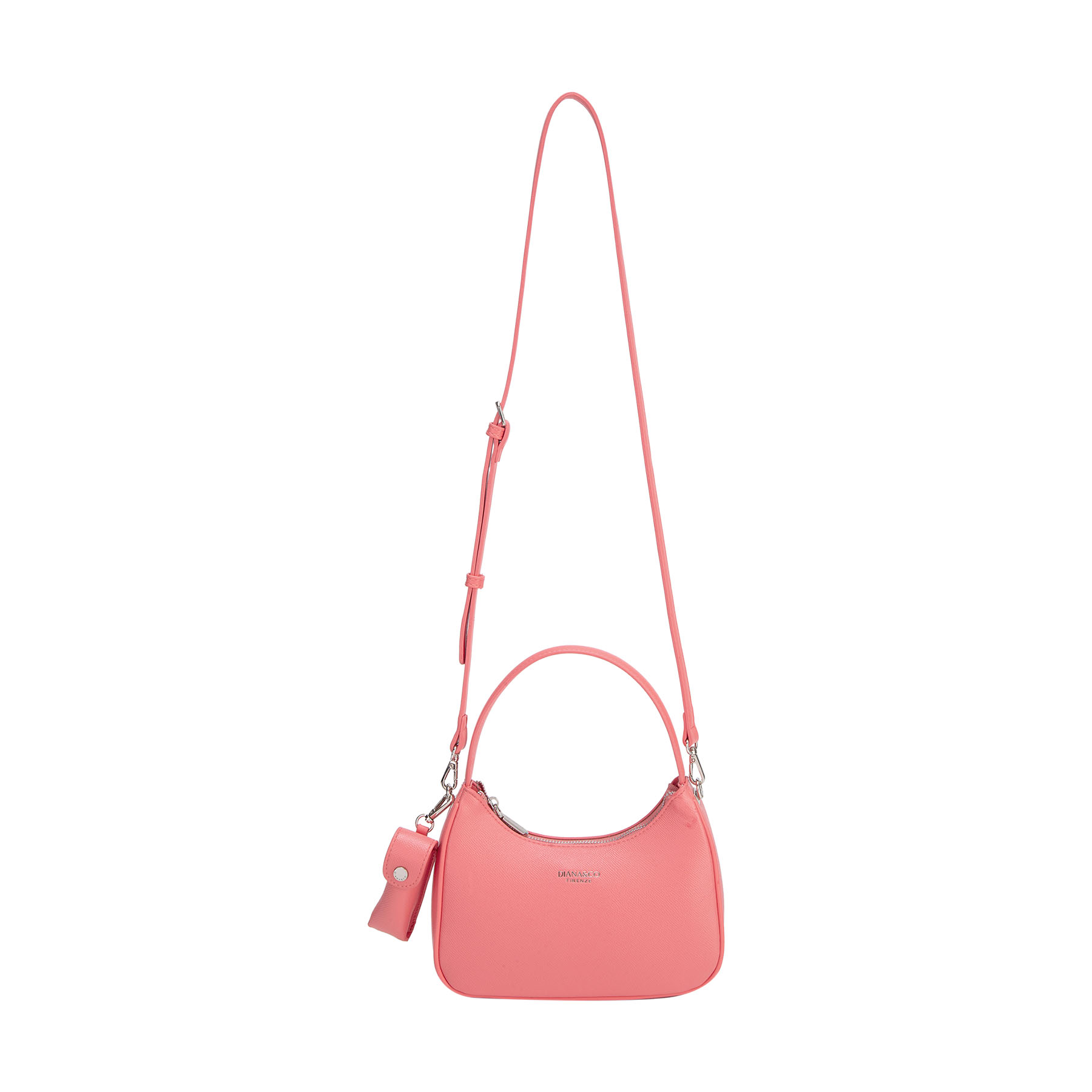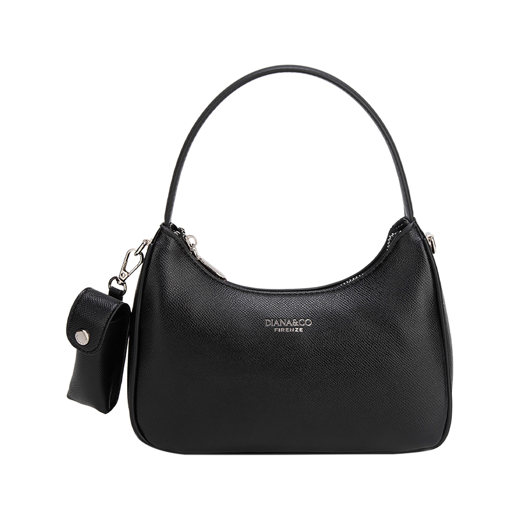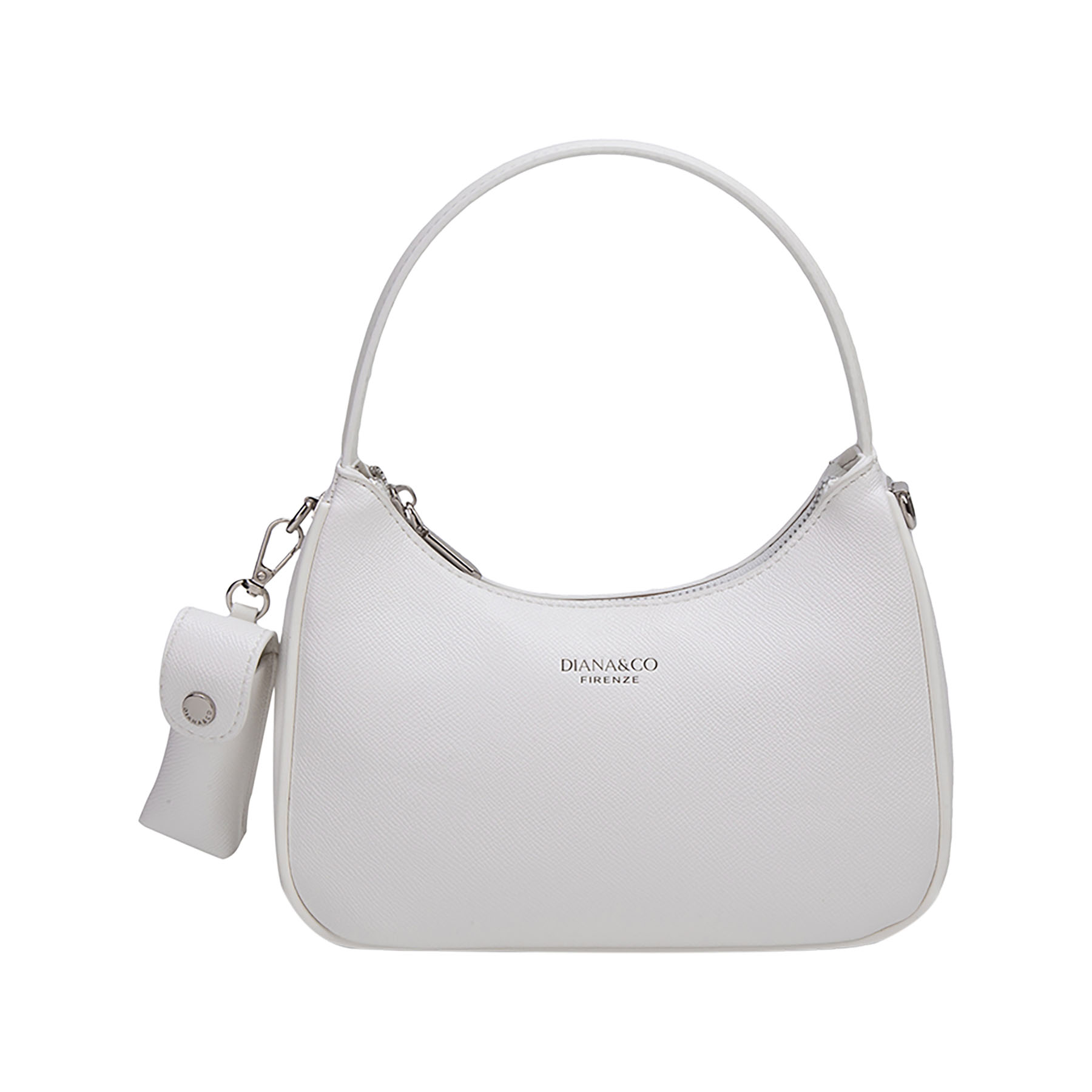 Elegante borsa a spalla con design strutturato a mezzaluna. Impreziosita da logo e dettagli in metallo argentato. Dotata di chiusura a zip e pratica tracolla larga rimovibile per un doppio utilizzo.