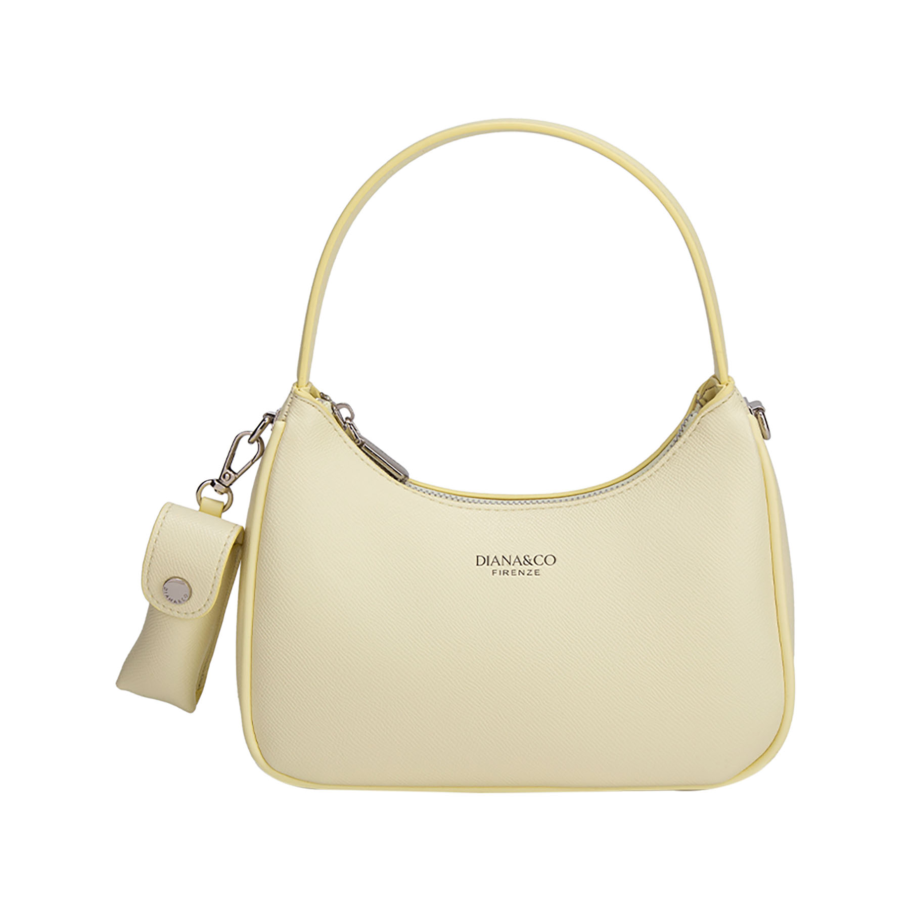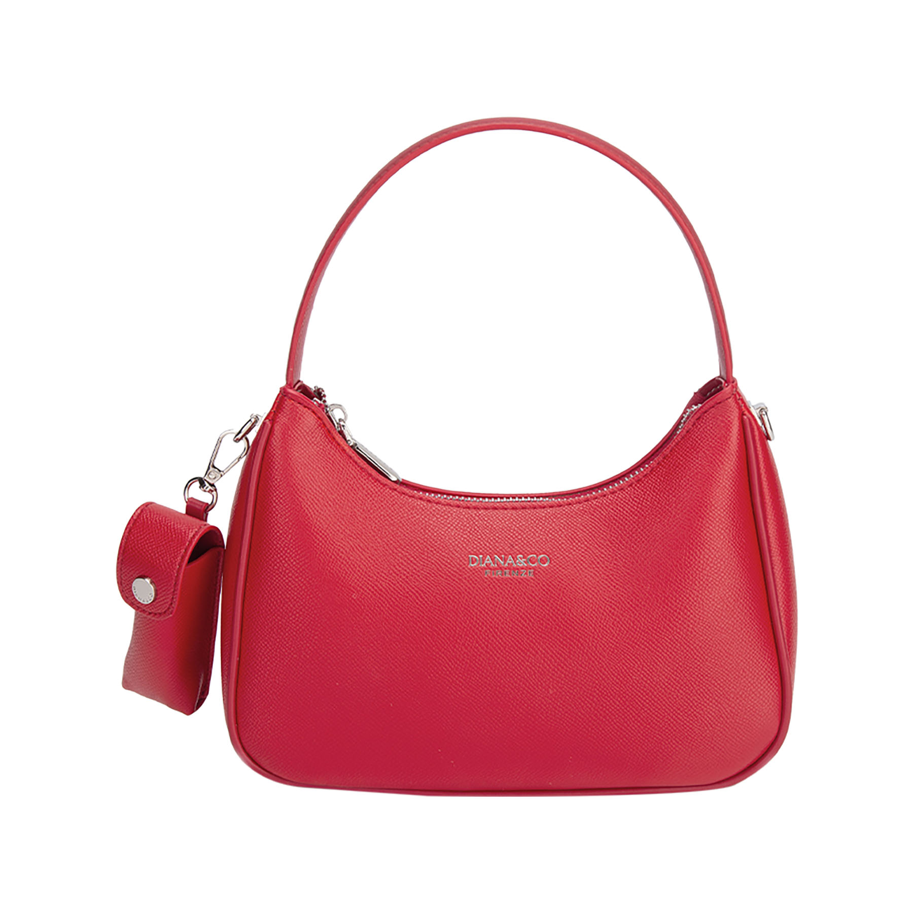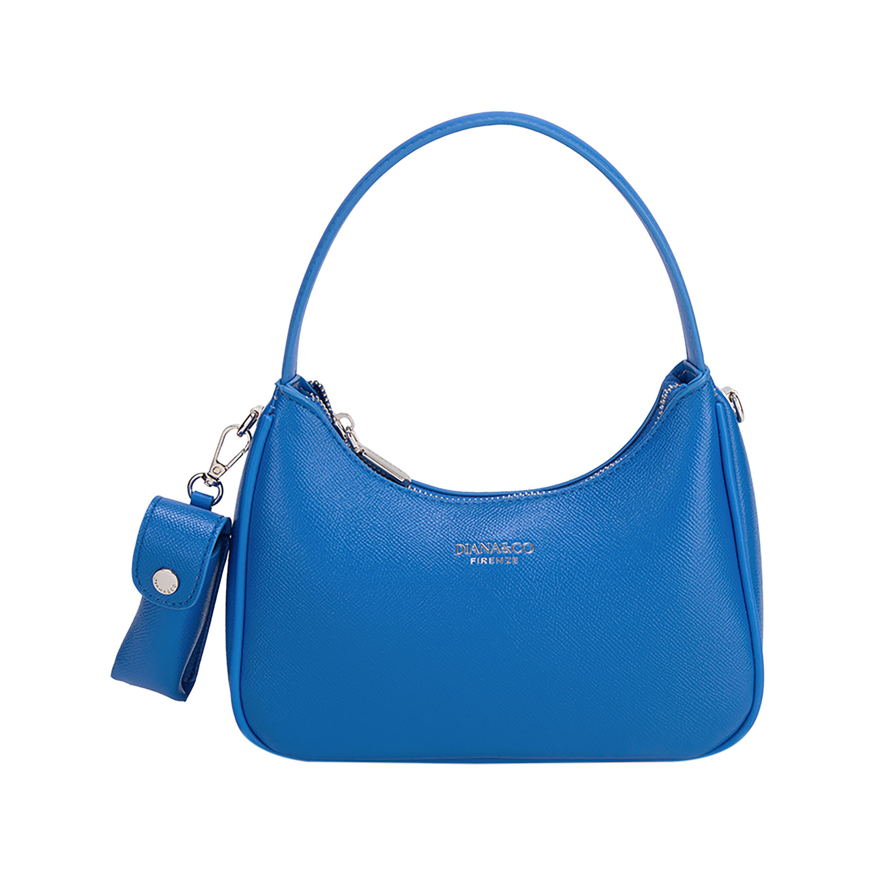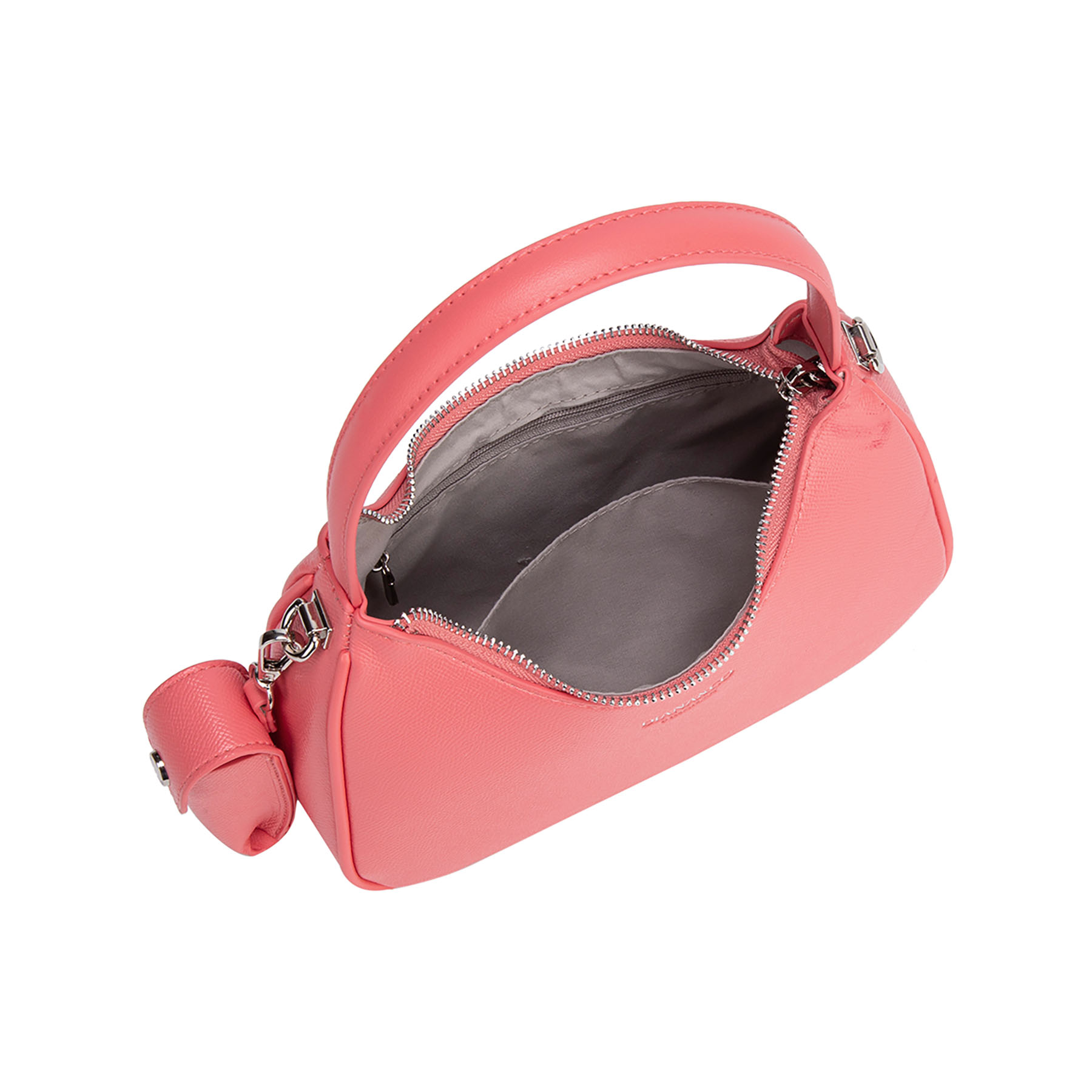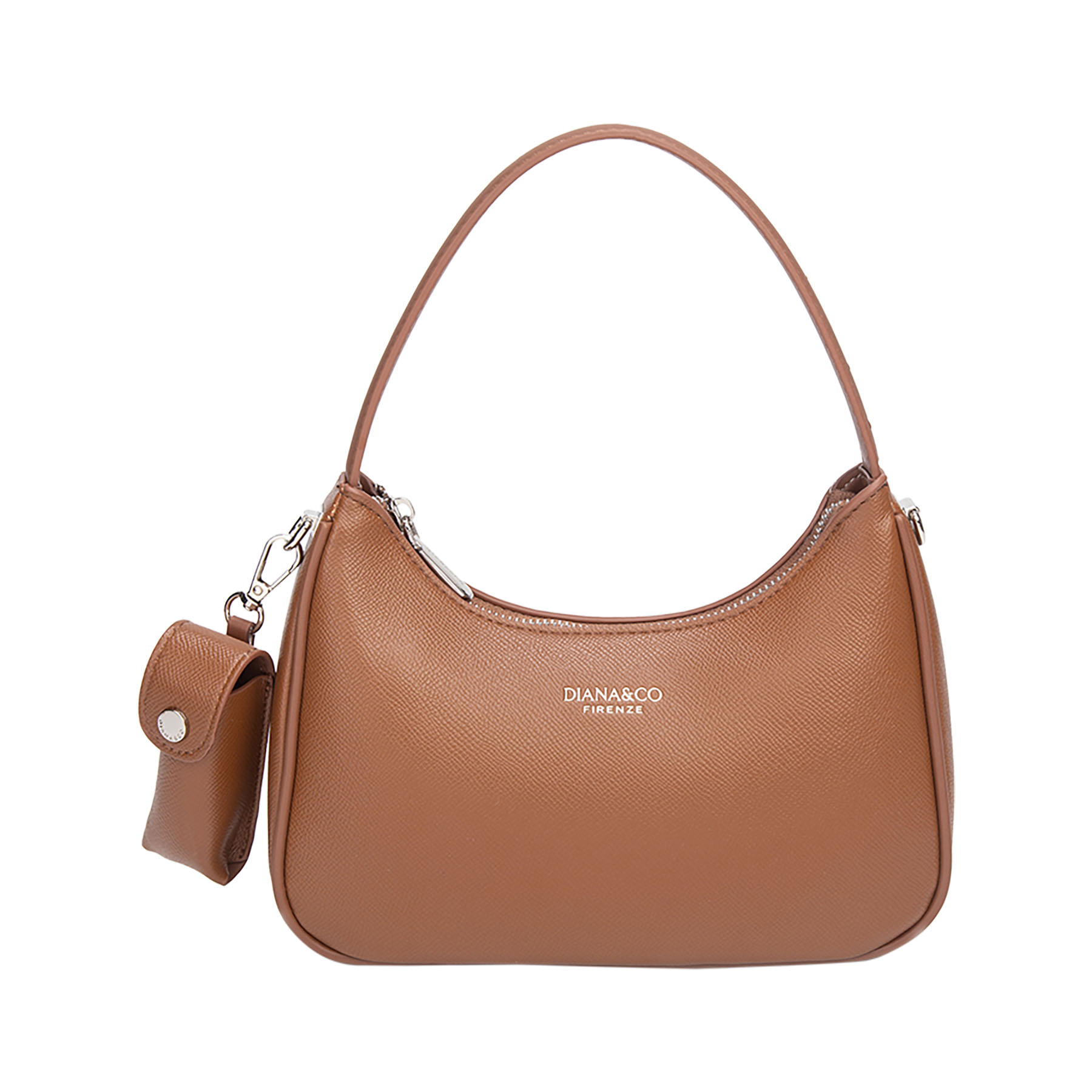 Elegante borsa a spalla con design strutturato a mezzaluna. Impreziosita da logo e dettagli in metallo argentato. Dotata di chiusura a zip e pratica tracolla larga rimovibile per un doppio utilizzo.