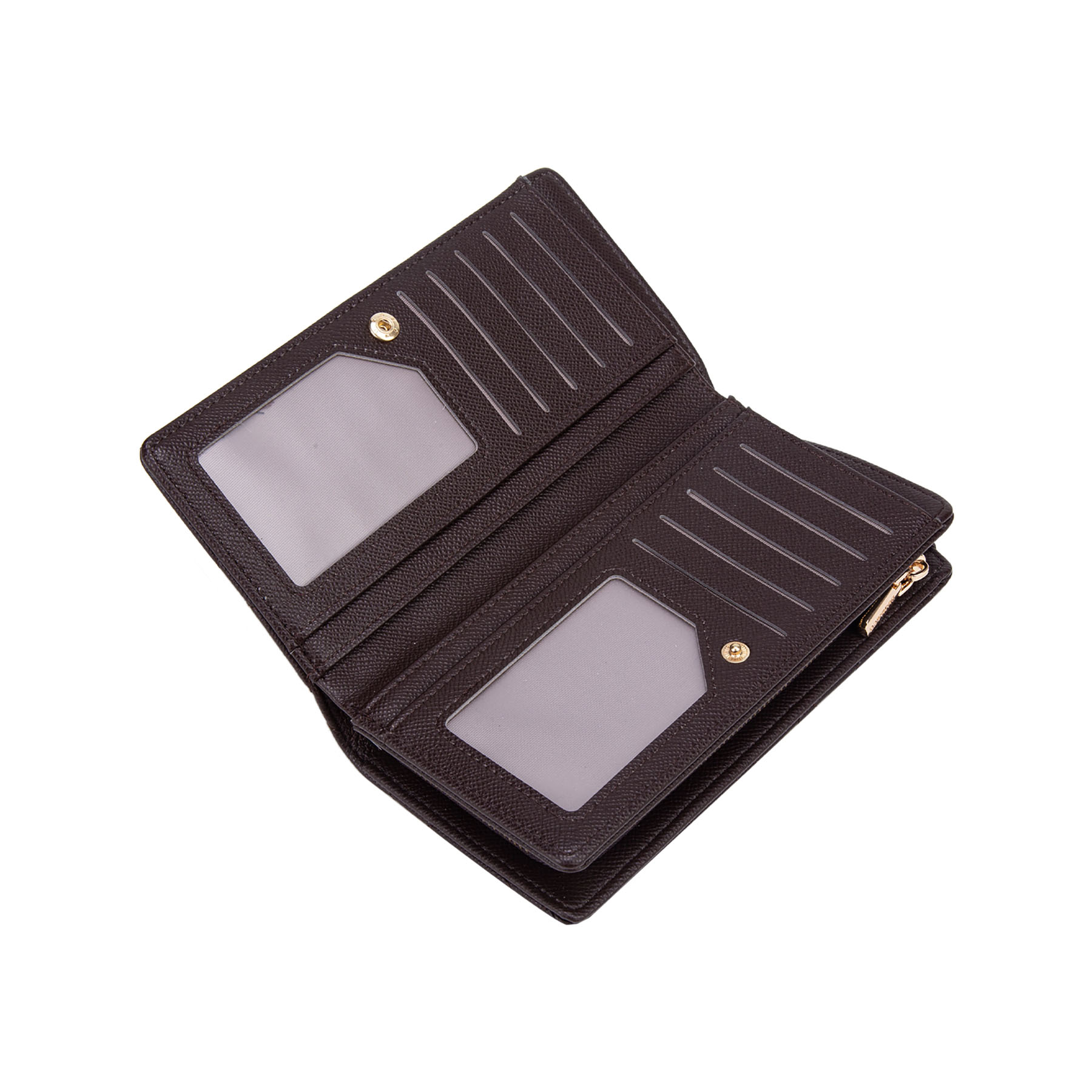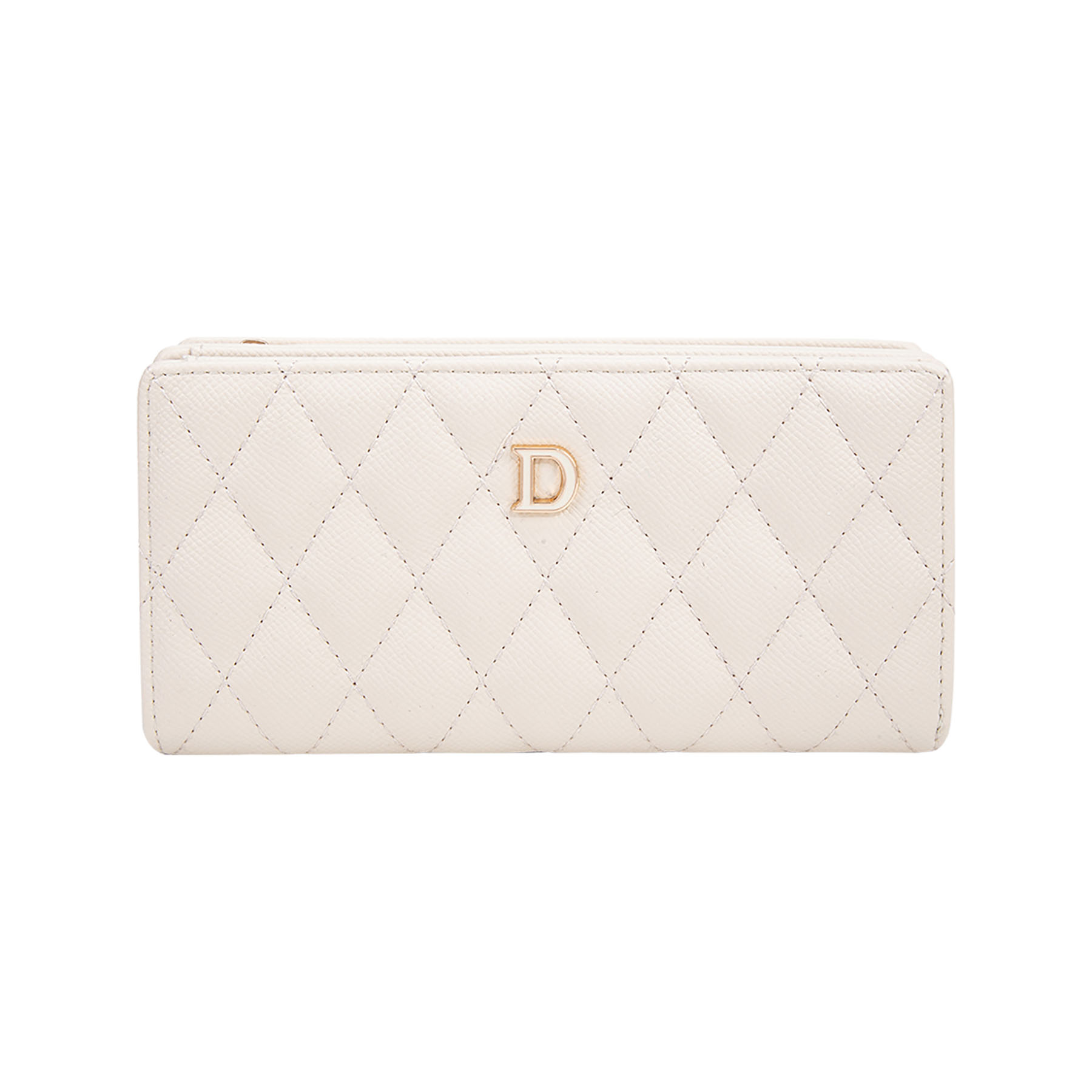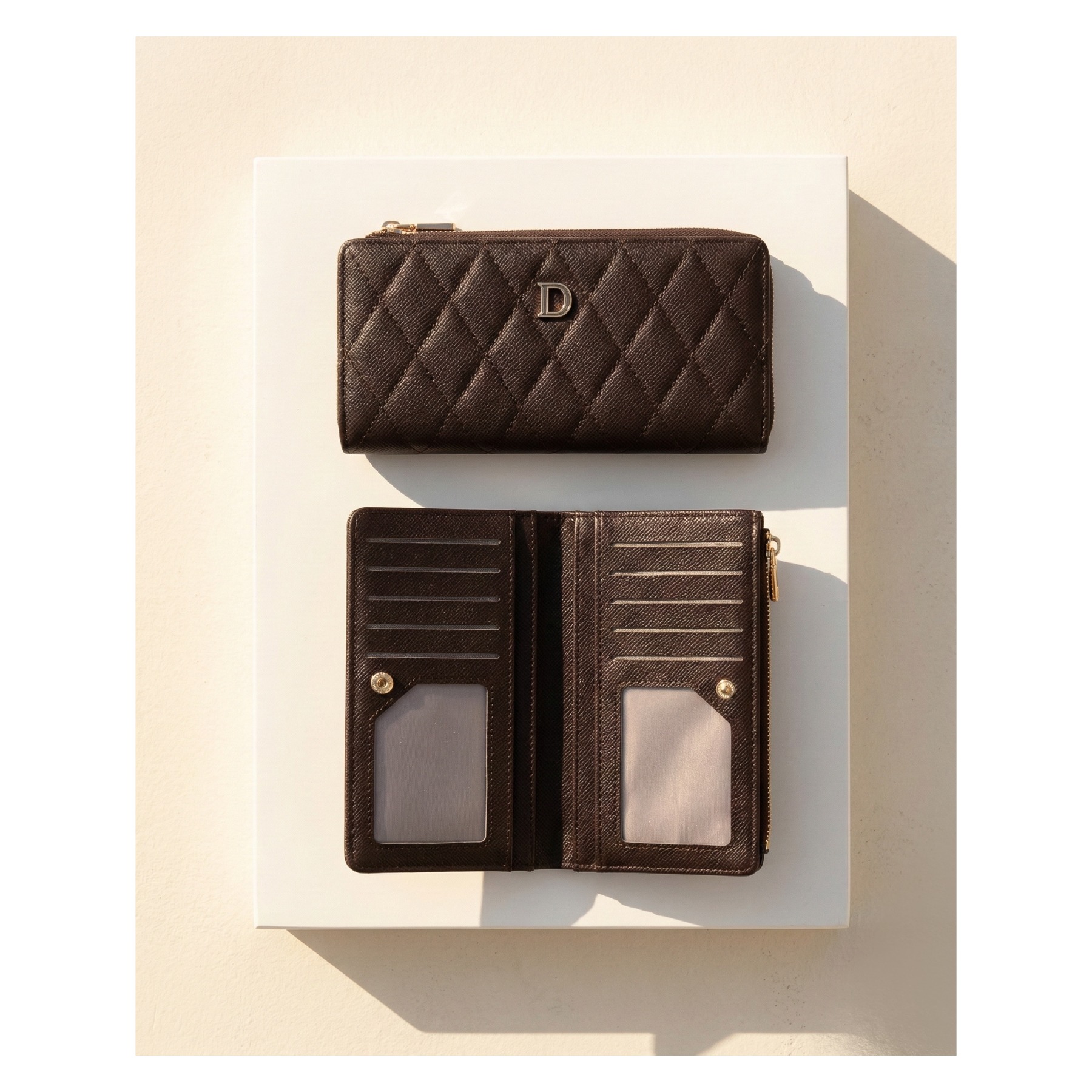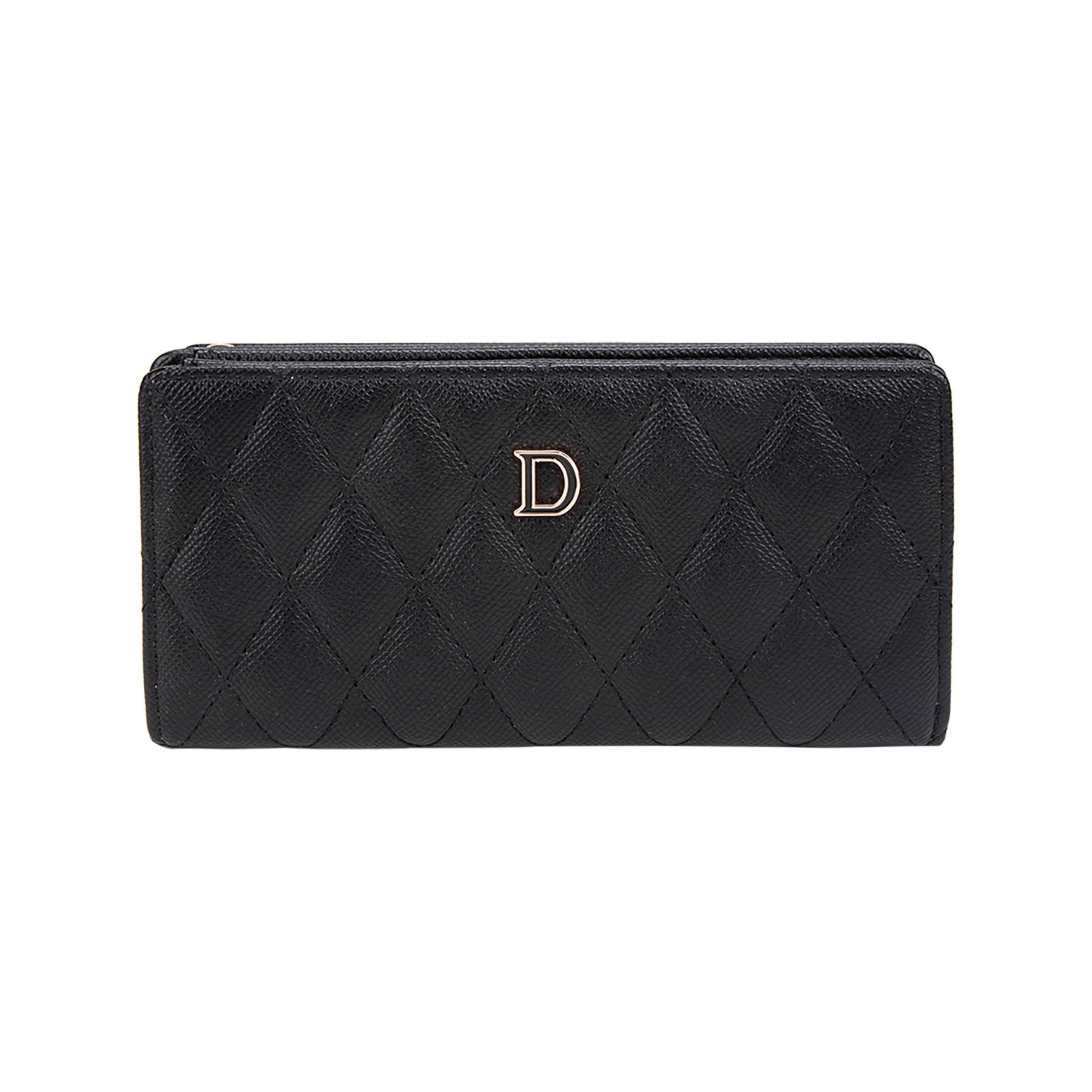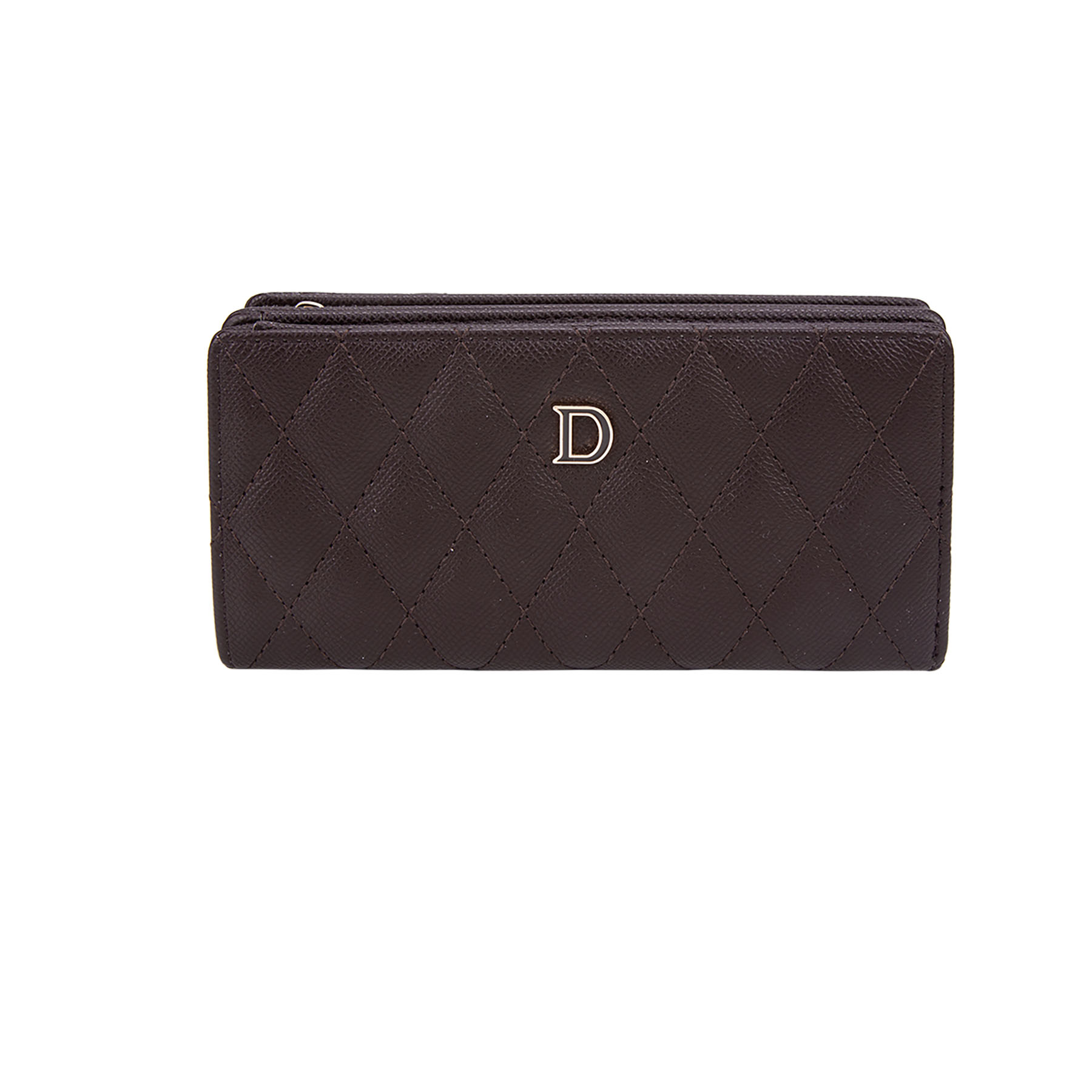 Elegante portafoglio trapuntato, impreziosito dal logo “D” dorato. L’interno è perfettamente organizzato con numerosi scomparti per carte e doppio spazio per documenti a vista.