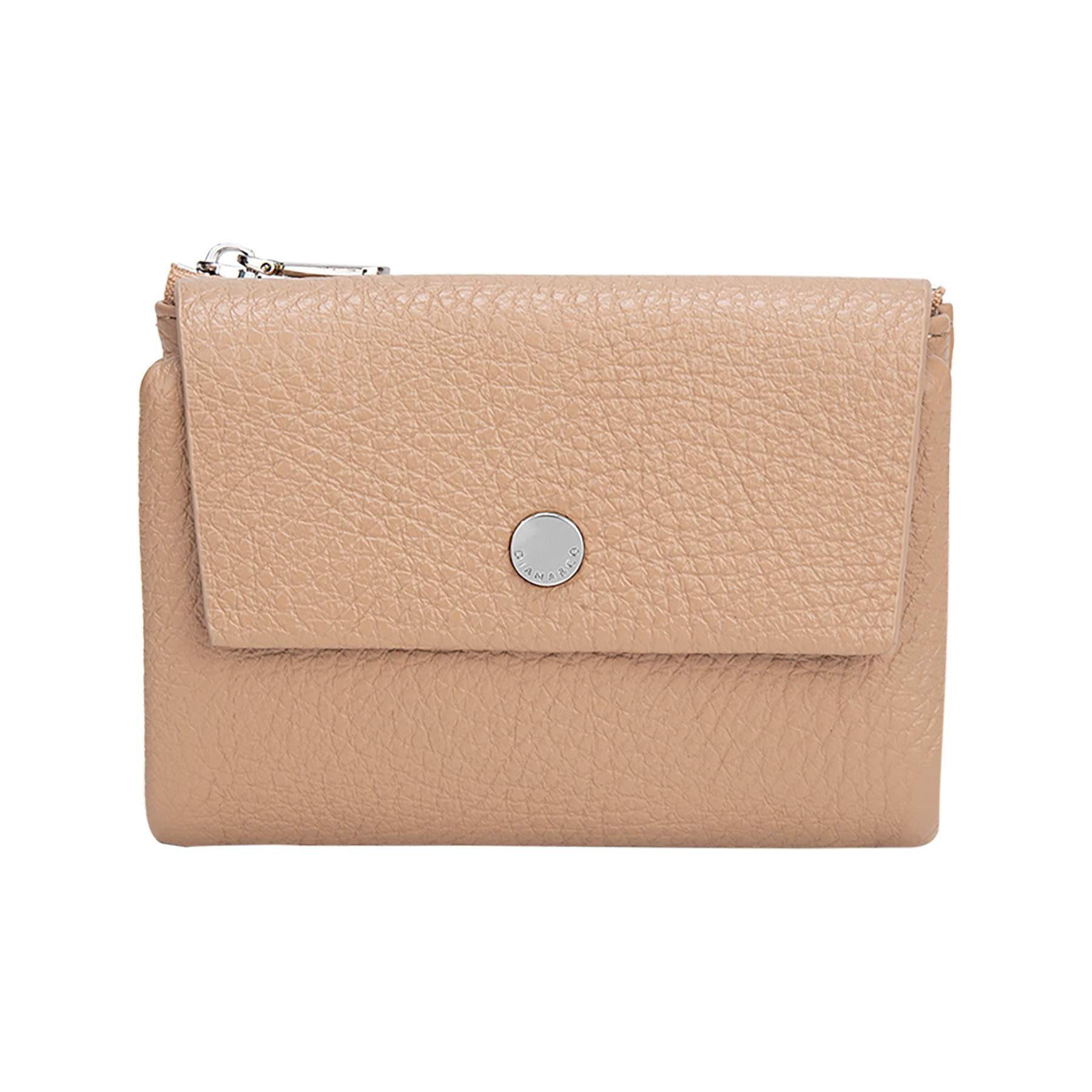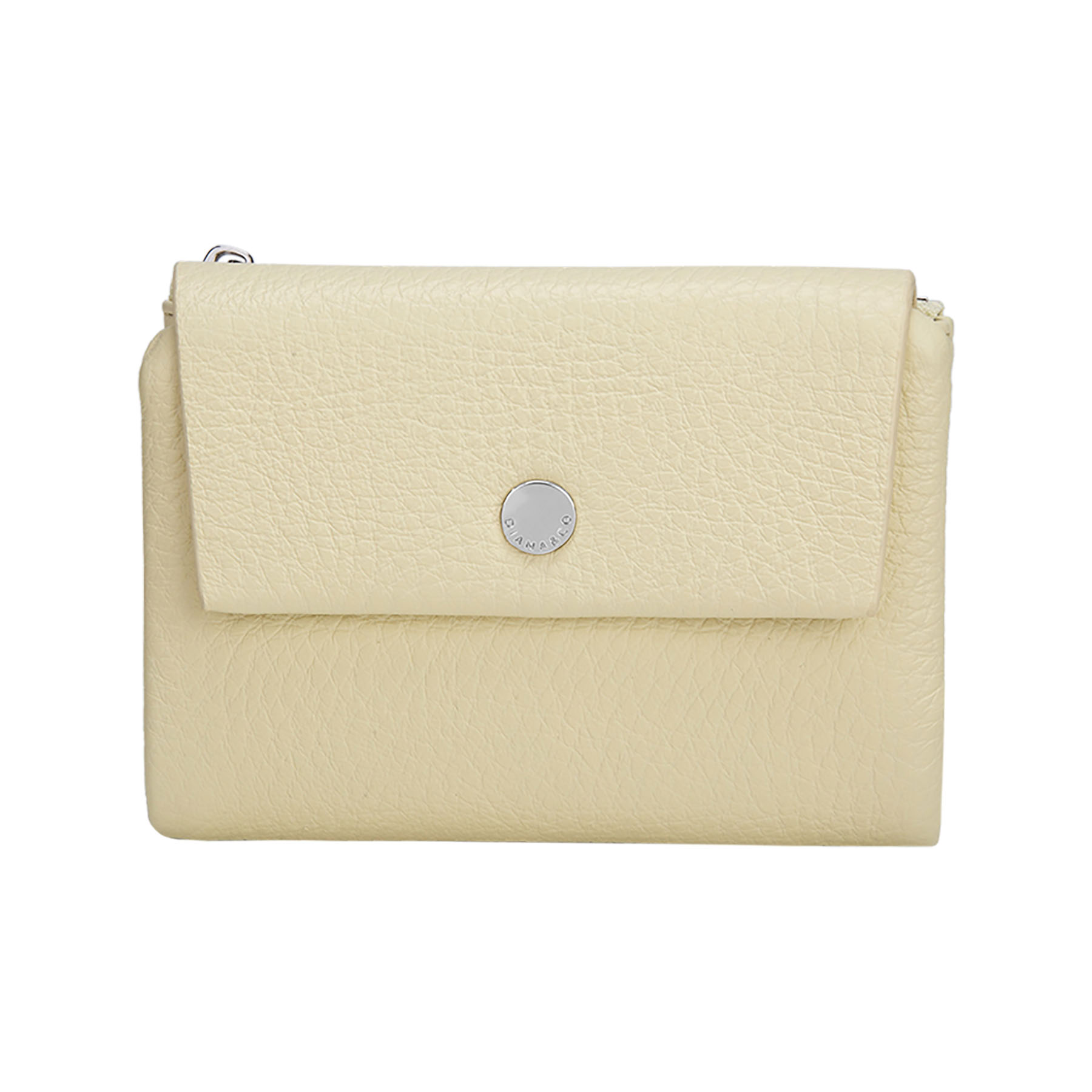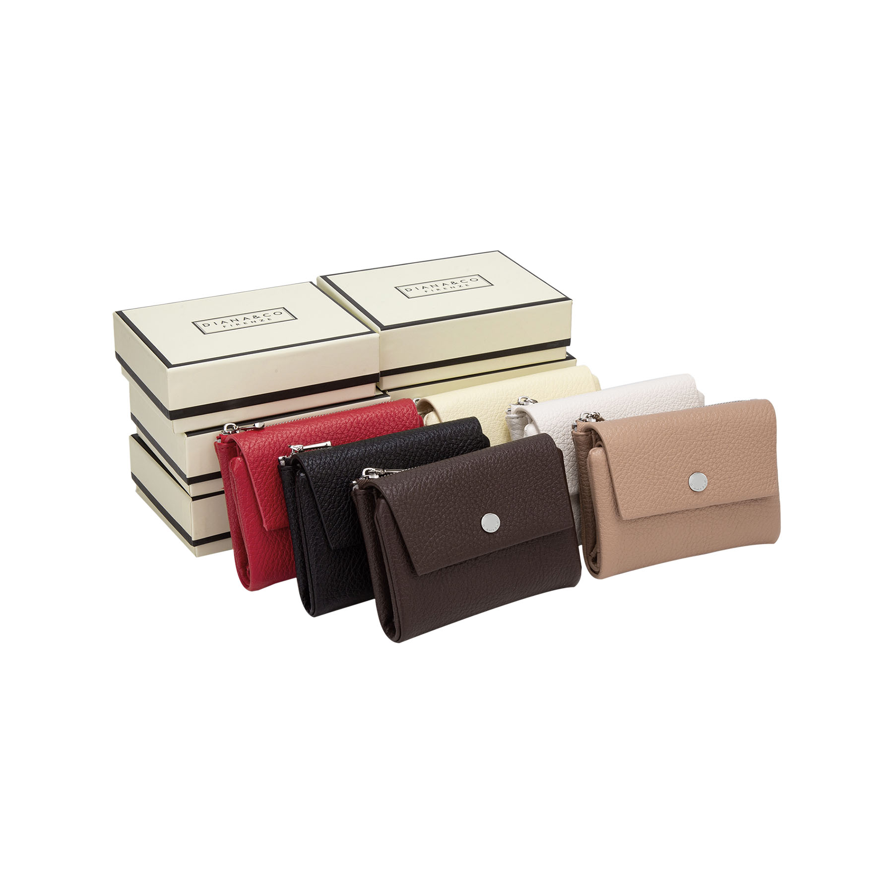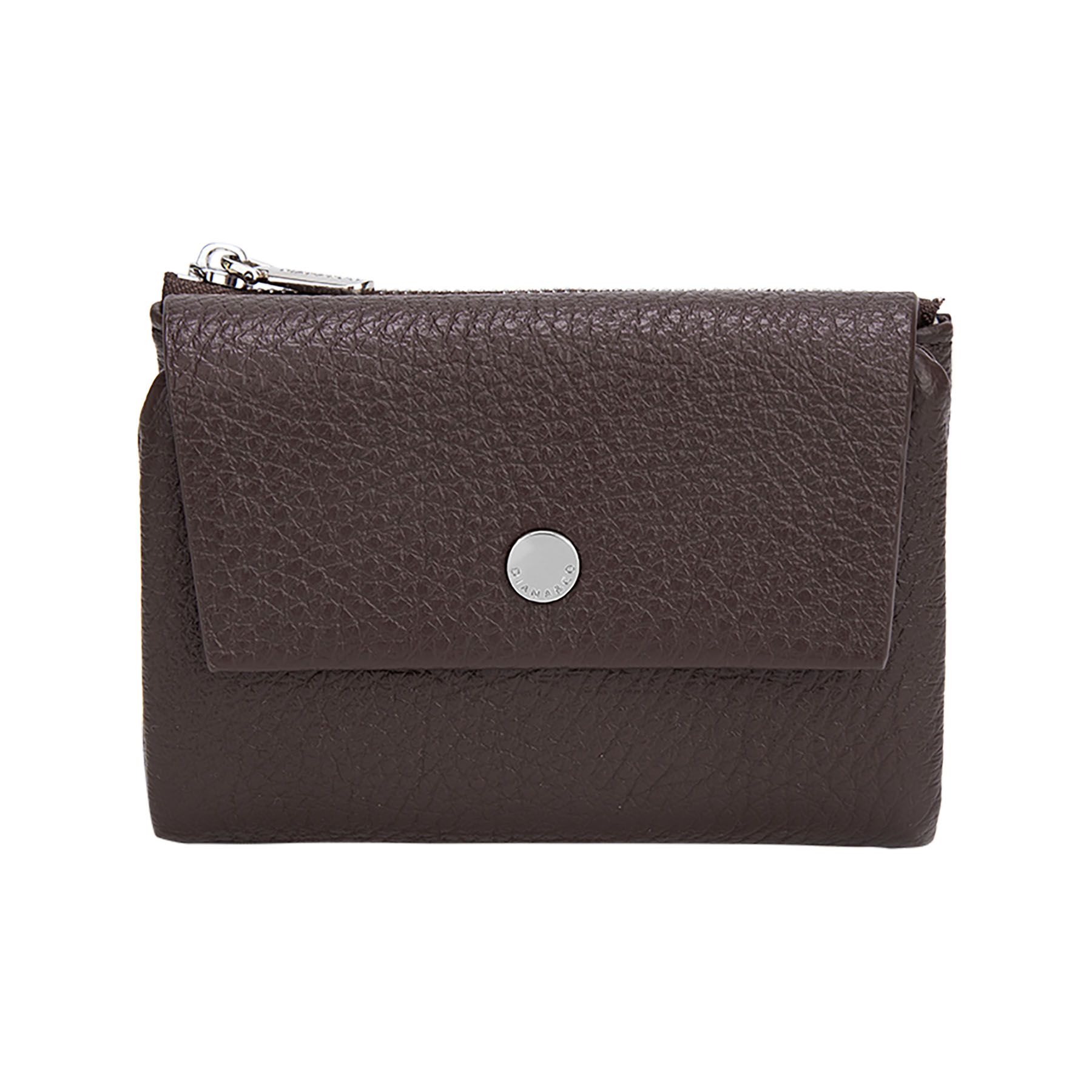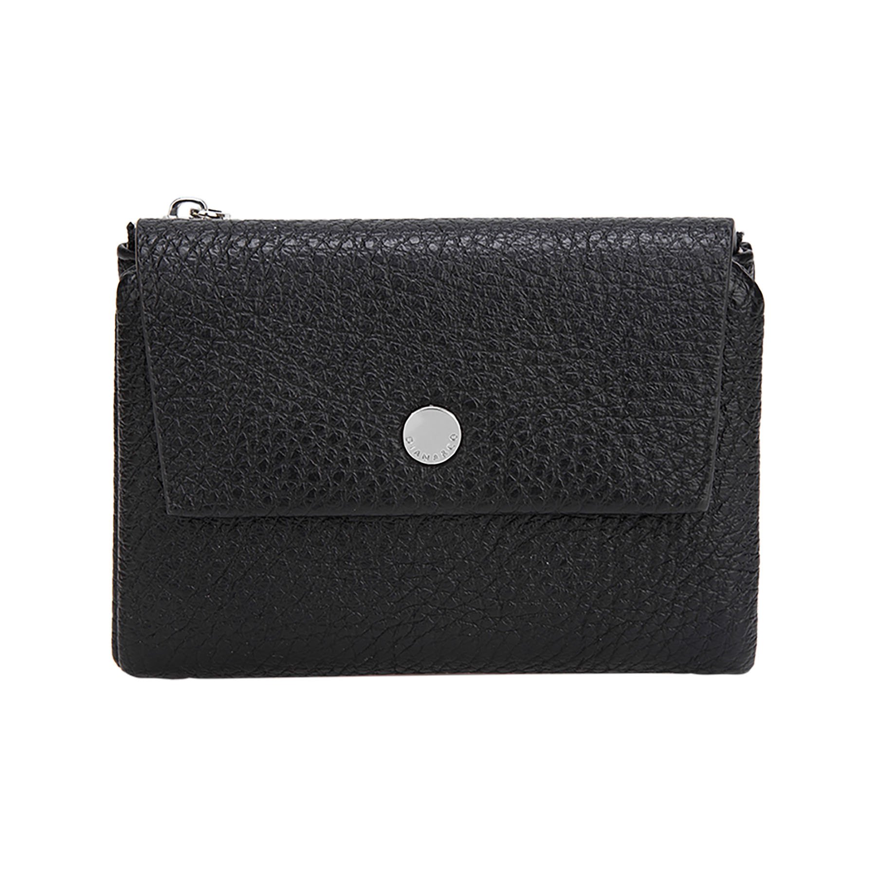 Portafoglio compatto in pelle martellata unisce eleganza e massima organizzazione in un design essenziale. L’esterno, dotato di chiusura a pressione e scomparto con zip, protegge un interno spazioso a tre ante completo di numerosi slot per carte, vani per documenti e doppie finestre trasparenti per tessere identificative.