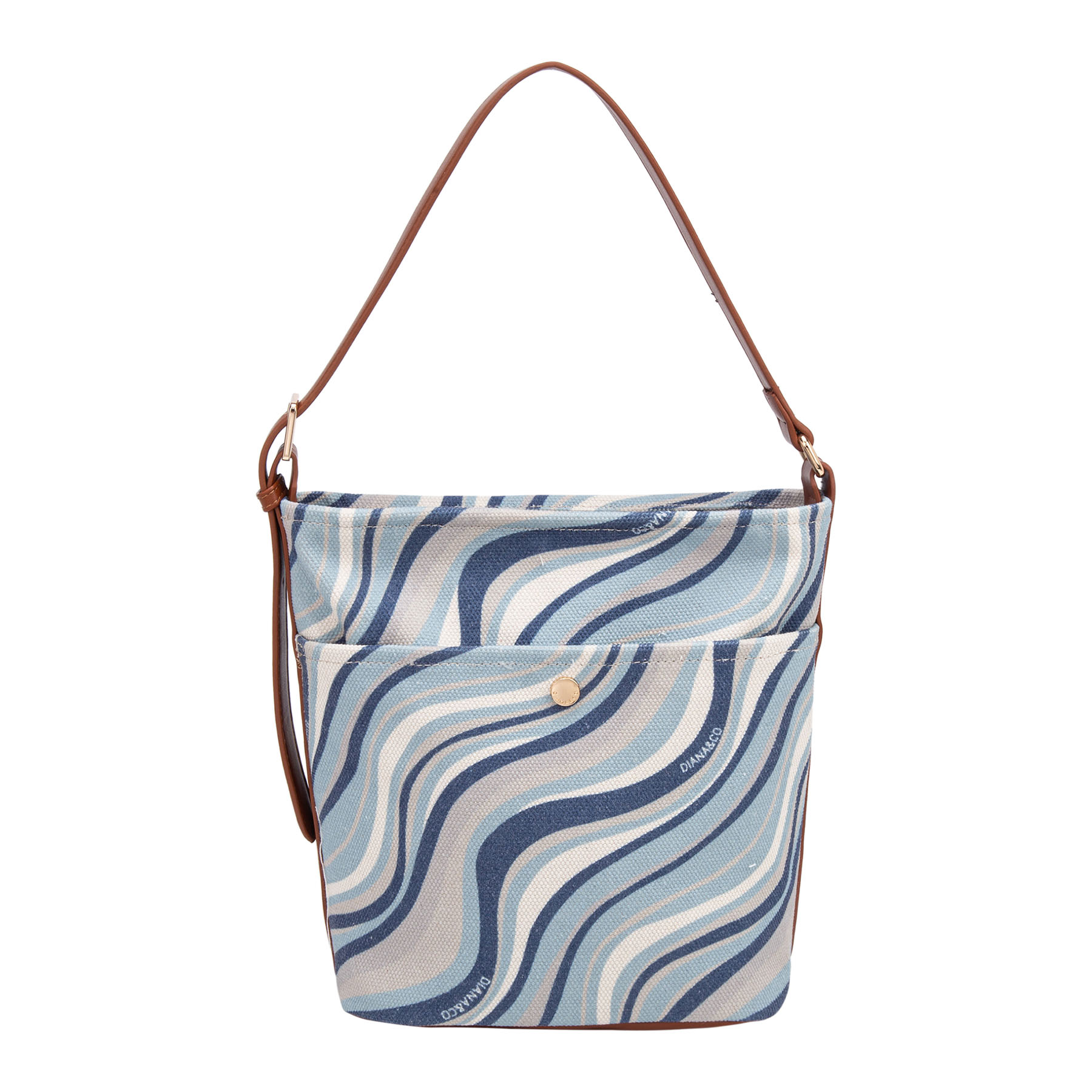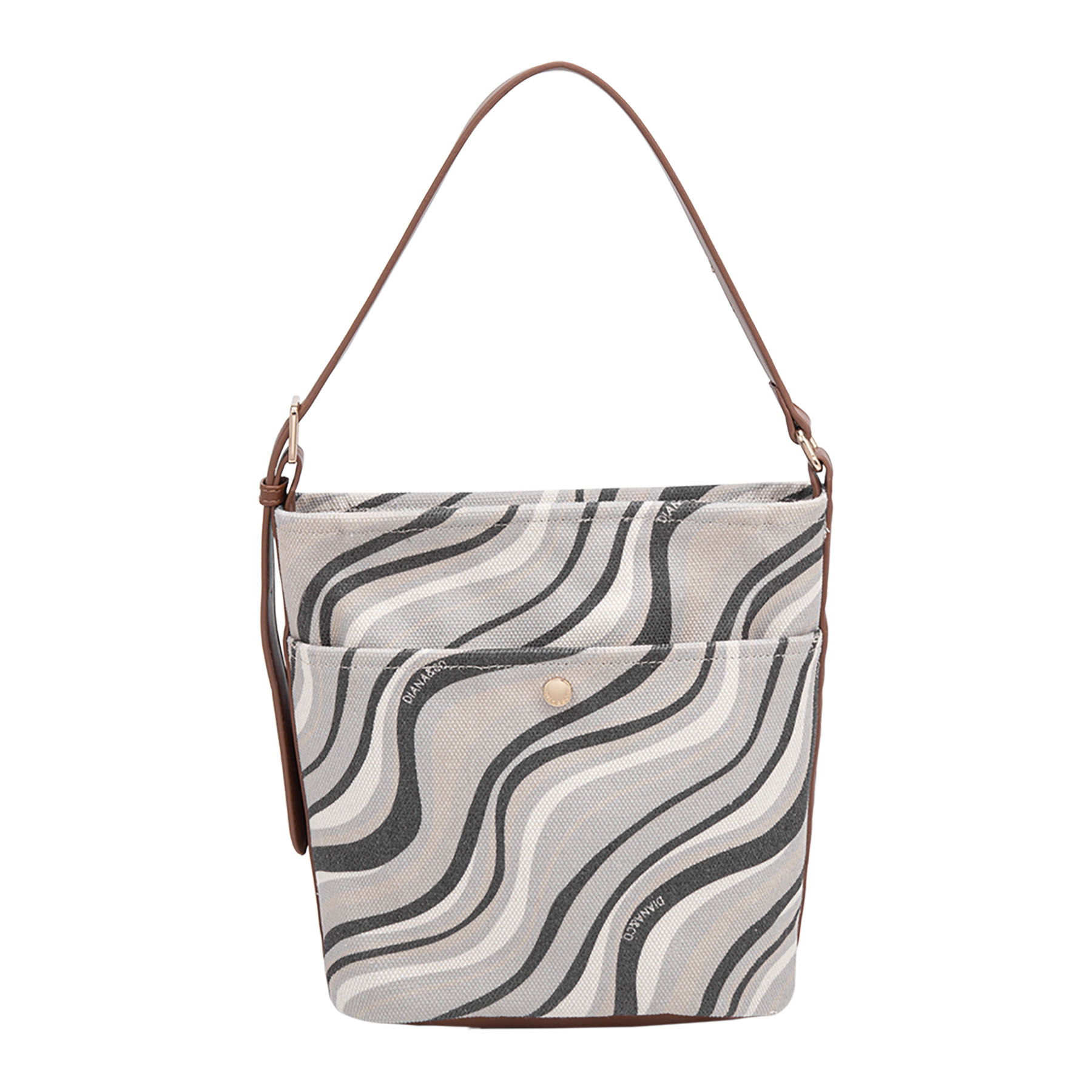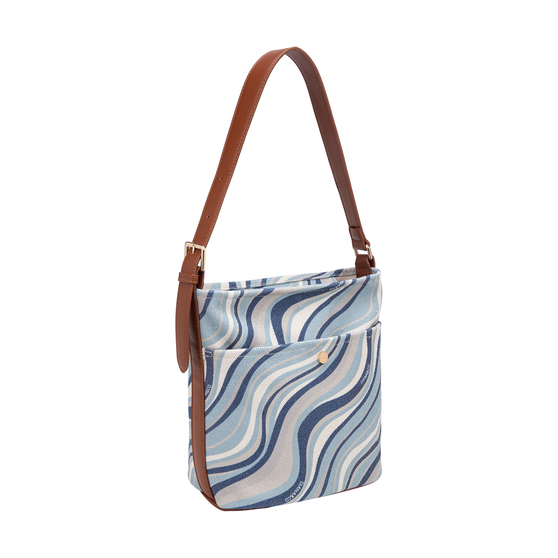Pratica borsa a spalla in tessuto, caratterizzata da un dinamico motivo a onde. Il design è arricchito da una comoda tasca frontale, un elegante manico singolo in similpelle e luminosi dettagli dorati.