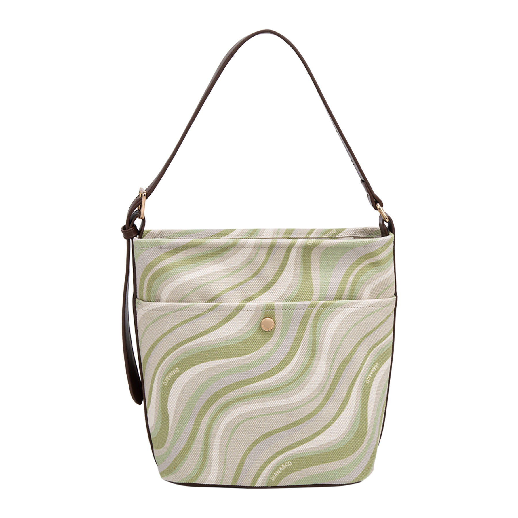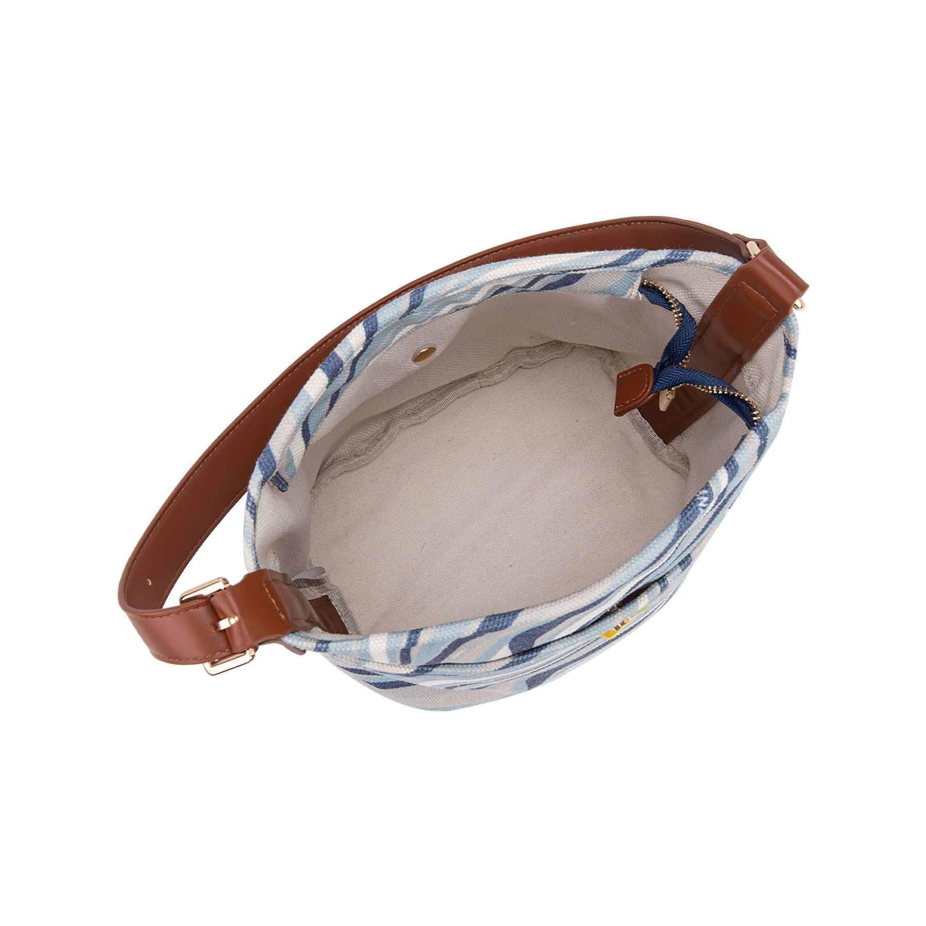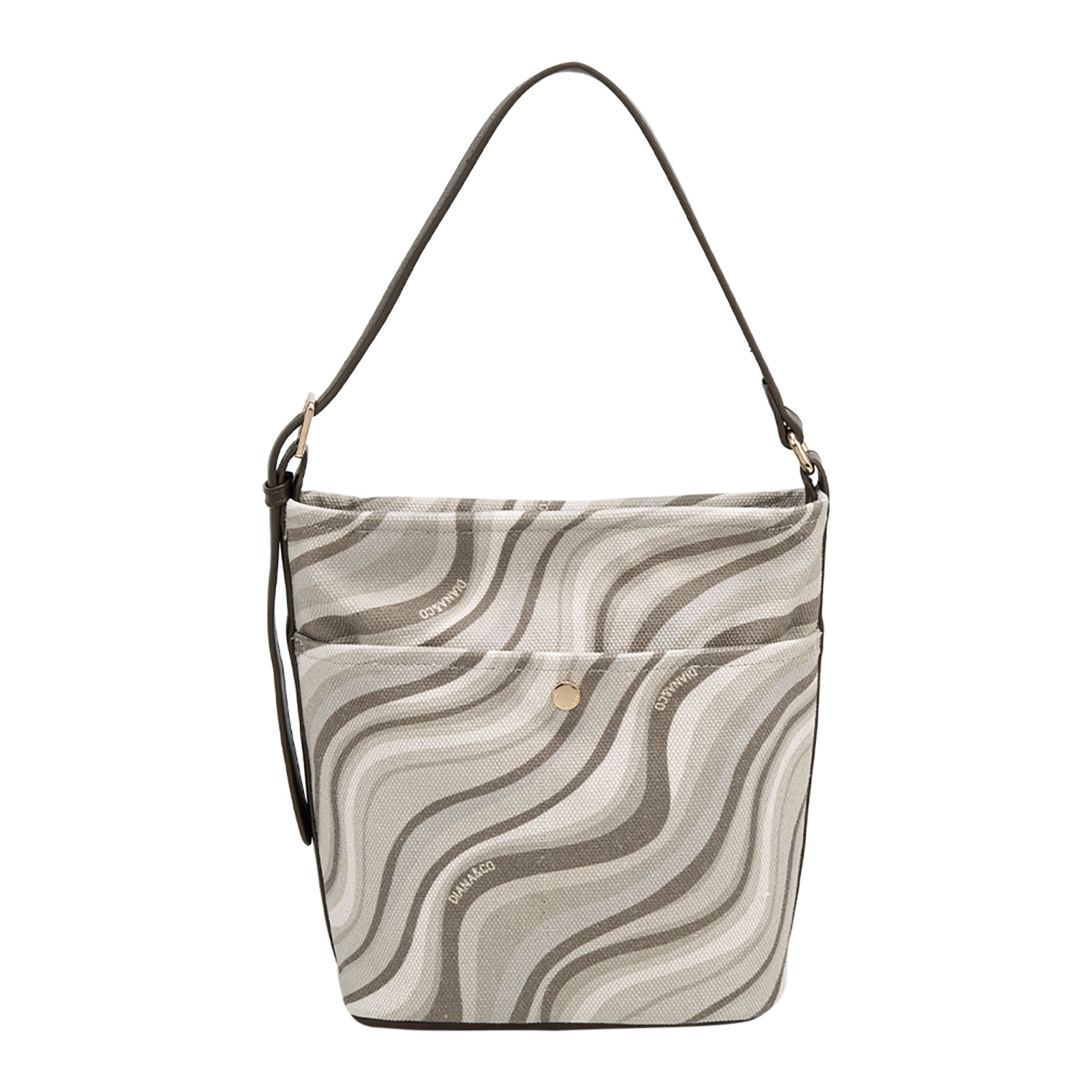 Pratica borsa a spalla in tessuto, caratterizzata da un dinamico motivo a onde. Il design è arricchito da una comoda tasca frontale, un elegante manico singolo in similpelle e luminosi dettagli dorati.