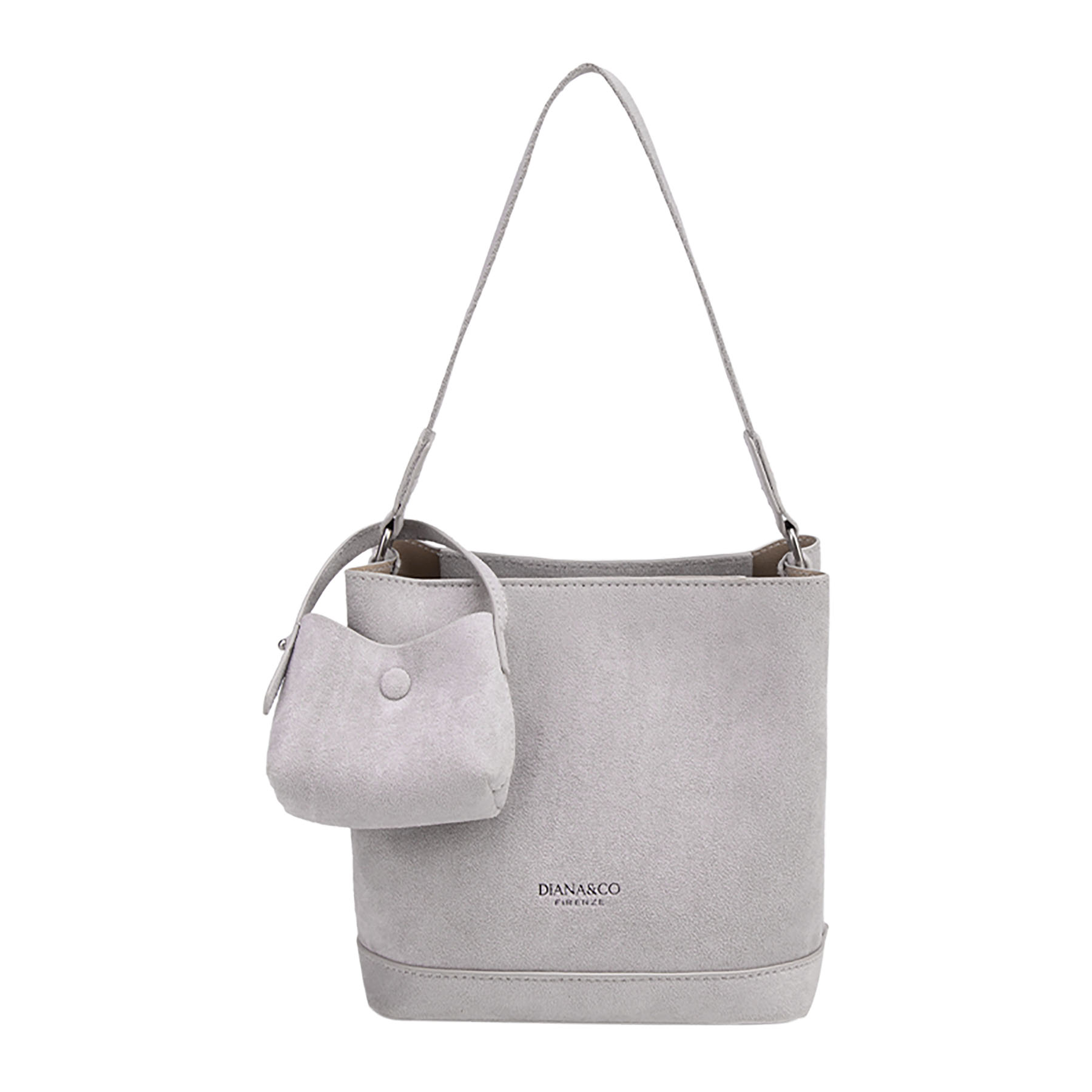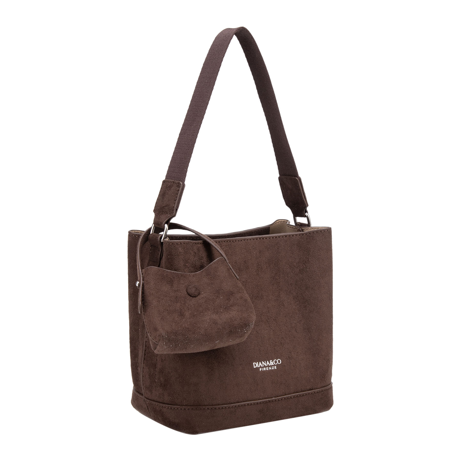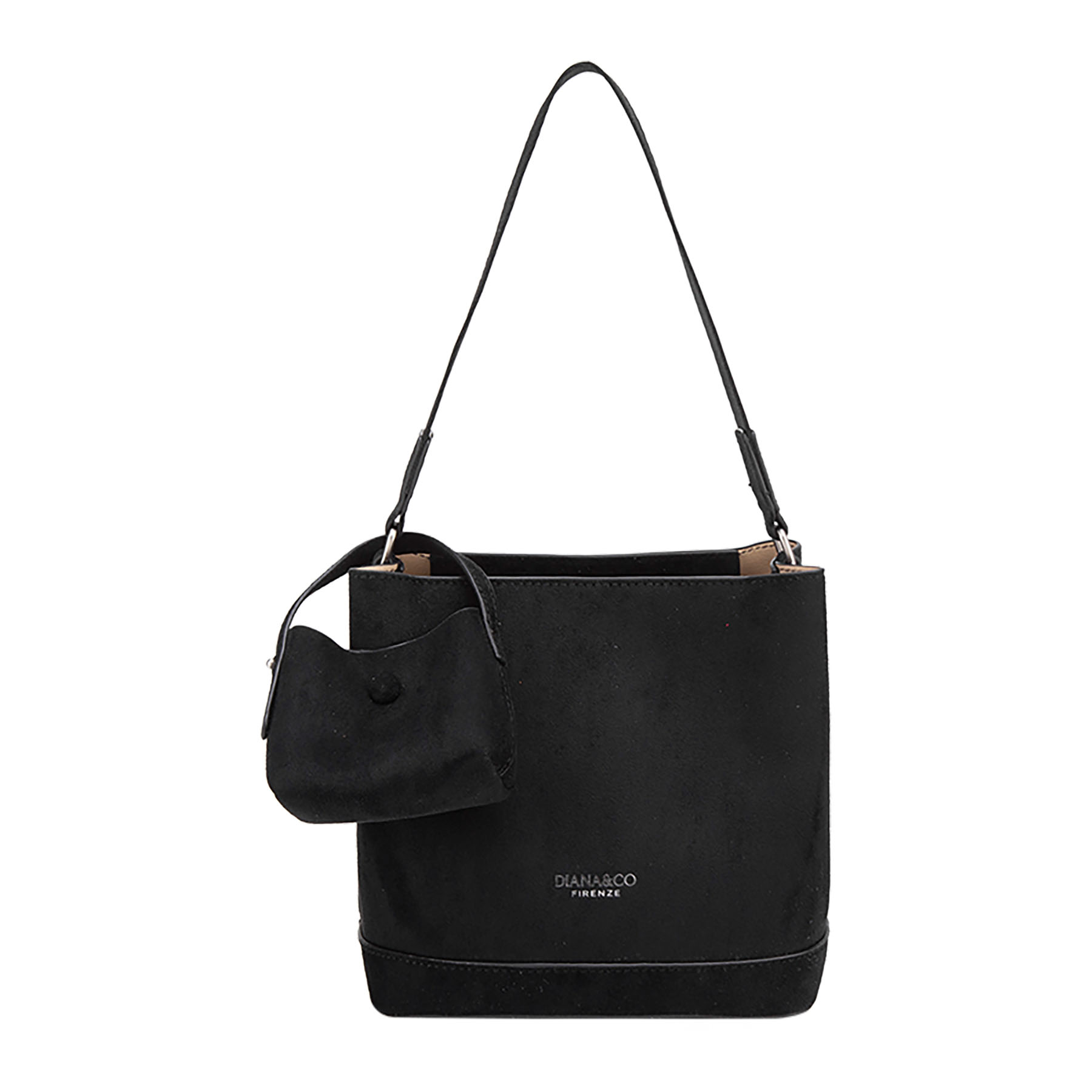 Elegante borsa a secchiello strutturata in effetto camoscio. Presenta un logo stampato sul davanti, cinturino a spalla coordinato e include una piccola pochette rimovibile coordinata in camoscio.