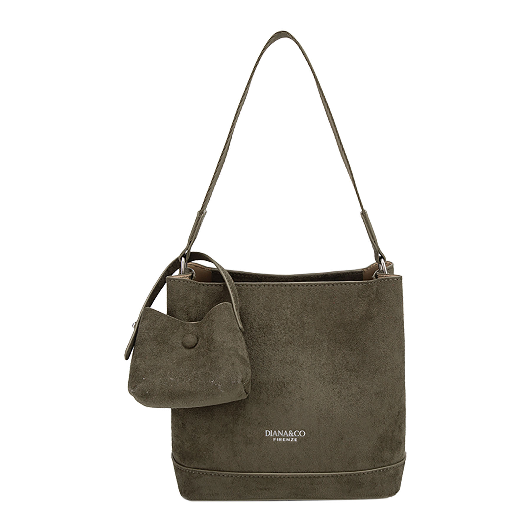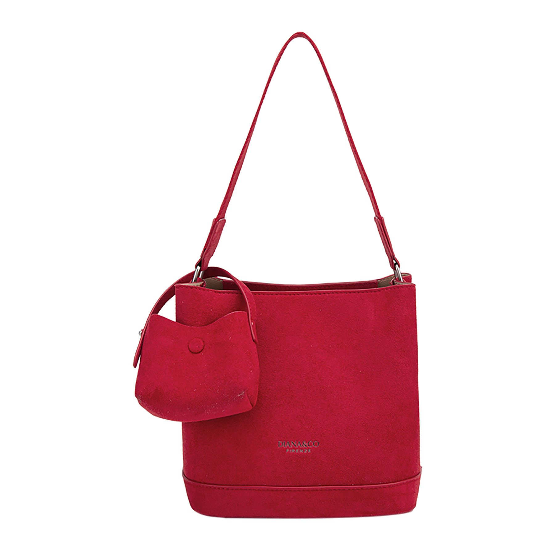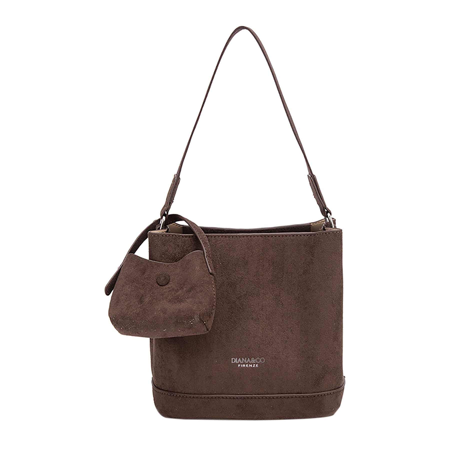 Elegante borsa a secchiello strutturata in effetto camoscio. Presenta un logo stampato sul davanti, cinturino a spalla coordinato e include una piccola pochette rimovibile coordinata in camoscio.