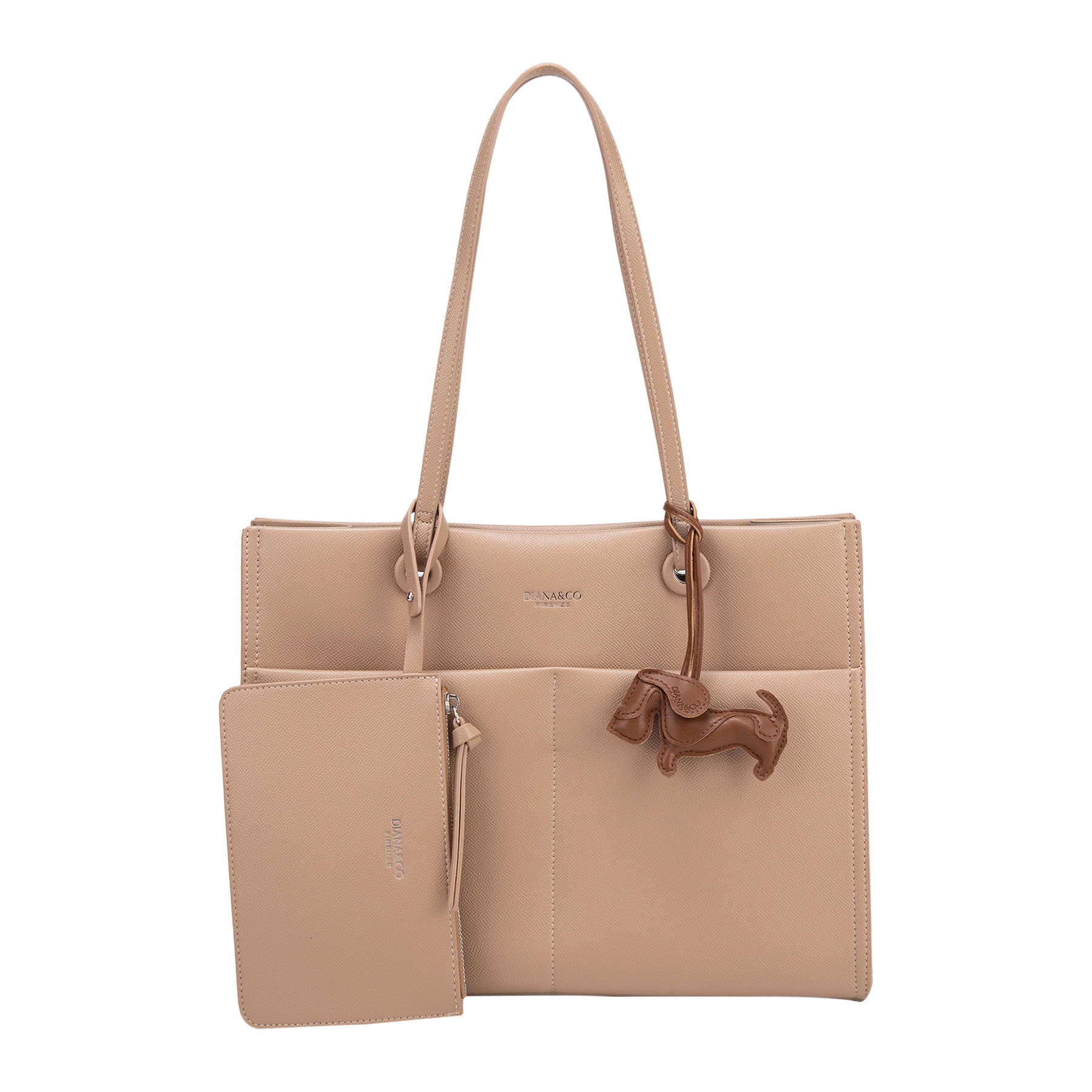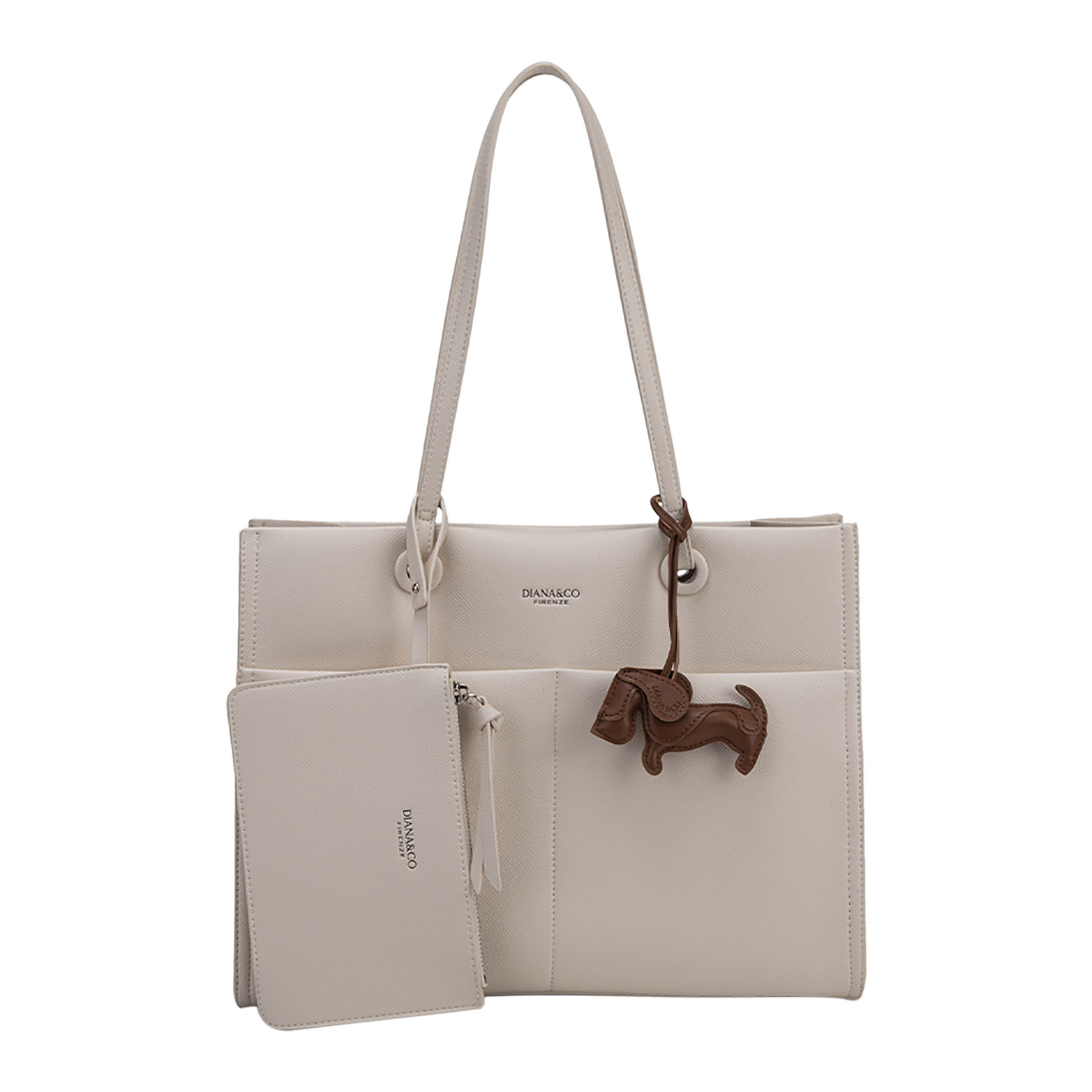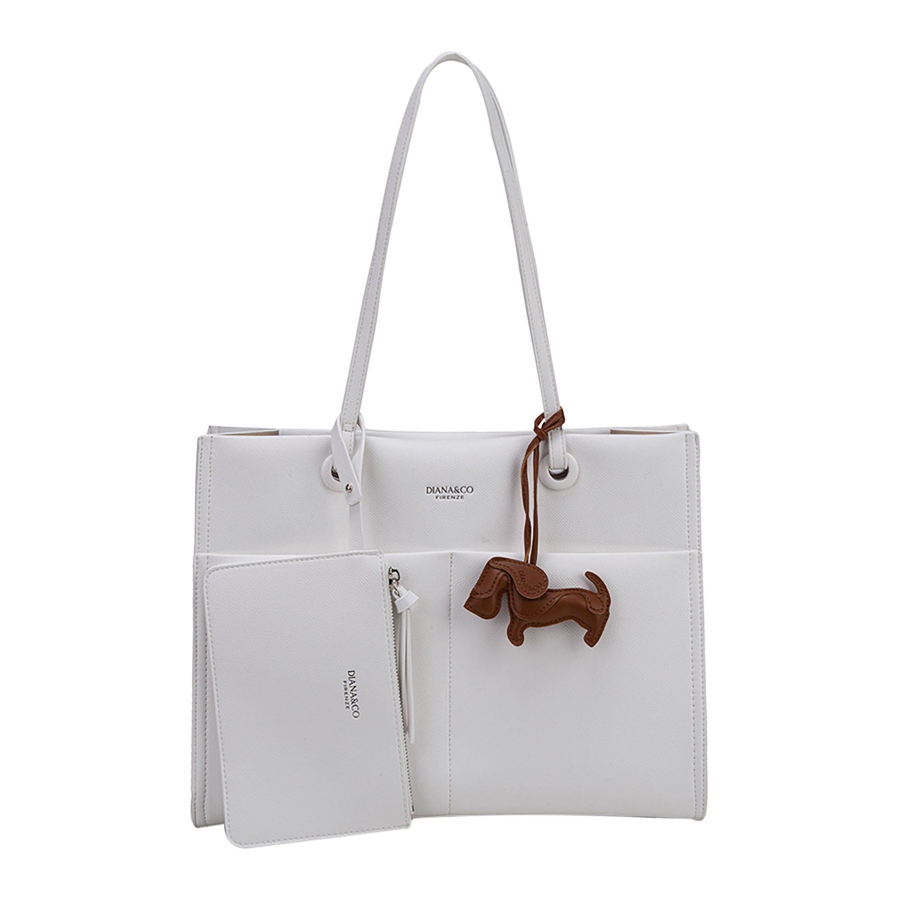 La borsa Diana&Co Firenze è una tote elegante e pratica, perfetta per l’uso quotidiano. Realizzata in materiale PU, presenta linee pulite, doppi manici comodi e un design capiente con tasche interne organizzate. Il dettaglio charm decorativo aggiunge un tocco di stile, mentre il piccolo pouch coordinato la rende ancora più funzionale.