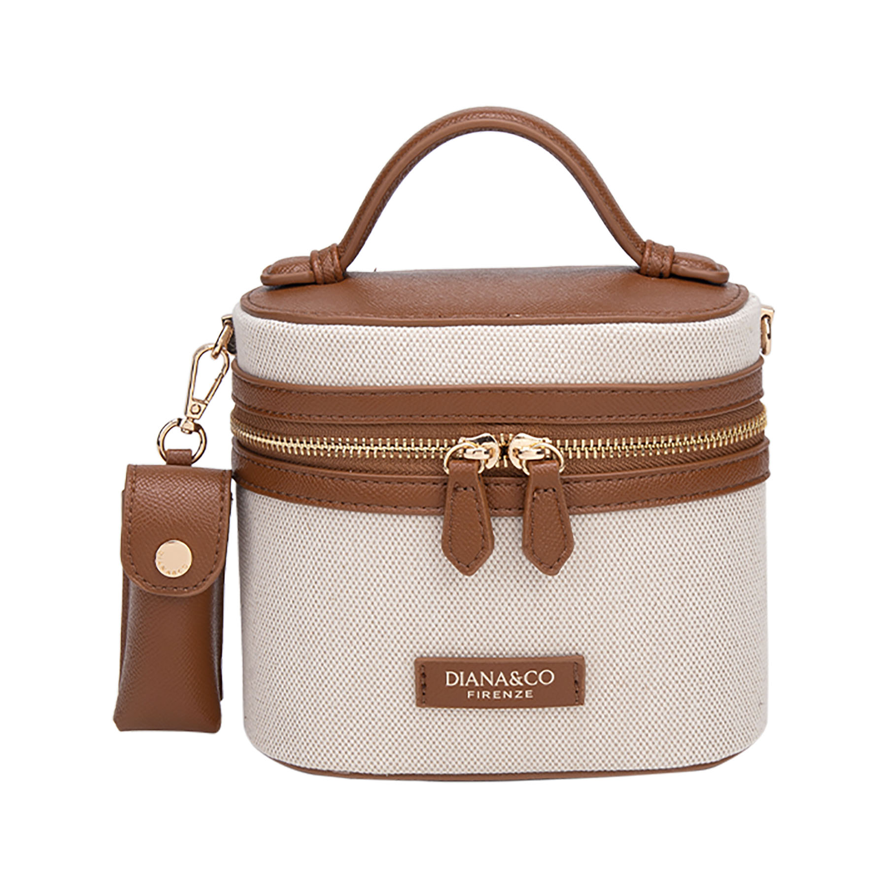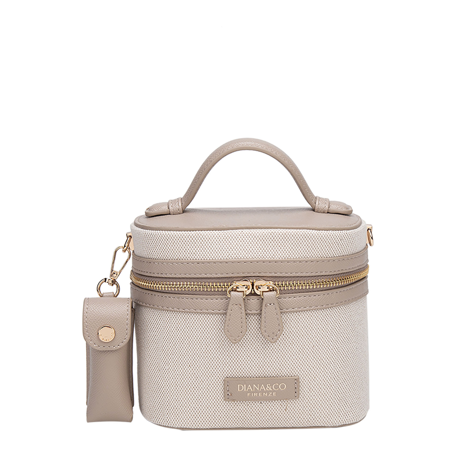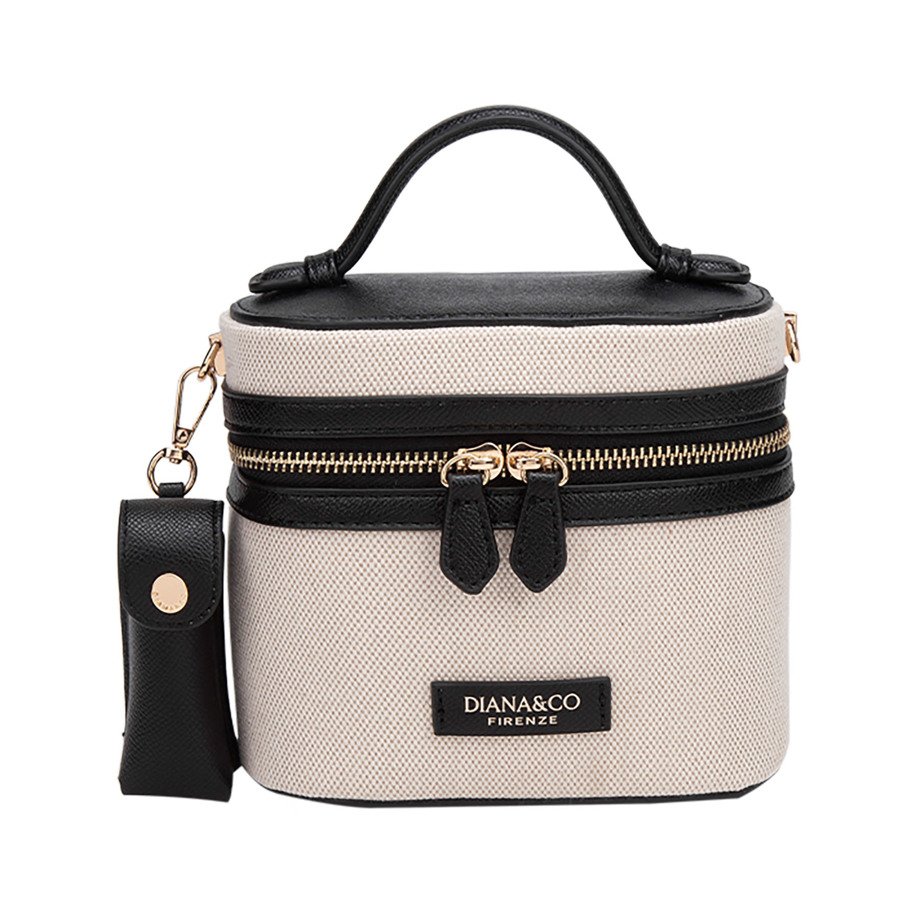 Vanity bag in canvas e similpelle con dettagli oro. Dal design rigido e compatto, include un esclusivo porta lipstick agganciato lateralmente per un tocco di stile unico.
