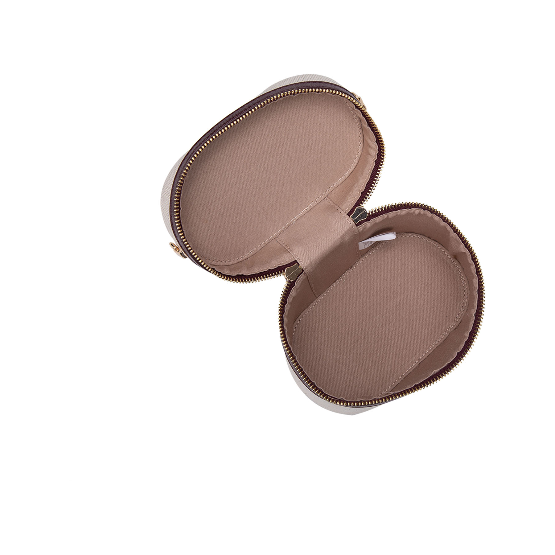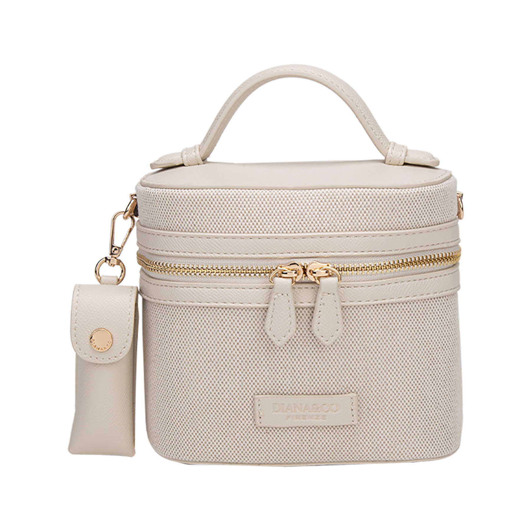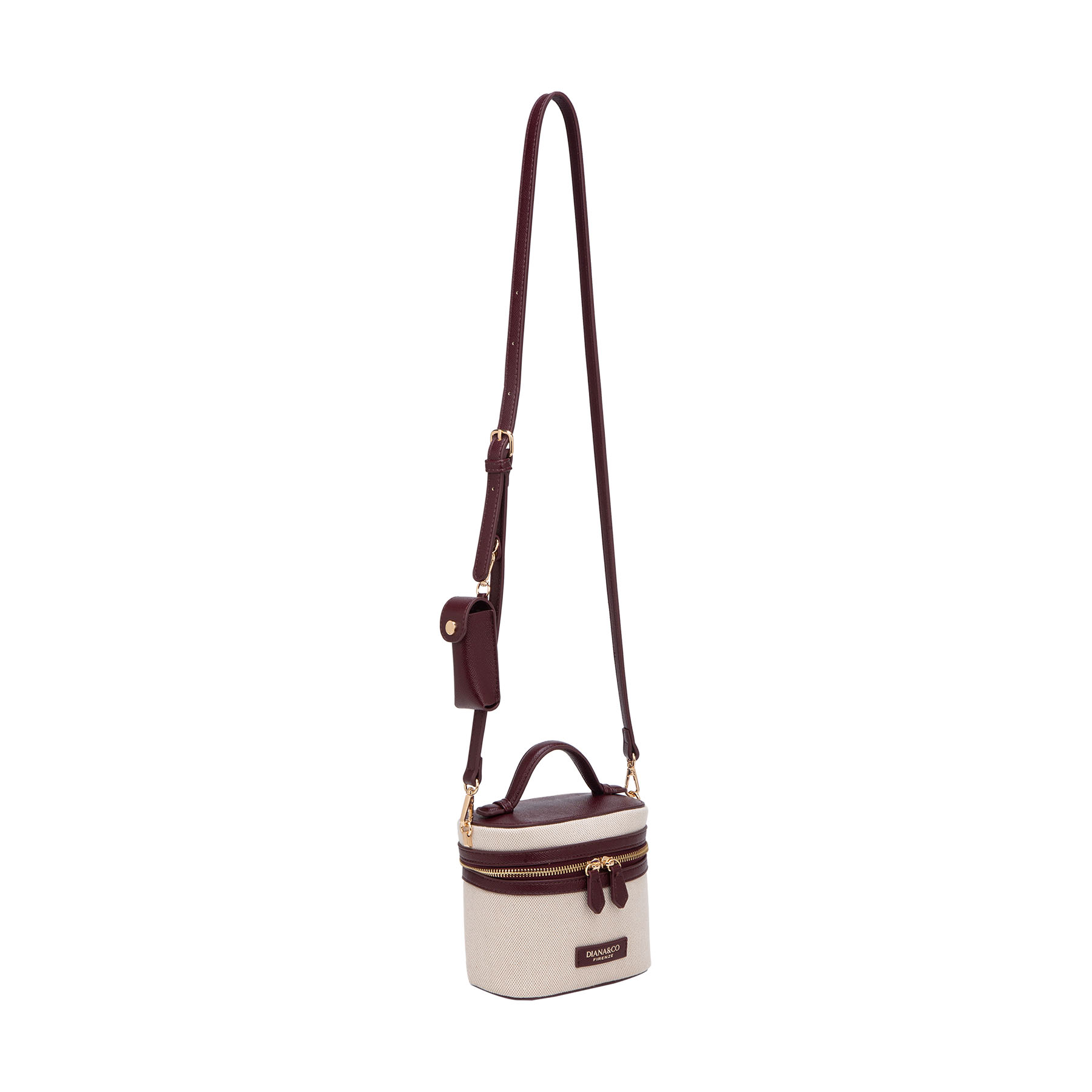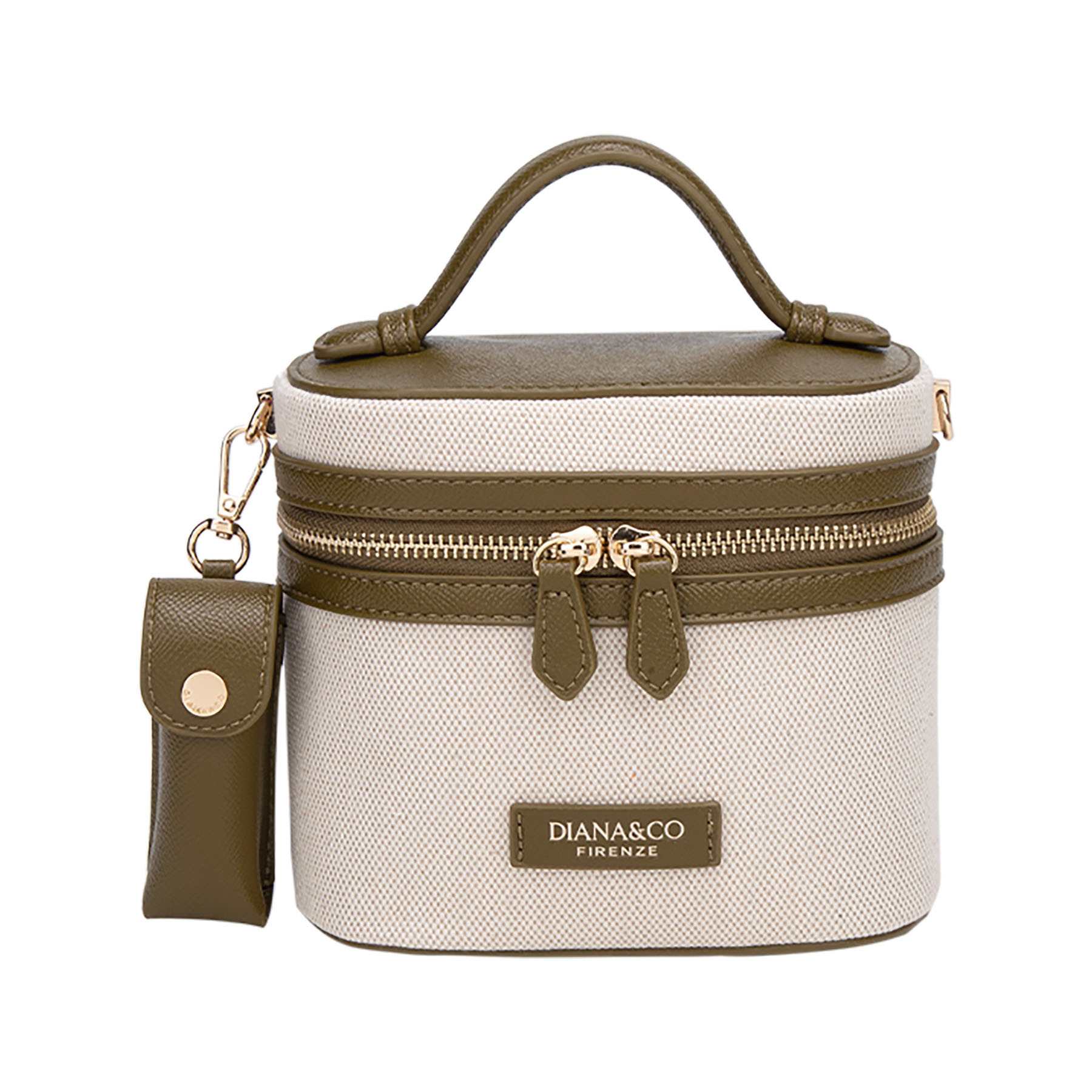 Vanity bag in canvas e similpelle con dettagli oro. Dal design rigido e compatto, include un esclusivo porta lipstick agganciato lateralmente per un tocco di stile unico.