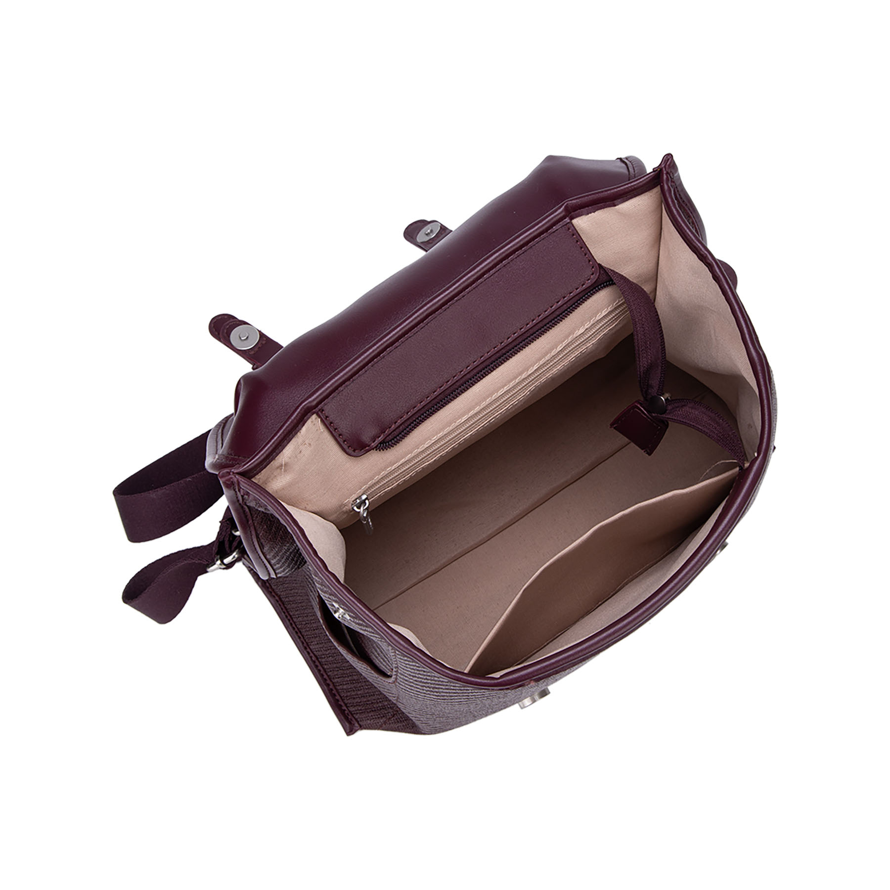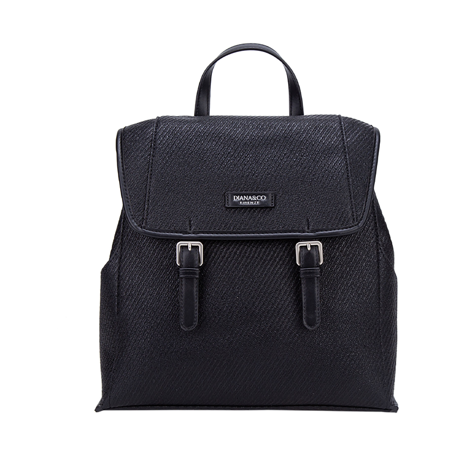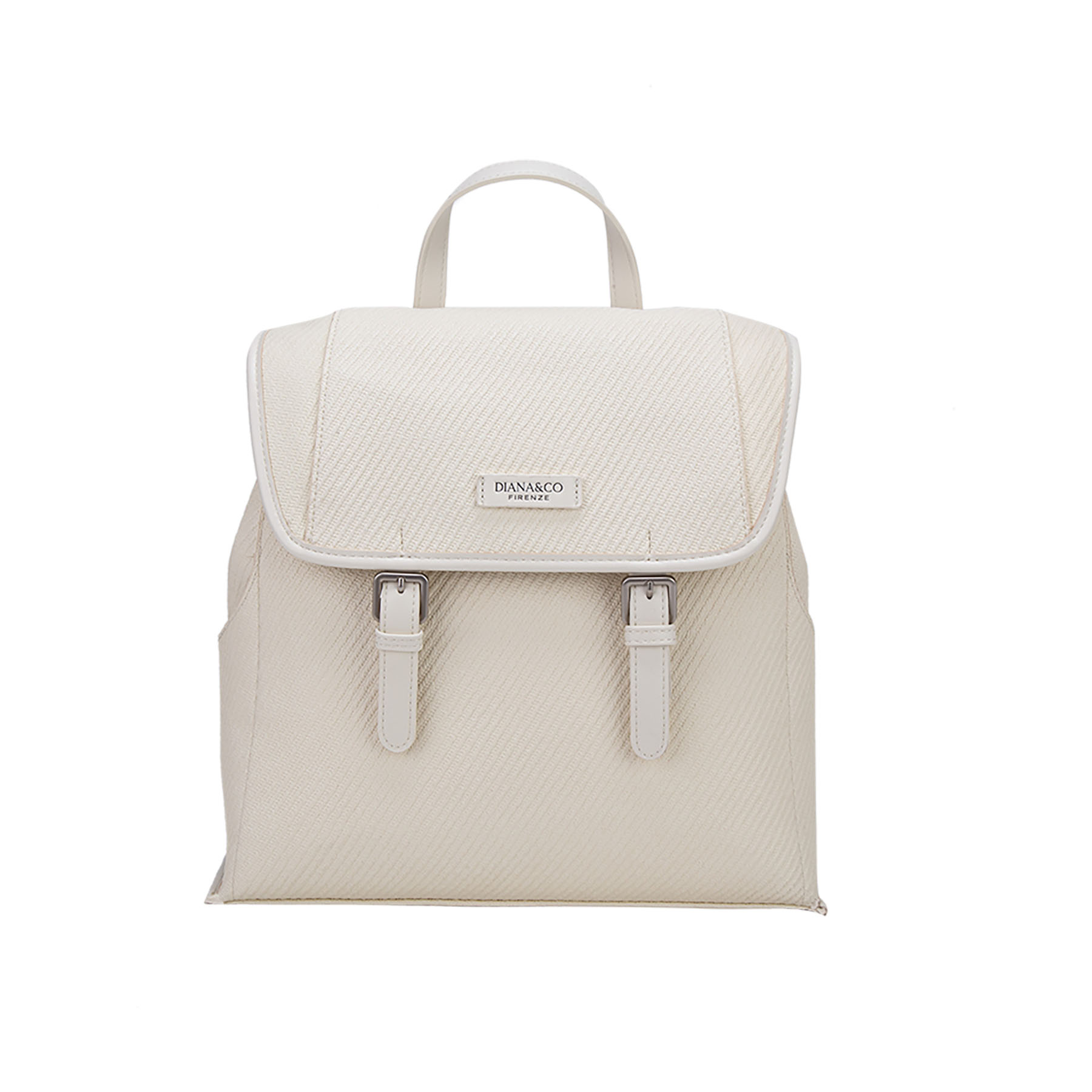 Zaino dal design strutturato in tessuto materico con dettagli in ecopelle. Patta frontale con cinturini, manico superiore e logo silver: un accessorio capiente e di tendenza.