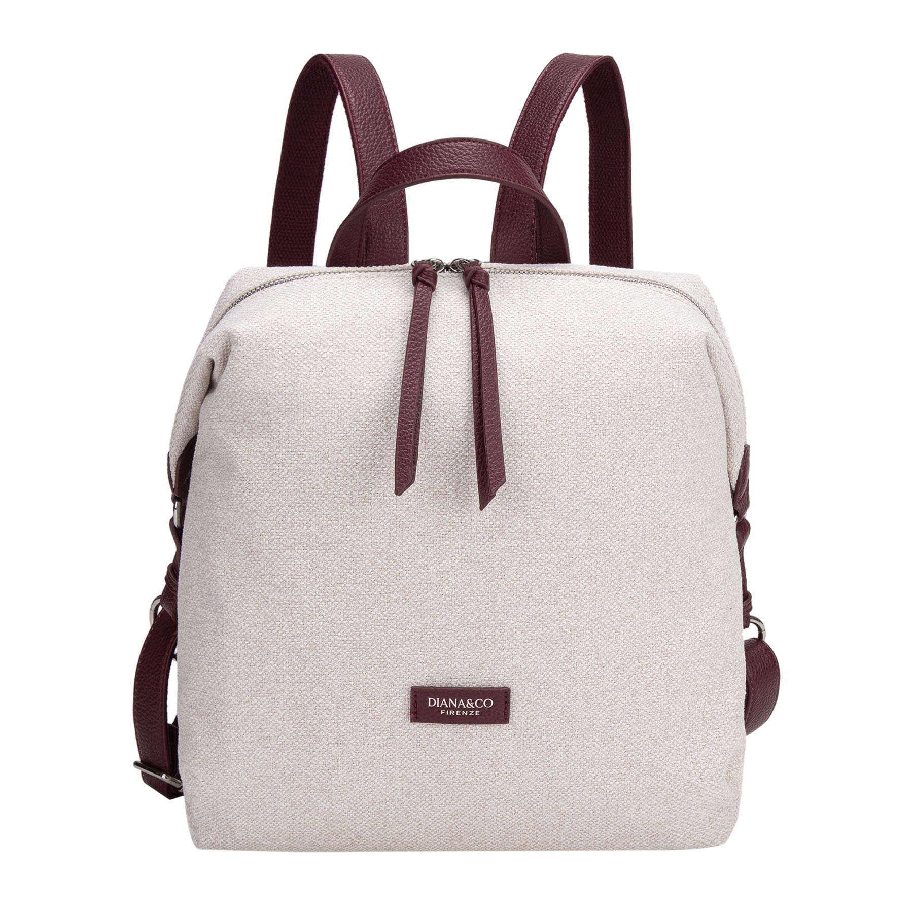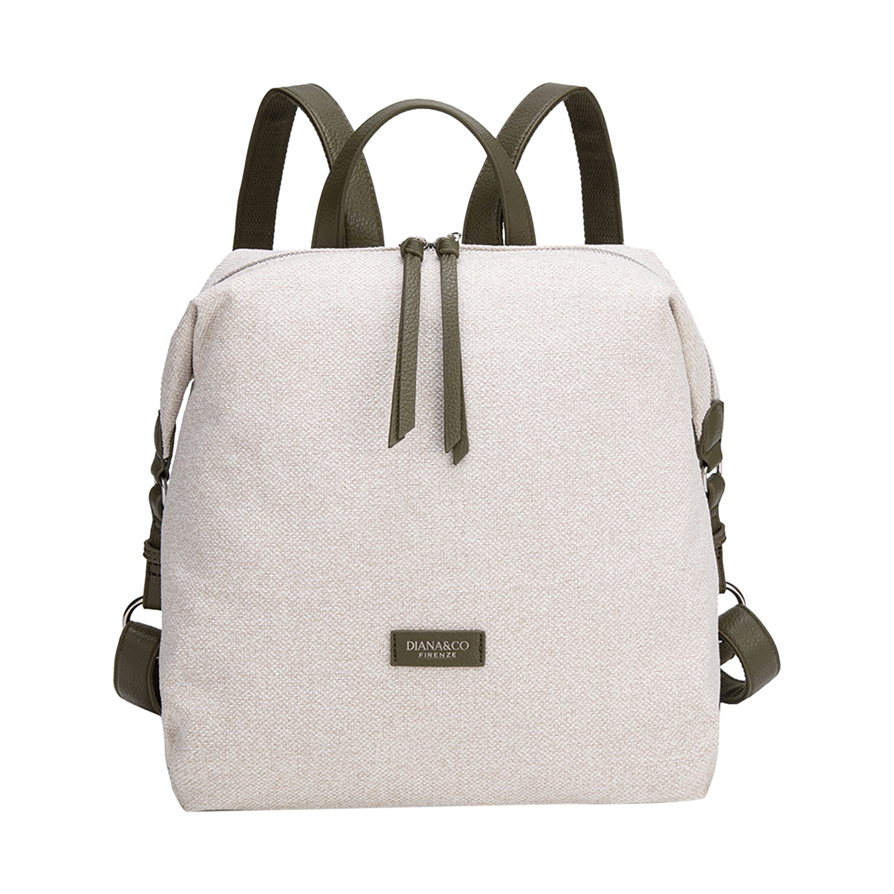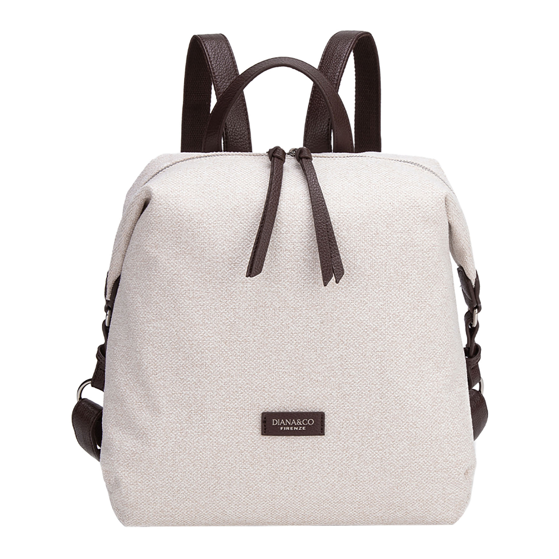 Zaino morbido in tessuto tramato. Presenta dettagli a contrasto in materiale effetto pelle (manico, spallacci e finiture), lunghi tirazip decorativi e logo frontale applicato.