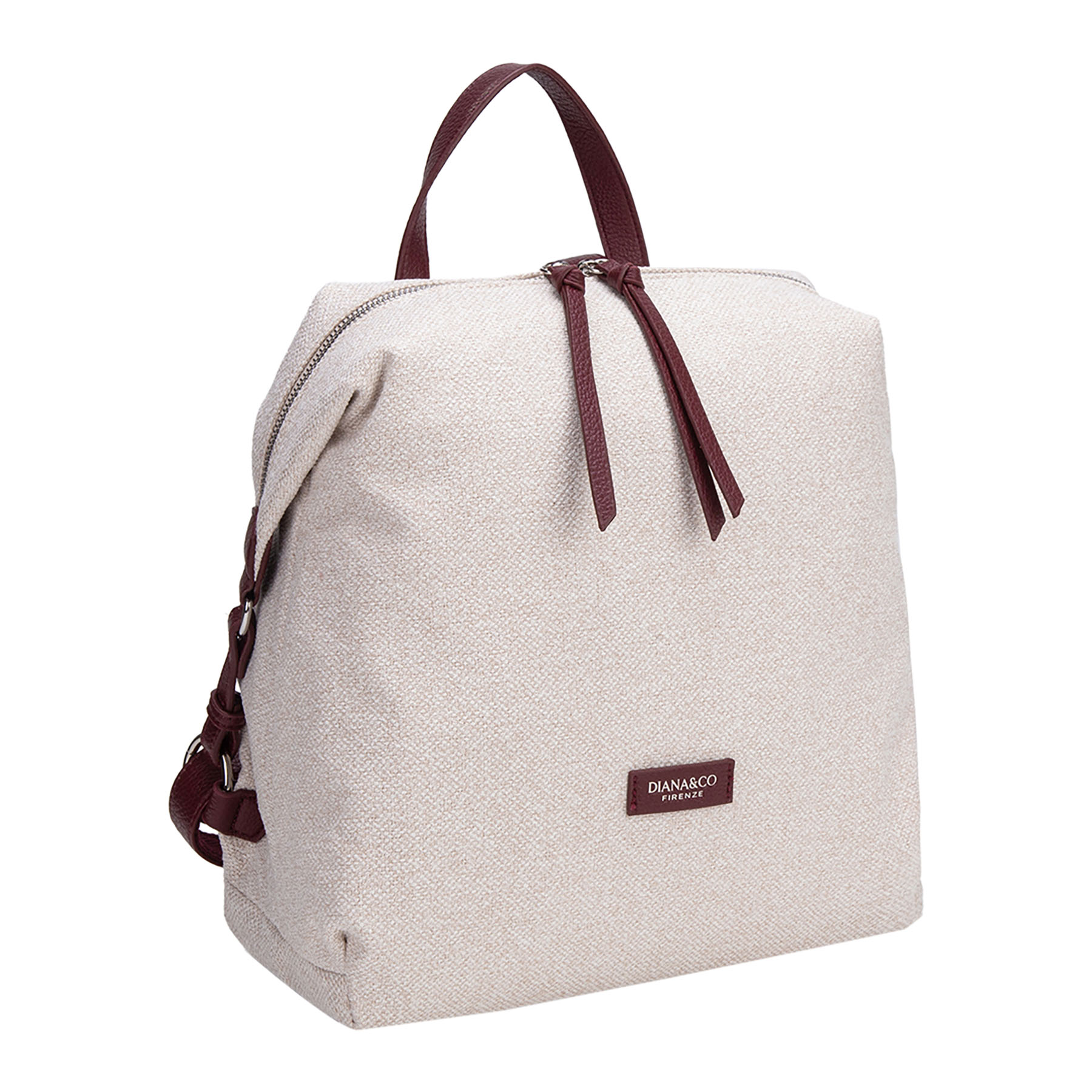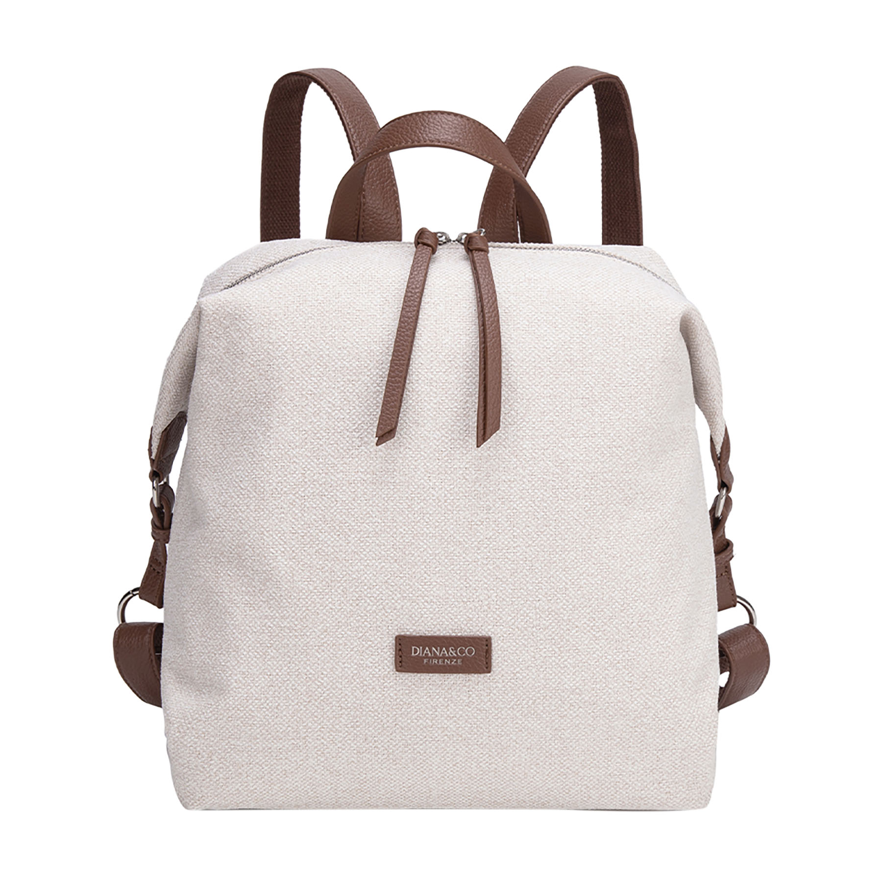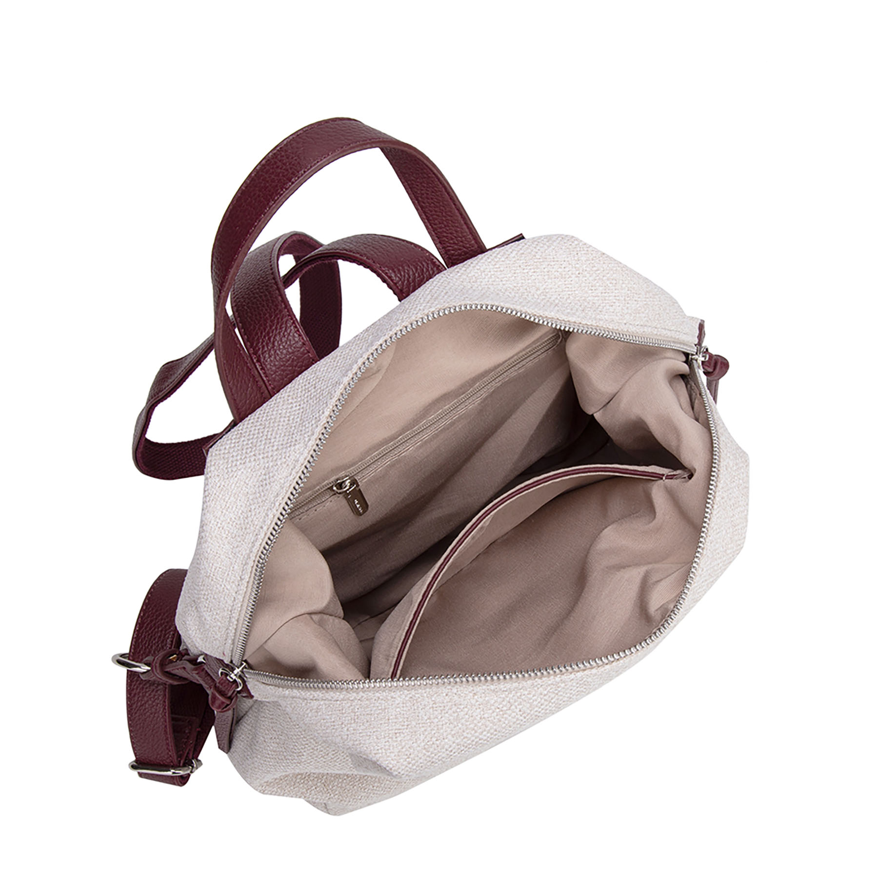 Zaino morbido in tessuto tramato. Presenta dettagli a contrasto in materiale effetto pelle (manico, spallacci e finiture), lunghi tirazip decorativi e logo frontale applicato.