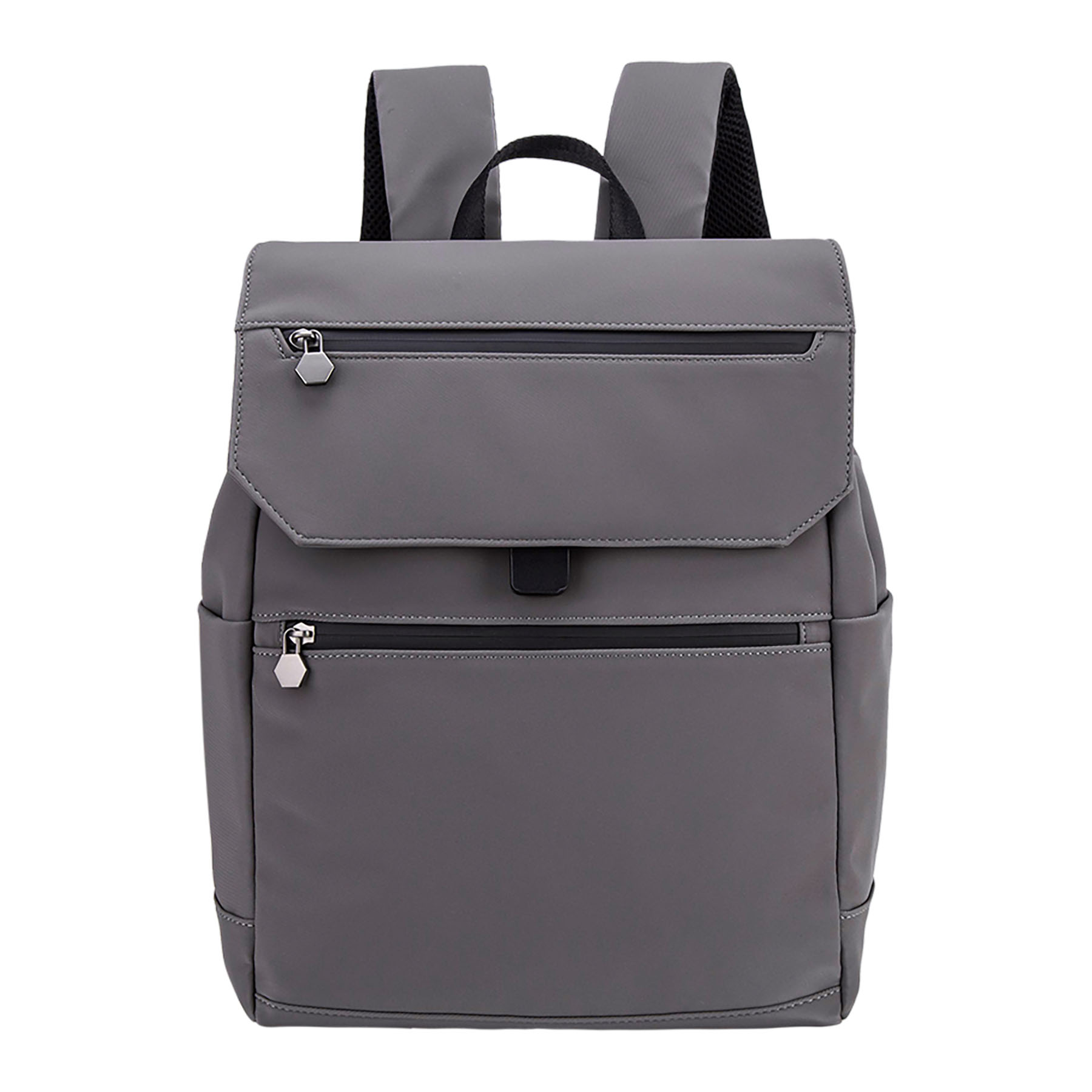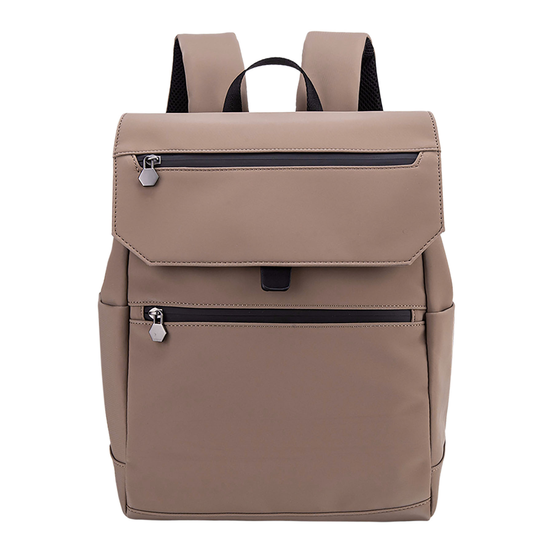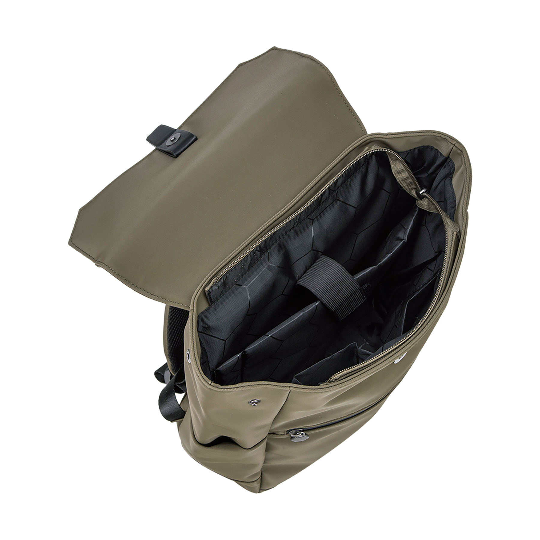 Zaino dal design squadrato in materiale liscio e opaco. Caratterizzato da una patta superiore e due tasche frontali con zip orizzontali (una sulla patta e una sul corpo centrale), rifinito con moderni tirazip geometrici in metallo scuro.