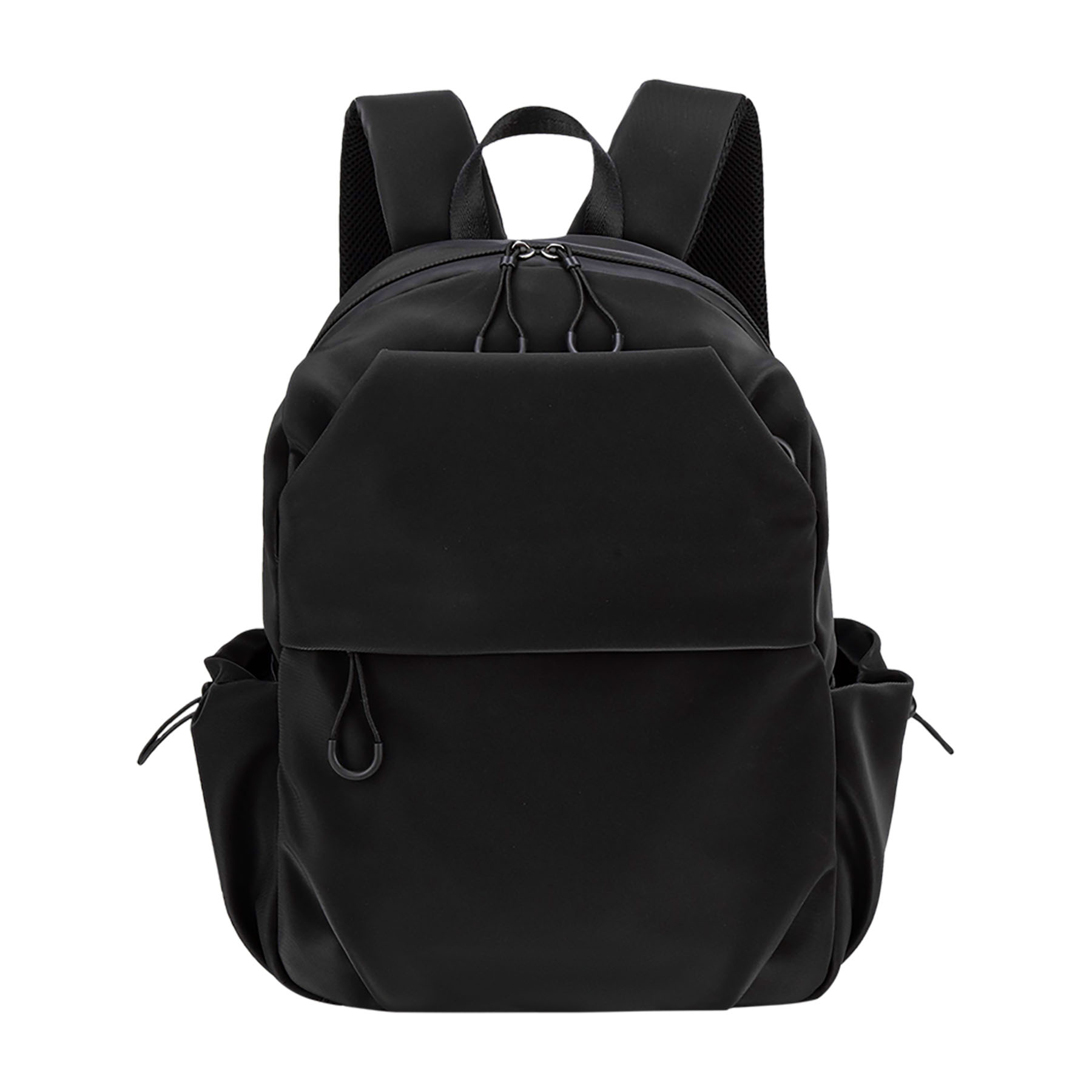 Zaino in materiale tecnico liscio. Design minimalista caratterizzato da tirazip ad anello, tasche laterali con chiusura a coulisse elastica e spallacci imbottiti in rete traspirante.