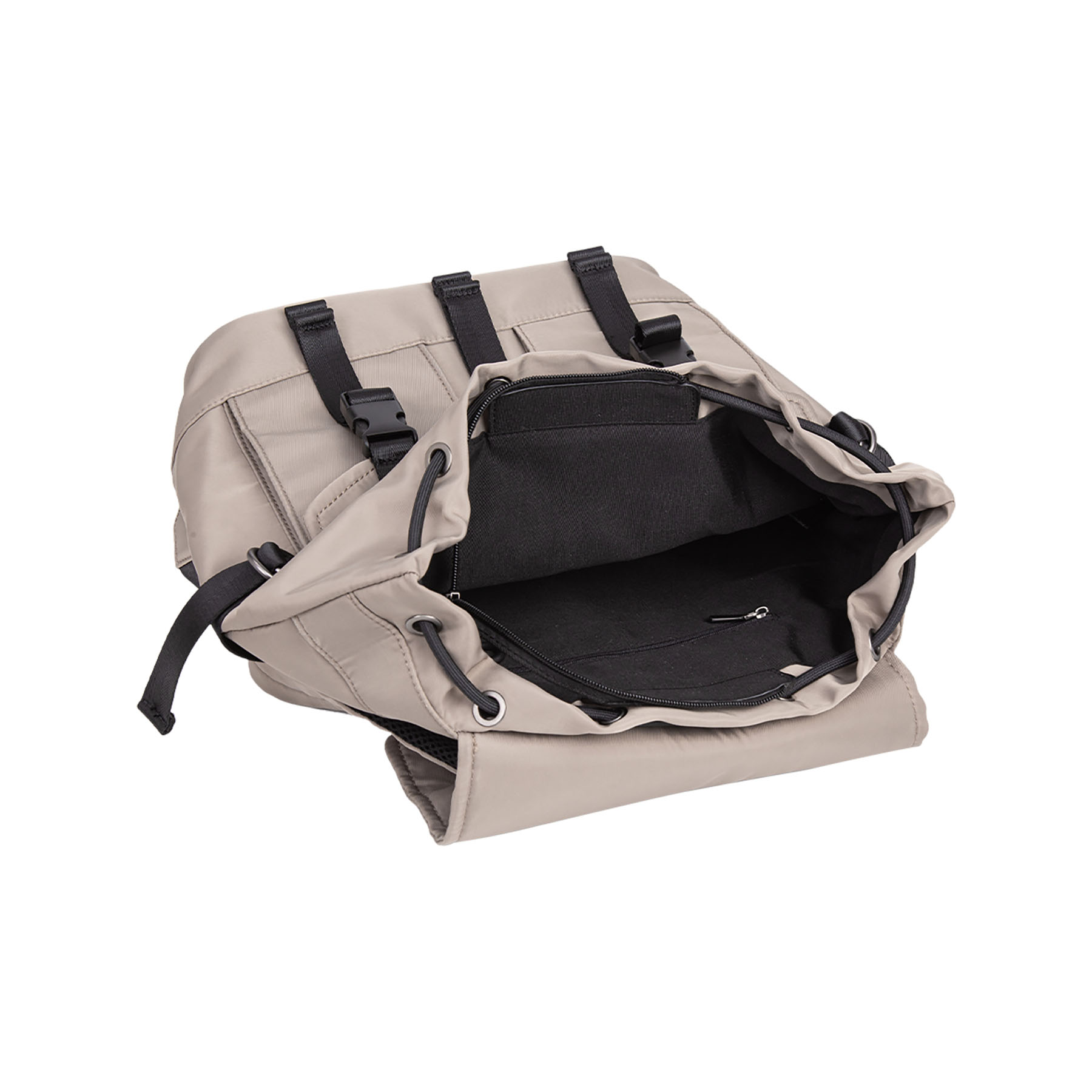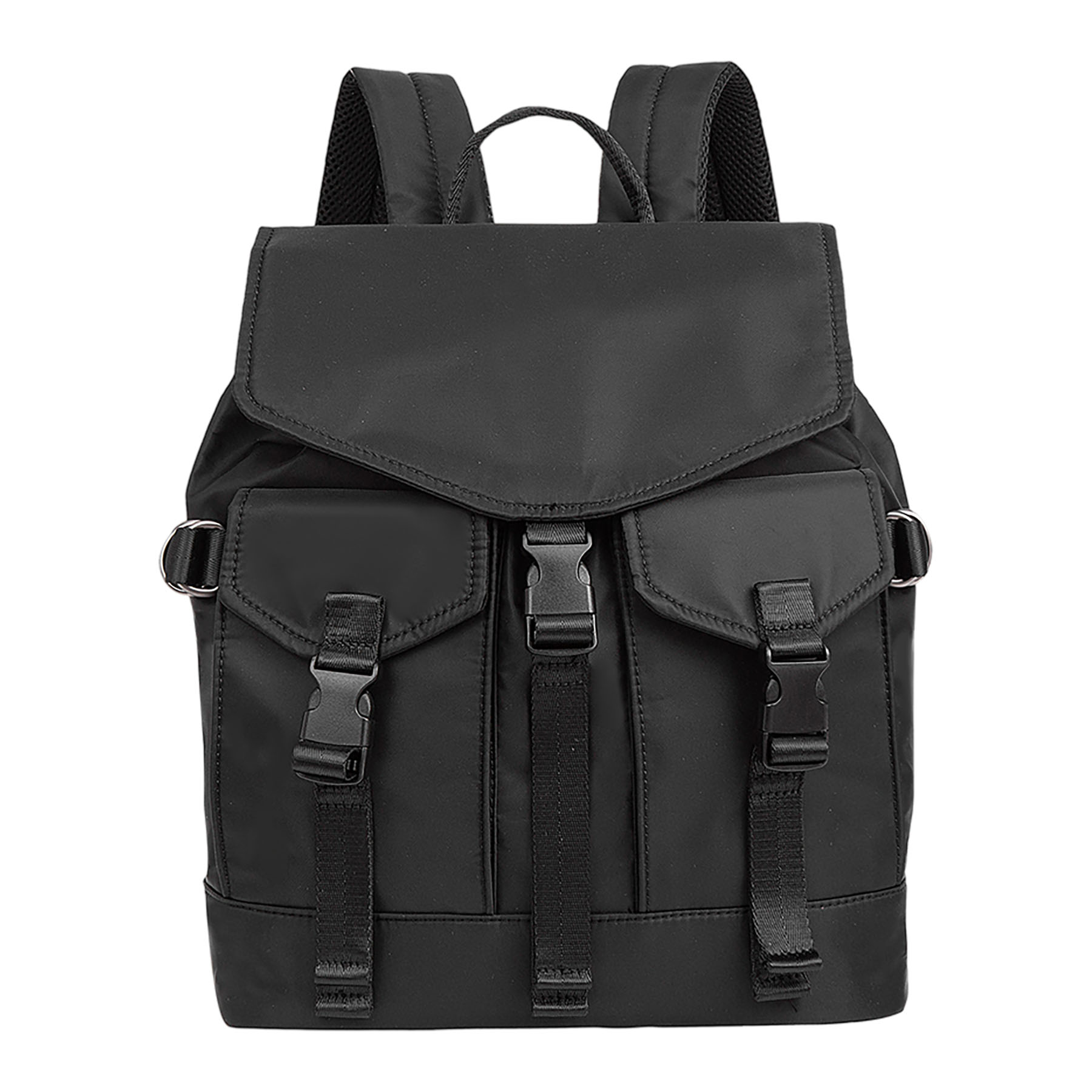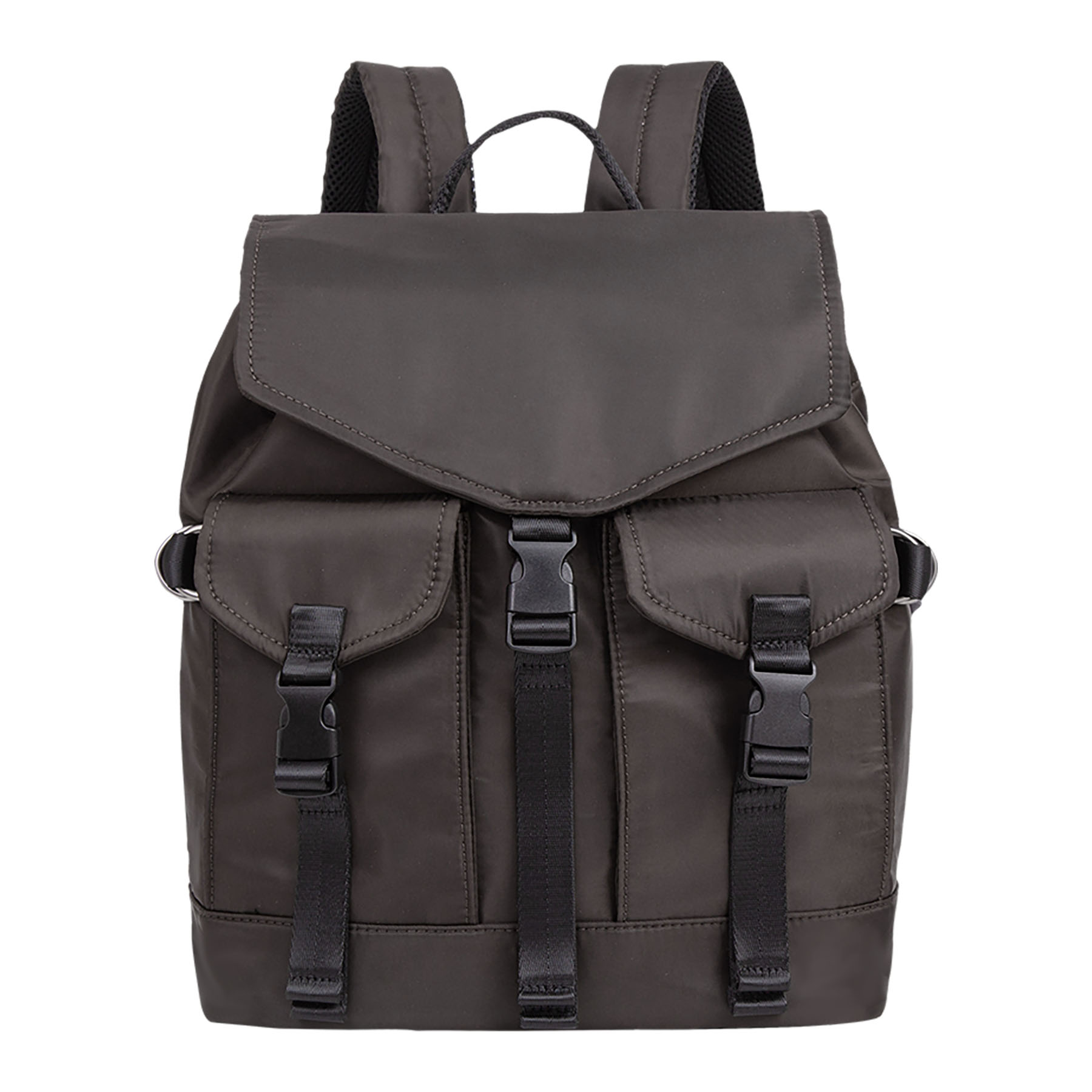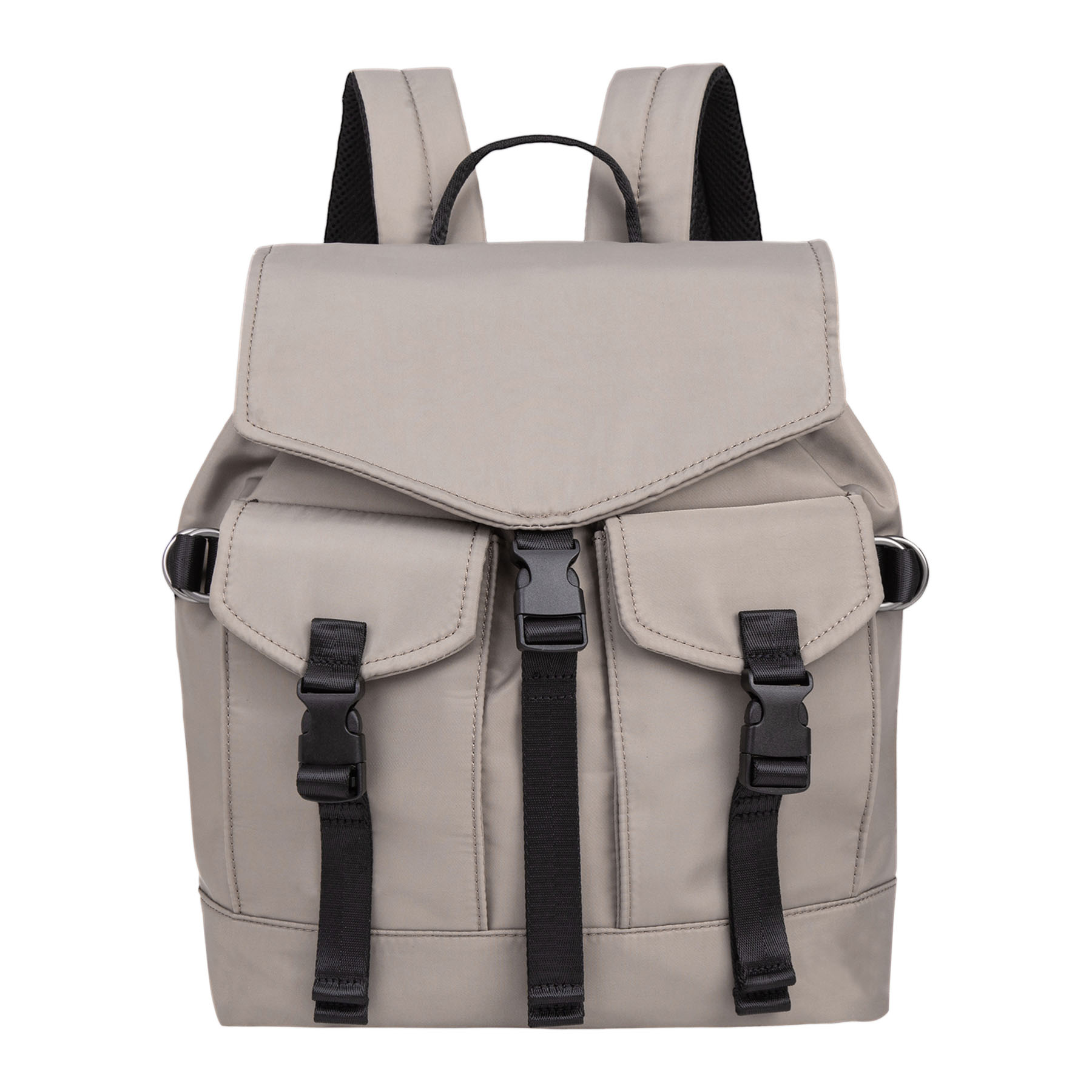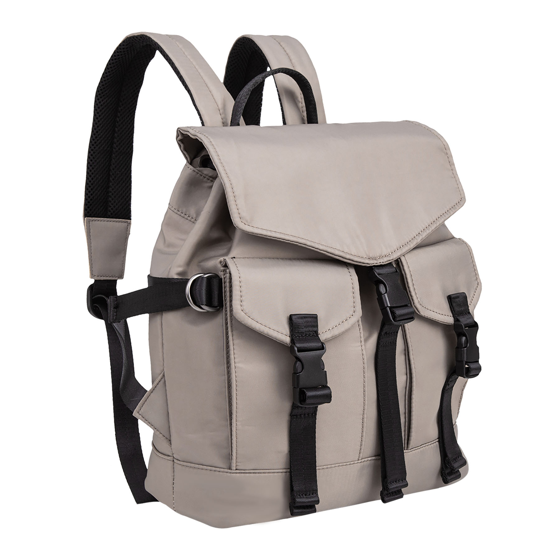 Zaino dallo stile casual “utility” in materiale liscio. Caratterizzato da chiusure funzionali con fibbie a scatto in plastica nera e nastri in tessuto, presenti sia sulla patta principale che sulle due tasche esterne frontali.